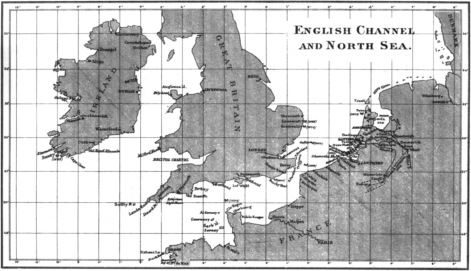 [245] The vital centre of English commerce is in the waters surrounding the British Islands; and as the United Kingdom now depends largely upon external sources of food-supply, it follows that France is the nation most favourably situated to harass it by commerce-destroying, on account of her nearness and her possession of ports both on the Atlantic and the North Sea. From these issued the privateers which in the past preyed upon English shipping. The position is stronger now than formerly, Cherbourg presenting a good Channel port which France lacked in the old wars. On the other hand steam and railroads have made the ports on the northern coasts of the United Kingdom more available, and British shipping need not, as formerly, focus about the Channel.