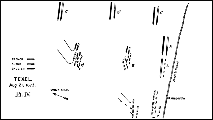 [210] The positions of the French ships captured are shown by a cross in each of the three successive stages of the battle, B, C, D.