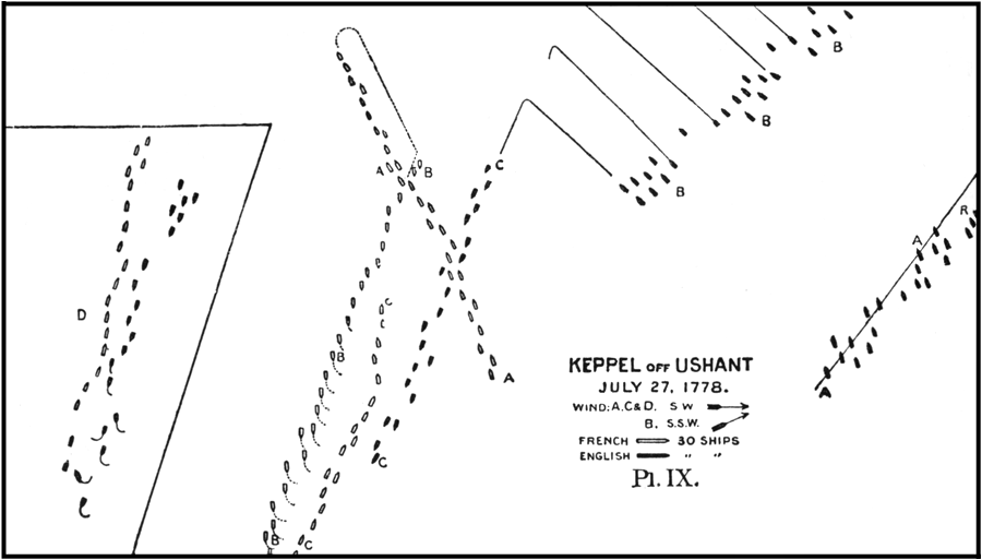 The defensive was necessarily accepted by England in 1778. It had been a maxim with the best English naval authorities of the preceding era, with Hawke and his contemporaries, that the British navy should be kept equal in numbers to the combined fleets of the Bourbon kingdoms,—a condition which, with the better quality of the personnel and the larger maritime population upon which it could draw, would have given a real superiority of force. This precaution, however, had not been observed during recent years. It is of no consequence to this discussion whether the failure was due to the inefficiency of the ministry, as was charged by their opponents, or to the misplaced economy often practised by representative [524]governments in time of peace. The fact remains that, notwithstanding the notorious probability of France and Spain joining in the war, the English navy was inferior in number to that of the allies. In what have been called the strategic features of the situation, the home bases, and the secondary bases abroad, the advantage upon the whole lay with her. Her positions, if not stronger in themselves, were at least better situated, geographically, for strategic effect; but in the second essential for war, the organized military force, or fleet, adequate to offensive operations, she had been allowed to become inferior. It only remained, therefore, to use this inferior force with such science and vigor as would frustrate the designs of the enemy, by getting first to sea, taking positions skilfully, anticipating their combinations by greater quickness of movement, harassing their communications with their objectives, and meeting the principal divisions of the enemy with superior forces.