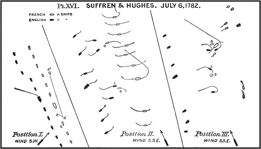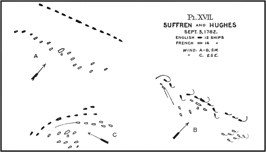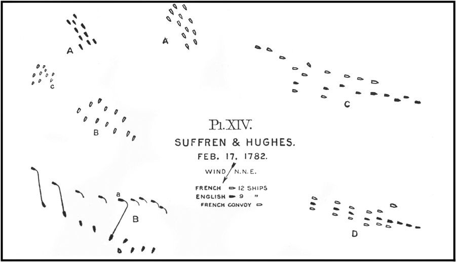 The distance from Europe to America was not such as to make intermediate ports of supply absolutely necessary; while if difficulty did arise from an unforeseen cause, it was always possible, barring meeting an enemy, either to return to Europe or to make a friendly port in the West Indies. The case was different with the long voyage to India by the Cape of Good Hope. Bickerton, leaving England with a convoy in February, was thought to have done well in reaching Bombay the following September; while the ardent Suffren, sailing in March, took an equal time to reach Mauritius, whence the passage to Madras consumed two months more. A voyage of such duration could rarely be made without a stop for water, for fresh provision, often for such refitting as called for the quiet of a harbor, even when the stores on board furnished the necessary material. A perfect line of communications required, as has been said, several such harbors, properly spaced, adequately defended, and with abundant supplies, such as England in the present day holds on some of her main commercial routes, acquisitions of her past wars. In the war of 1778 none of the belligerents had such ports on this route, until by the accession of Holland, the Cape of Good Hope was put at the disposal of the French and suitably strengthened by Suffren. With this and the Mauritius on the way, and Trincomalee at the far end of the road, the communications of the allies with France were reasonably guarded. England, though then holding St. Helena, depended, for the refreshment and refitting of her India-bound squadrons and convoys in the Atlantic, upon the [521]benevolent neutrality of Portugal, extended in the islands of Madeira and Cape Verde and in the Brazilian ports. This neutrality was indeed a frail reliance for defence, as was shown by the encounter between Johnstone and Suffren at the Cape Verde; but there being several possible stopping-places, and the enemy unable to know which, if any, would be used, this ignorance itself conferred no small security, if the naval commander did not trust it to the neglect of proper disposition of his own force, as did Johnstone at Porto Praya. Indeed, with the delay and uncertainty which then characterized the transmission of intelligence from one point to another, doubt where to find the enemy was a greater bar to offensive enterprises than the often slight defences of a colonial port.