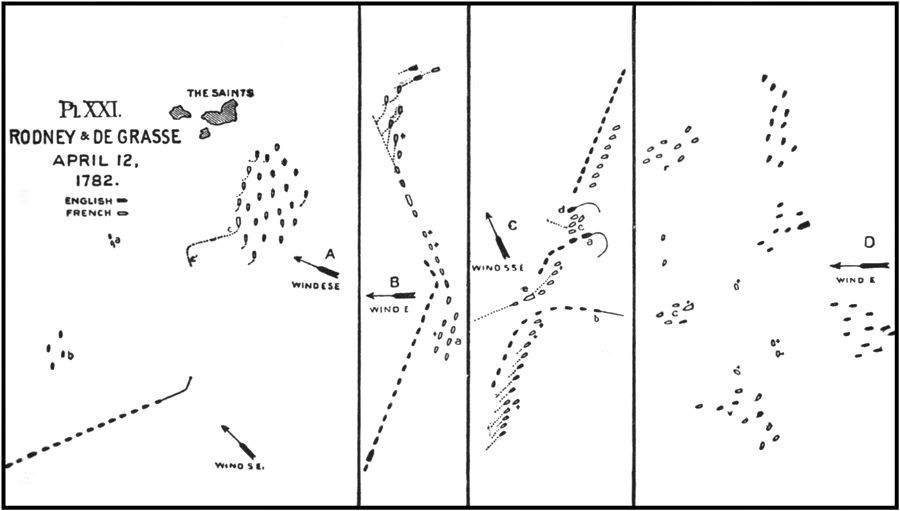 [206] The account of the transactions from April 9 to April 12 is based mainly upon the contemporary plates and descriptions of Lieutenant Matthews, R.N., and the much later "Naval Researches" of Capt. Thomas White, also of the British Navy, who were eye-witnesses, both being checked by French and other English narratives. Matthews and White are at variance with Rodney's official report as to the tack on which the English were at daybreak; but the latter is explicitly confirmed by private letters of Sir Charles Douglas, sent immediately after the battle to prominent persons, and is followed in the text.