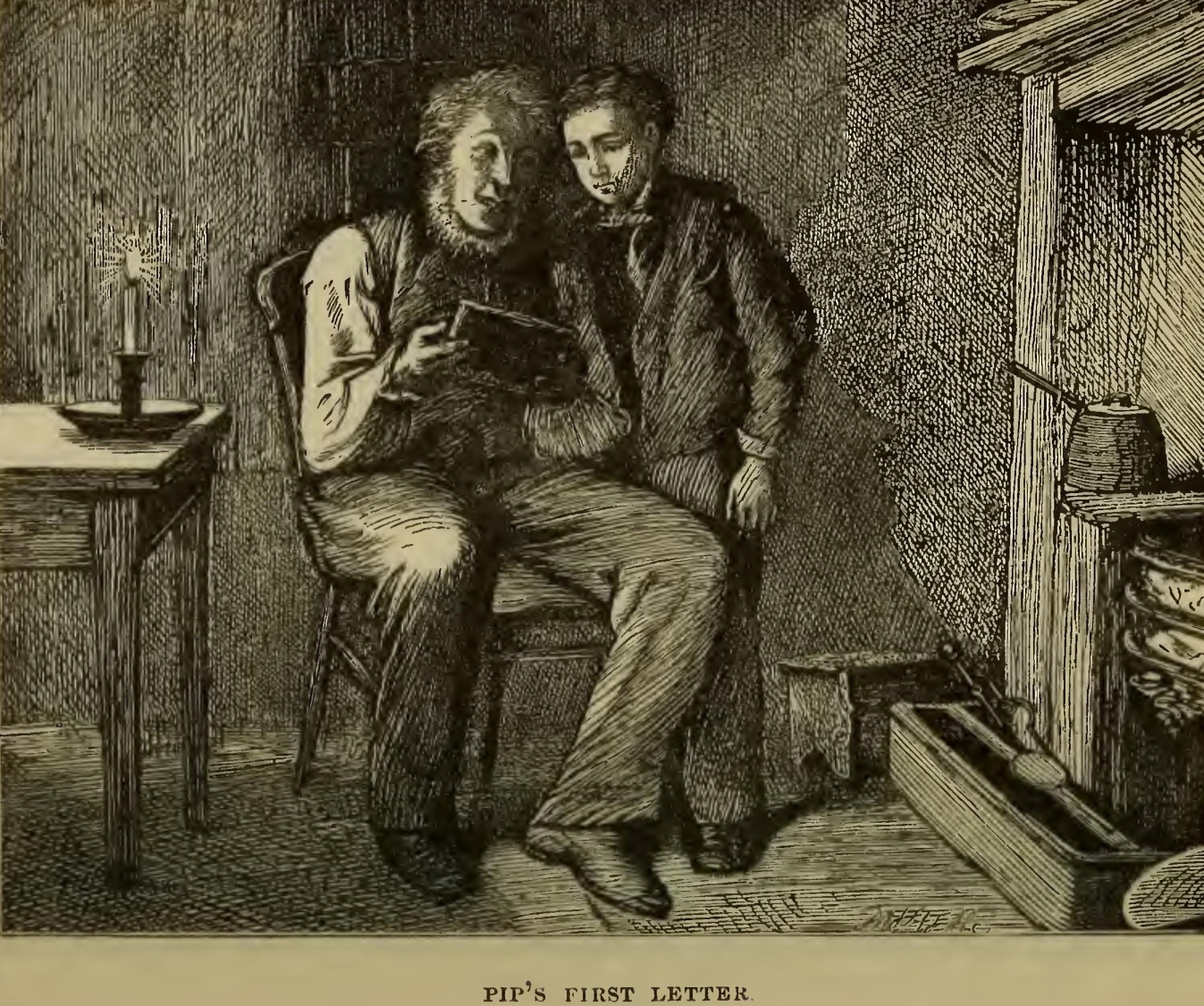 For eleven years, I had not seen Joe nor Biddy with my bodily eyes,—though they had both been often before my fancy in the East,—when, upon an evening in December, an hour or two after dark, I laid my hand softly on the latch of the old kitchen door. I touched it so softly that I was not heard, and looked in unseen. There, smoking his pipe in the old place by the kitchen firelight, as hale and as strong as ever, though a little grey, sat Joe; and there, fenced into the corner with Joe’s leg, and sitting on my own little stool looking at the fire, was—I again!