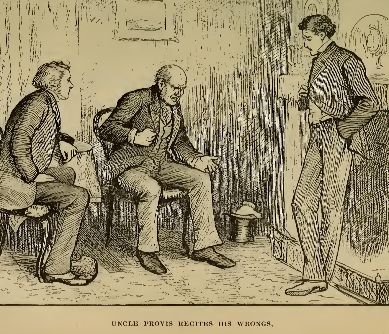 “This is him,” said Pumblechook, “as I have rode in my shay-cart. This is him as I have seen brought up by hand. This is him untoe the sister of which I was uncle by marriage, as her name was Georgiana M’ria from her own mother, let him deny it if he can!”