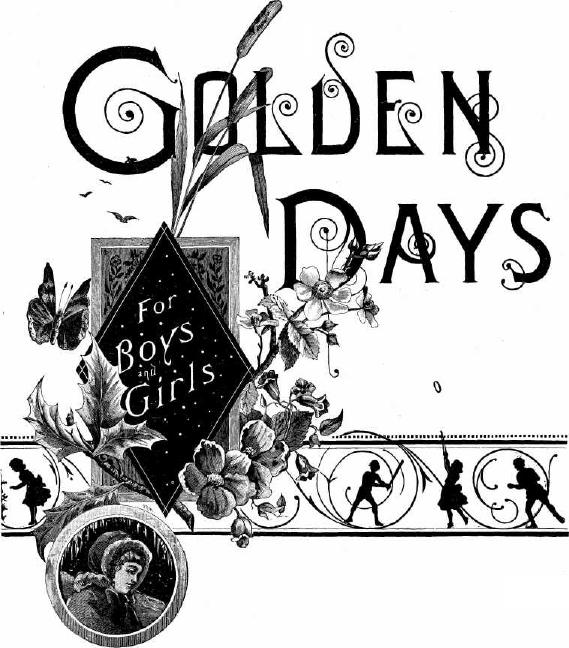 Heavy, embossed cloth covers, with flexible back. Golden Days stamped in gold letters on the outside. Full directions for inserting papers go with each Binder. We will send the HANDY BINDER and a package of Binder Pins to any address on receipt of 50 cents. Every reader should have one. Address JAMES ELVERSON, Philadelphia, Pa. From the Buckeye Vidette, Salem, Ohio. Golden Days.—This deservedly popular paper begins the autumn ripe with golden fruit. Its stories and miscellany are rare gems of interest, being instructive and pure, and it completely accomplishes the delicate task of satisfying a boy's taste for adventure without being sensational. The pictures are handsomely executed. A Sunday-school lesson each week by Rev. Dr. Strobridge. Its articles on scientific subjects are of the best, its short stories good, and, in fact, it is a masterly combination of useful and fascinating literature. From the Marietta Times, Marietta, Pa. The monthly part of Golden Days is, as usual, replete with healthful and interesting reading, in the shape of instalments of several captivating serials by popular authors, short stories, natural history papers, practical papers, Sunday-school lessons, poetry, puzzles, etc., profusely illustrated. James Elverson, publisher, Philadelphia. |