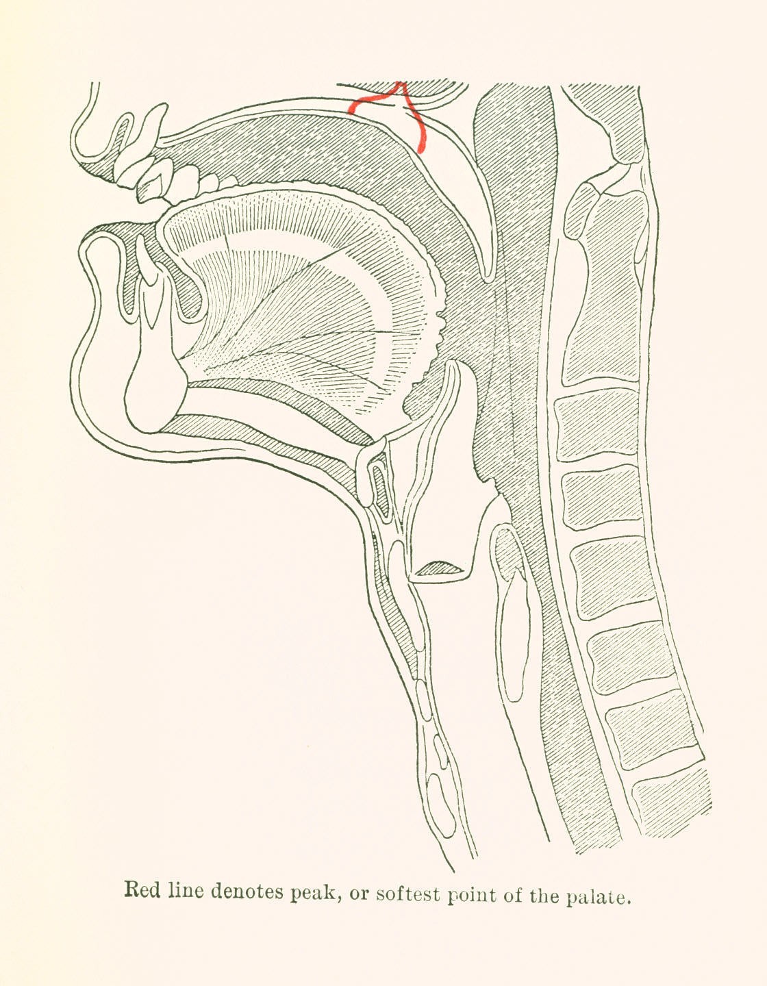 but must be nasally modified above, and tied; and because the breath must flow out unceasingly in a powerful stream from the vocal cords, an h can only be put in beneath, which makes us sure of this powerful streaming out of the breath, and helps only the[Pg 249] branch stream of breath into the cavities of the head. Often singers hold the breath, concentrated on the nasal form, firmly on the lowest tone of a figure, and, without interrupting this nasal form, or the head tones, that is, the breath vibrating in the head cavities, finish the figure alone. When this happens the muscular contractions of the throat, tongue, and palate are very strong.