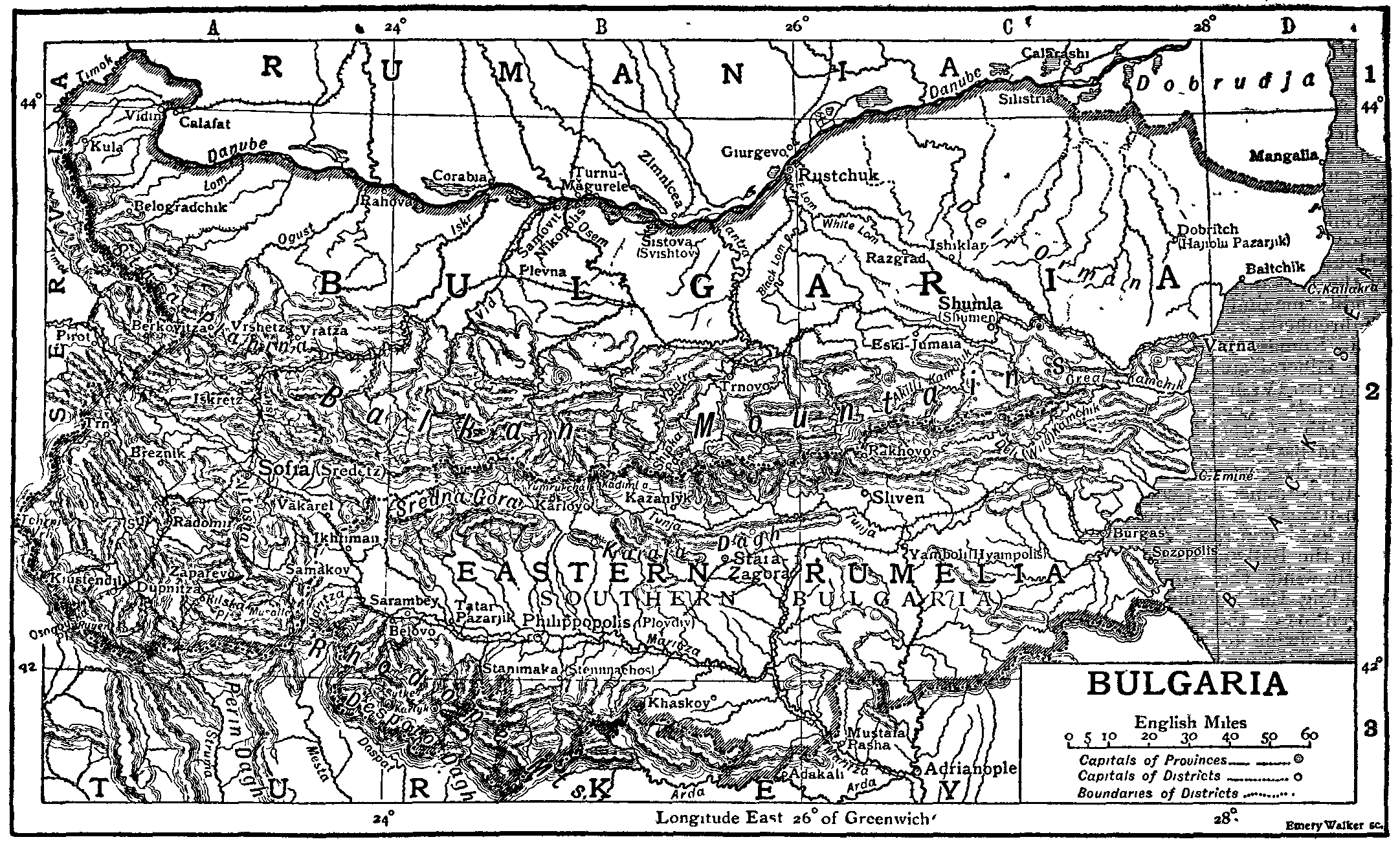 ... the mean interval being 60 m.; the summits are, as a rule, rounded, and the slopes gentle. The culminating points are in the centre of the range: Yumrukchál (7835 ft.), Maragudúk (7808 ft.), and Kadimlía (7464 ft.). The Balkans are known to the people of the country as the Stara Planina or "Old Mountain," the adjective denoting their greater size as compared with that of the adjacent ranges: "Balkán" is not a distinctive term, being applied by the Bulgarians, as well as the Turks, to all mountains. Closely parallel, on the south, are the minor ranges of the Sredna Gora or "Middle Mountains" (highest summit 5167 ft.) and the Karaja Dagh, enclosing respectively the sheltered valleys of Karlovo and Kazanlyk. At its eastern extremity the Balkan chain divides into three ridges, the central terminating in the Black Sea at Cape Eminé ("Haemus"), the northern forming the watershed between the tributaries of the Danube and the rivers falling directly into the Black Sea. The Rhodope, or southern group, is altogether distinct from the Balkans, with which, however, it is connected by the Malka Planina and the Ikhtiman hills, respectively west and east of Sofia; it may be regarded as a continuation of the great Alpine system which traverses the Peninsula from the Dinaric Alps and the Shar Planina on the west to the Shabkhana Dagh near the Aegean coast; its sharper outlines and pine-clad steeps reproduce the scenery of the Alps rather than that of the Balkans. The imposing summit of Musallá (9631 ft.), next to Olympus, the highest in the Peninsula, forms the centre-point of the group; it stands within the Bulgarian frontier at the head of the Mesta valley, on either side of which the Perin Dagh and the Despoto Dagh descend south and south-east respectively towards the Aegean. The chain of Rhodope proper radiates to the east; owing to the retrocession of territory already mentioned, its central ridge no longer completely coincides with the Bulgarian boundary, but two of its principal summits, Sytké (7179 ft.) and Karlyk (6828 ft.), are within the frontier. From Musallá in a westerly direction extends the majestic range of the Rilska Planina, enclosing in a picturesque valley the celebrated monastery of Rila; many summits of this chain attain 7000 ft. Farther west, beyond the Struma valley, is the Osogovska Planina, culminating in Ruyen (7392 ft.). To the north of the Rilska Planina the almost isolated mass of Vitosha (7517 ft.) overhangs Sofia. Snow and ice remain in the sheltered crevices of Rhodope and the Balkans throughout the summer. The fertile slope trending northwards from the Balkans to the Danube is for the most part gradual and broken by hills; the eastern portion known as the Delí Orman, or "Wild Wood," is covered by forest, and thinly inhabited. The abrupt and sometimes precipitous character of the Bulgarian bank of the Danube contrasts with the swampy lowlands and lagoons of the Rumanian side. Northern Bulgaria is watered by the Lom, Ogust, Iskr, Vid, Osem, Yantra and Eastern Lom, all, except the Iskr, rising in the Balkans, and all flowing into the Danube. The channels of these rivers are deeply furrowed and the fall is rapid; irrigation is consequently difficult and navigation impossible. The course of the Iskr is remarkable: rising in the Rilska Planina, the river descends into the basin of Samakov, passing thence through a serpentine defile into the plateau of Sofia, where in ancient times it formed a lake; it now forces its way through the Balkans by the picturesque gorge of Iskretz. Somewhat similarly the Deli, or "Wild," Kamchik breaks the central chain of the Balkans near their eastern extremity and, uniting with the Great Kamchik, falls into the Black Sea. The Maritza, the ancient Hebrus, springs from the slopes of Musallá, and, with its tributaries, the Tunja and Arda, waters the wide plain of Eastern Rumelia. The Struma (ancient and modern Greek Strymon) drains the valley of Kiustendil, and, like the Maritza, flows into the Aegean. The elevated basins of Samakov (lowest altitude 3050 ft.), Trn (2525 ft.), Breznik (2460 ft.), Radomir (2065 ft.), Sofia (1640 ft.), and Kiustendil (1540 ft.), are a peculiar feature of the western highlands.