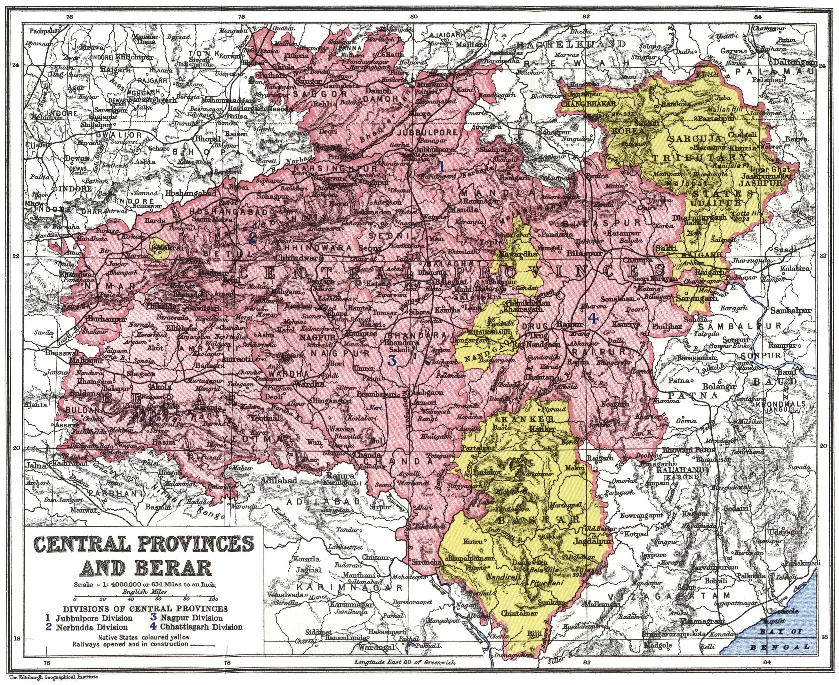The territory controlled by the Chief Commissioner of the Central Provinces and Berār has an area of 131,000 square miles and a population of 16,000,000 persons. Situated in the centre of the Indian Peninsula, between latitudes 17°47′ and 24°27′ north, and longitudes 76° and 84° east, it occupies about 7.3 per cent of the total area of British India. It adjoins the Central India States and the United Provinces to the north, Bombay to the west, Hyderābād State and the Madras Presidency to the south, and the Province of Bihār and Orissa to the east. The Province was constituted as a separate administrative unit in 1861 from territories taken from the Peshwa [6]in 1818 and the Marātha State of Nāgpur, which had lapsed from failure of heirs in 1853. Berār, which for a considerable previous period had been held on a lease or assignment from the Nizām of Hyderābād, was incorporated for administrative purposes with the Central Provinces in 1903. In 1905 the bulk of the District of Sambalpur, with five Feudatory States inhabited by an Uriya-speaking population, were transferred to Bengal and afterwards to the new Province of Bihār and Orissa, while five Feudatory States of Chota Nāgpur were received from Bengal. The former territory had been for some years included in the scope of the Ethnographic Survey, and is shown coloured in the annexed map of linguistic and racial divisions.