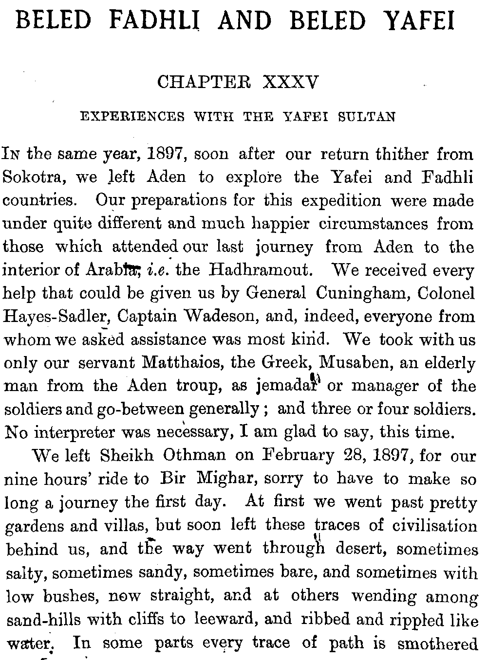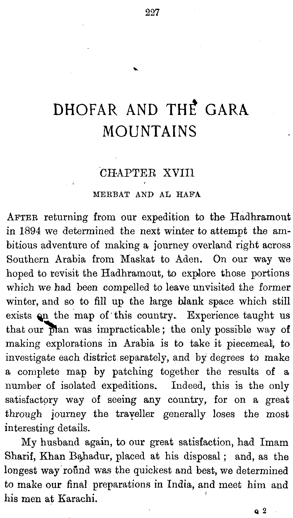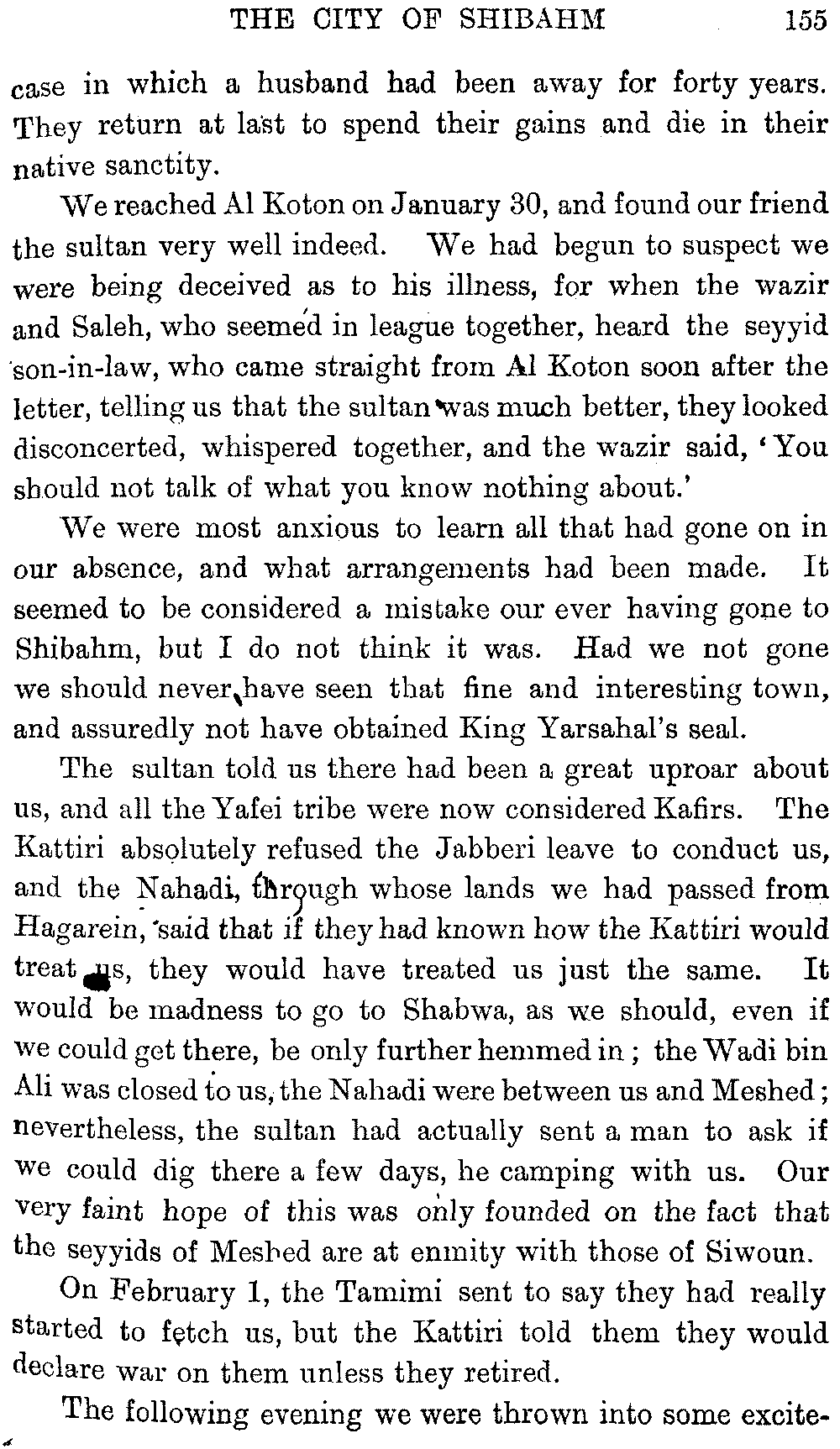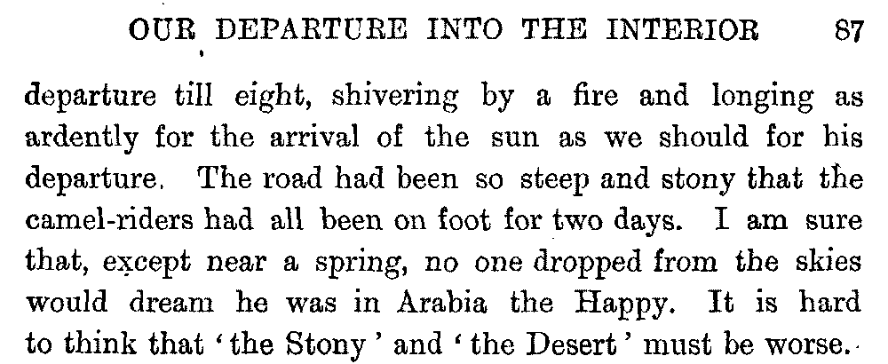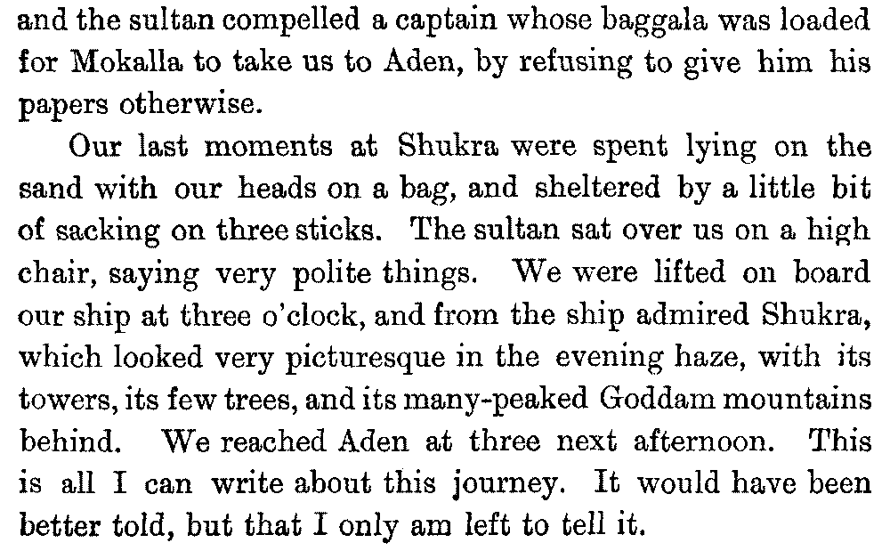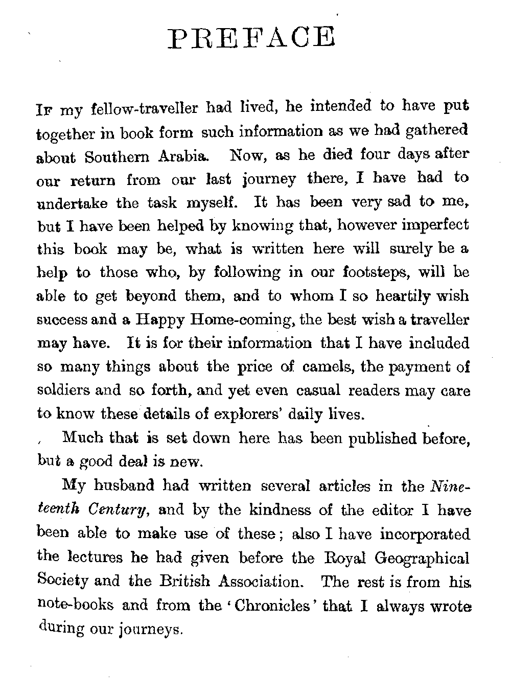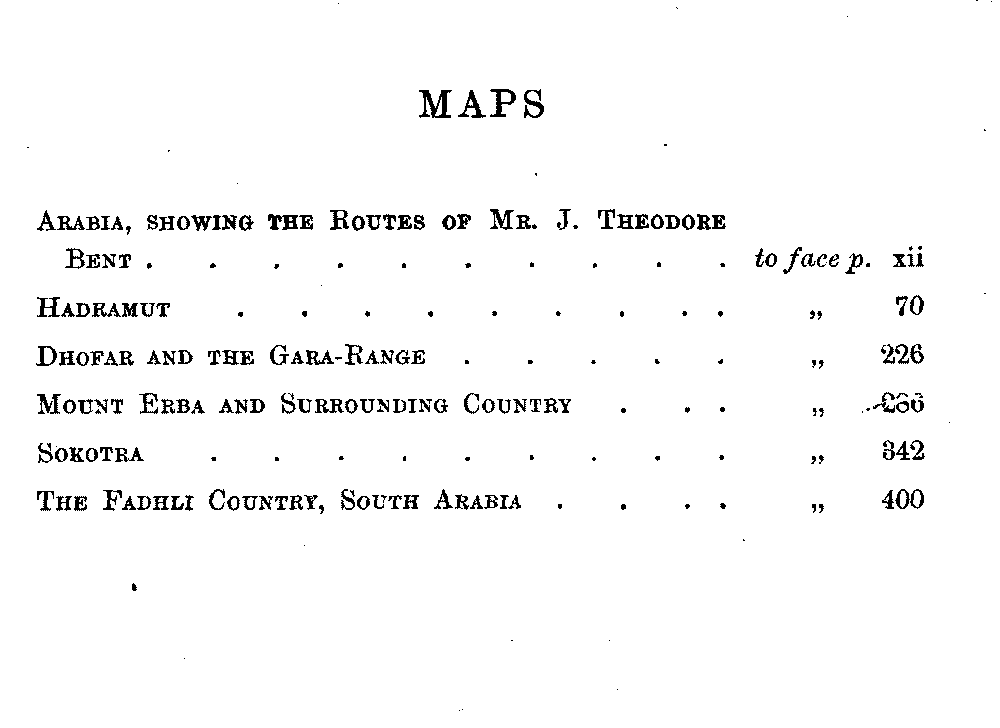 If my fellow-traveller had lived, he intended to have put together in book form such information as we had gathered about Southern Arabia. Now, as he died four days after our return from our last journey there, I have had to undertake the task myself. It has been very sad to me, but I have been helped by knowing that, however imperfect this book may be, what is written here will surely be a help to those who, by following in our footsteps, will be able to get beyond them, and to whom I so heartily wish success and a Happy Home-coming, the best wish a traveller may have. It is for their information that I have included so many things about the price of camels, the payment of soldiers and so forth, and yet even casual readers may care to know these details of explorers' daily lives.