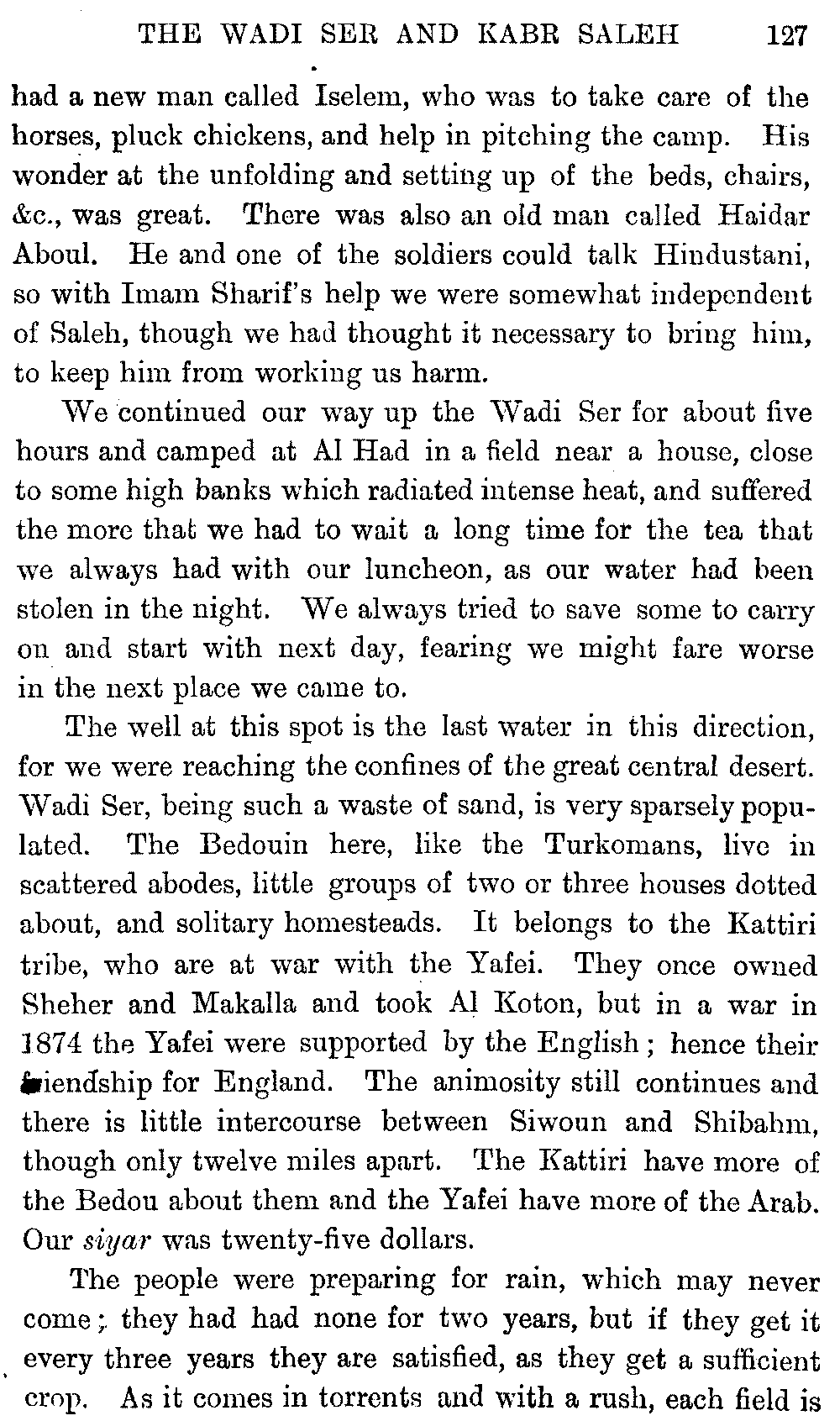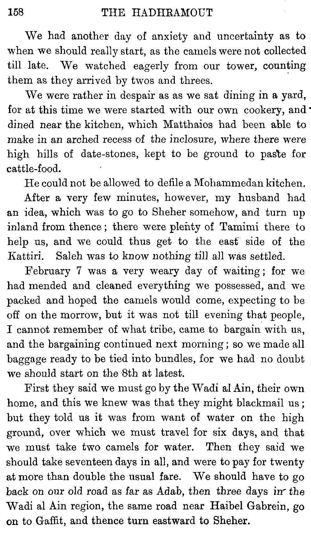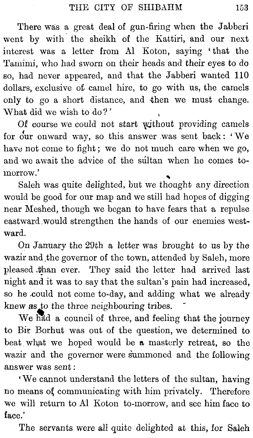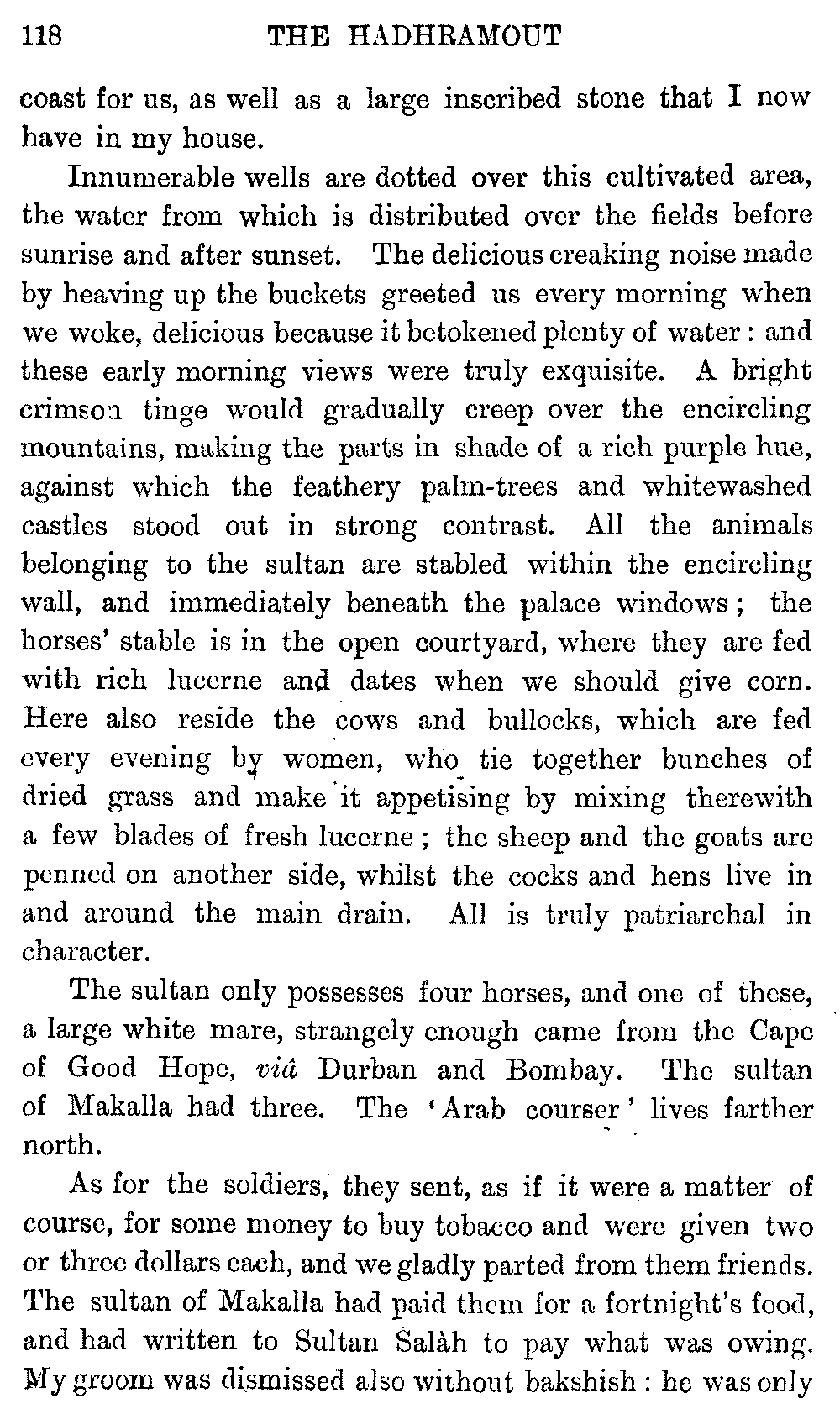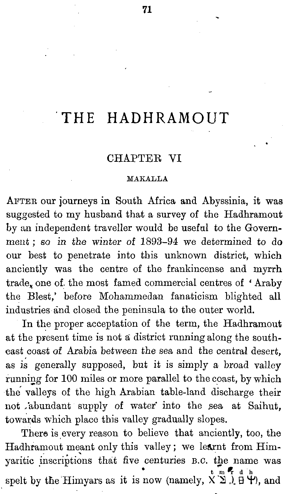 If my fellow-traveller had lived, he intended to have put together in book form such information as we had gathered about Southern Arabia. Now, as he died four days after our return from our last journey there, I have had to undertake the task myself. It has been very sad to me, but I have been helped by knowing that, however imperfect this book may be, what is written here will surely be a help to those who, by following in our footsteps, will be able to get beyond them, and to whom I so heartily wish success and a Happy Home-coming, the best wish a traveller may have. It is for their information that I have included so many things about the price of camels, the payment of soldiers and so forth, and yet even casual readers may care to know these details of explorers' daily lives.