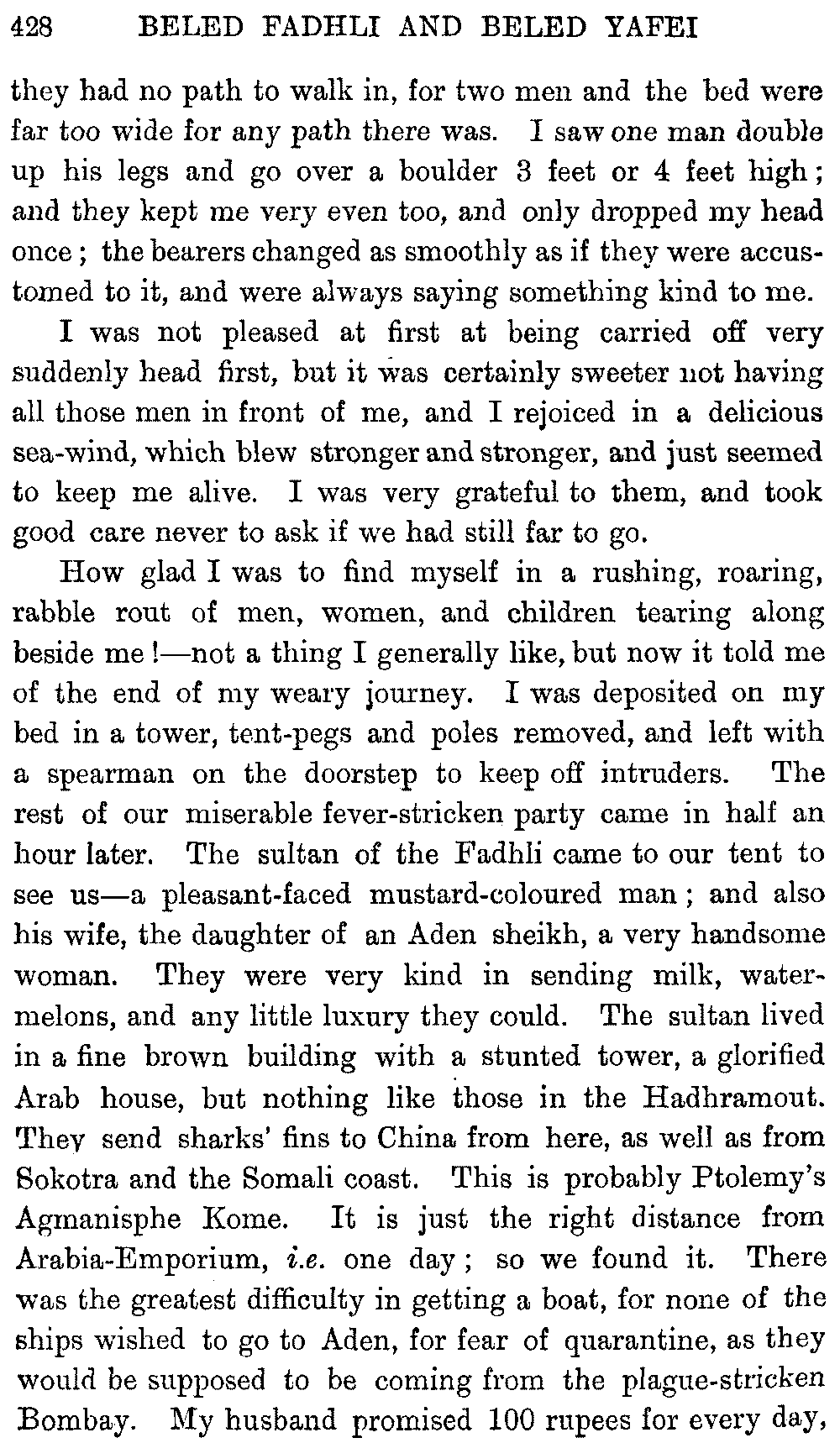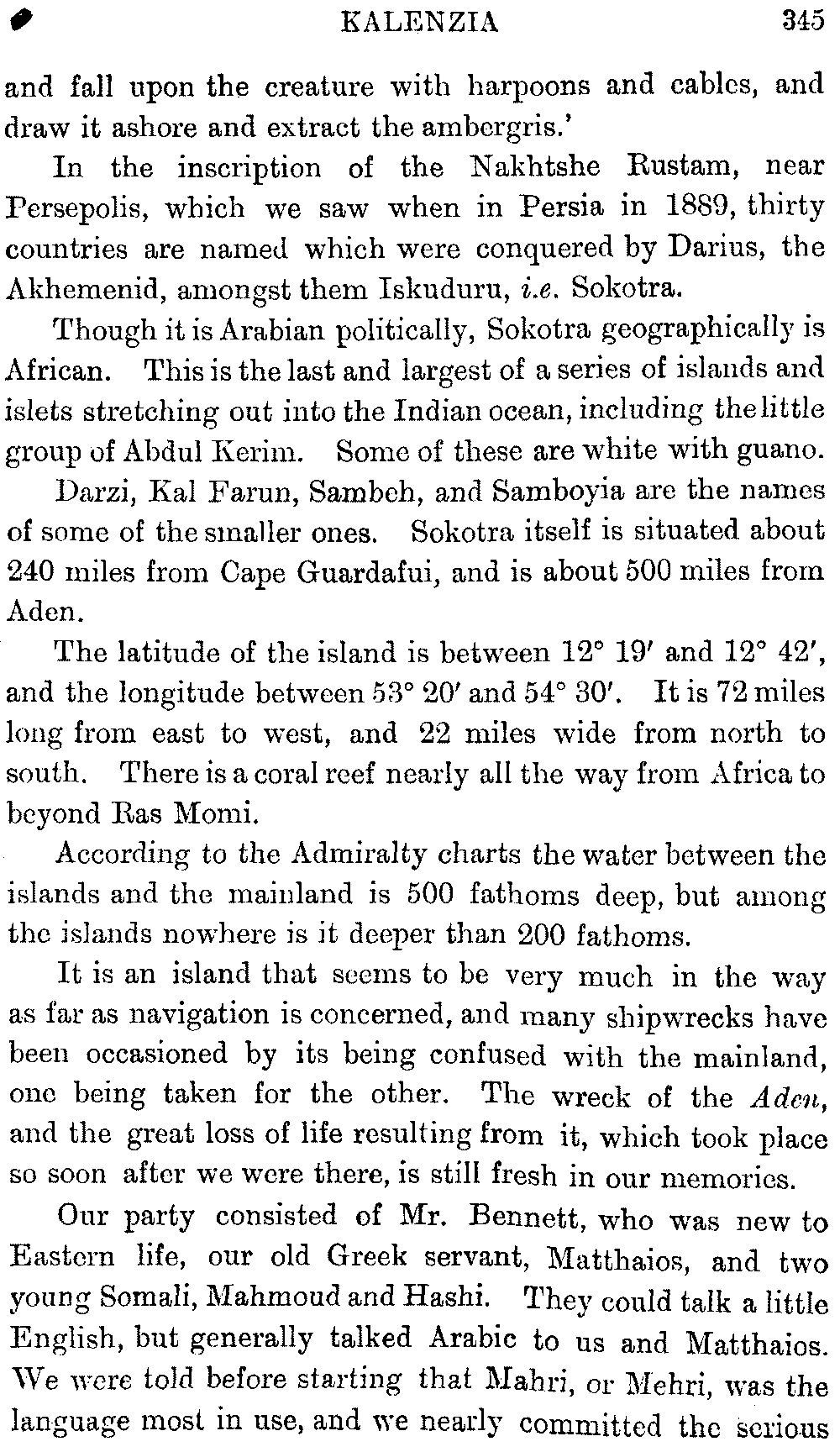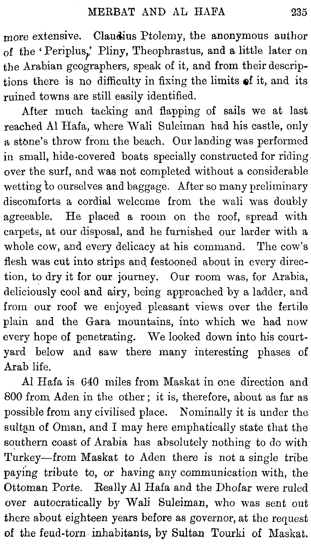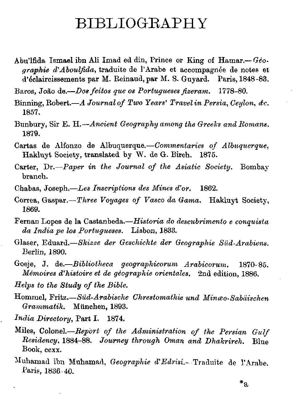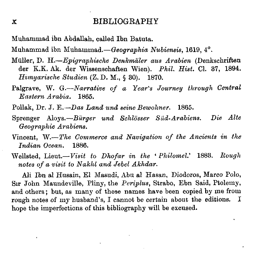 Ali Ibn al Husain, El Masudi, Abu al Hasan, Diodoros, Marco Polo, Sir John Maundeville, Pliny, the Periplus, Strabo, Ebn Said, Ptolemy, and others; but, as many of these names have been copied by me from rough notes of my husband's, I cannot be certain about the editions. I hope the imperfections of this bibliography will be excused.