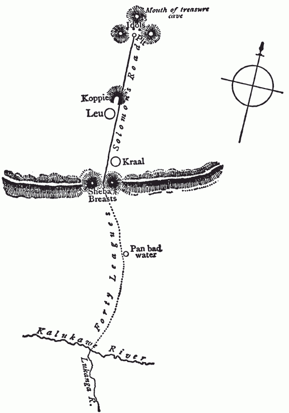 “‘Know it! why, what is “Suliman” but a corruption of Solomon?[3] Besides, an old Isanusi or witch doctoress up in the Manica country told me all about it. She said that the people who lived across those mountains were a “branch” of the Zulus, speaking a dialect of Zulu, but finer and bigger men even; that there lived among them great wizards, who had learnt their art from white men when “all the world was dark,” and who had the secret of a wonderful mine of “bright stones.”’