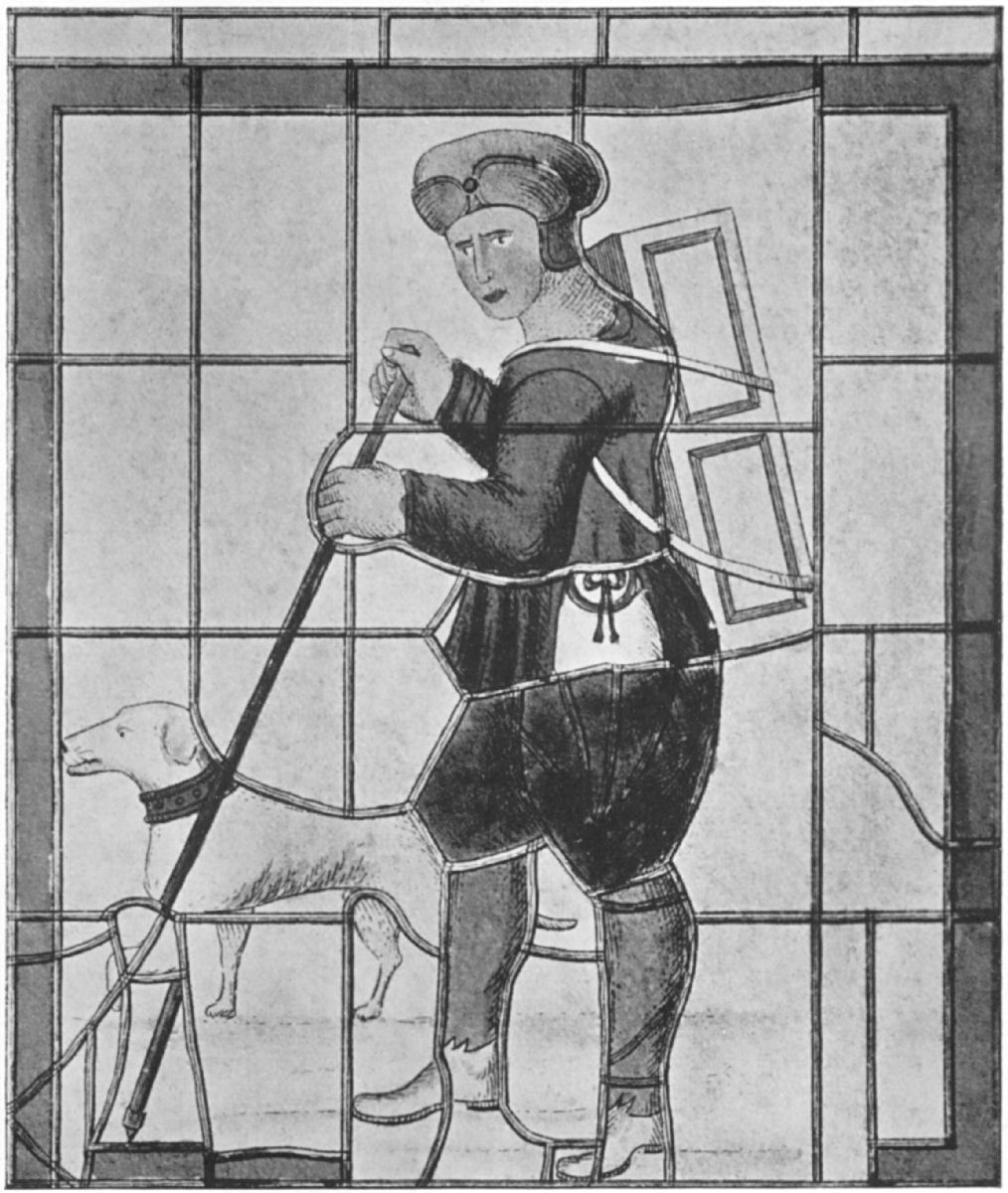 "Constant tradition says that there lived in former times, in Soffham (Swaffham), alias Sopham, in Norfolk, a certain pedlar, who dreamed that if he went to London bridge, and stood there, he should hear very joyfull newse, which he at first sleighted, but afterwards, his dream being dubled and trebled upon him, he resolv'd to try the issue of it, and accordingly went to London, and stood on the bridge there two or three days, looking about him, but heard nothing that might yield him any comfort. At last it happen'd that a shopkeeper there, hard by, haveing noted his fruitless[Pg 16] standing, seeing that he neither sold any wares nor asked any almes, went to him and most earnestly begged to know what he wanted there, or what his business was; to which the pedlar honestly answer'd, that he had dream'd that if he came to London and stood there upon the bridg, he should hear good newse; at which the shopkeeper laught heartily, asking him if he was such a fool as to take a journey on such a silly errand, adding, 'I'll tell thee, country fellow, last night I dream'd that I was at Sopham, in Norfolk, a place utterly unknown to me, where methought behind a pedlar's house in a certain orchard, and under a great oak tree, if I digged I should find a vast treasure! Now think you,' says he, 'that I am such a fool to take such a long jorney upon me upon the instigation of a silly dream? No, no, I'm wiser. Therefore, good fellow, learn witt of me, and get you home, and mind your business.' The pedlar, observeing his words, what he had sayd he had dream'd and knowing they concenterd in him, glad of such joyfull newse went speedily home, and digged and found a prodigious great treasure, with which he grew exceeding rich, and Soffham church being for the most part fal'n down he set on workmen and reedifyd it most sumptuously, at his own charges; and to this day there is his statue therein, cut in stone, with his pack at his back, and his dogg at his heels; and his memory is also preserved by the same form or picture in most of the old glass windows, taverns, and ale-houses of that town unto this day."[13]