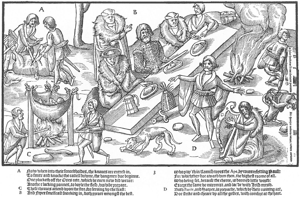 This is reproduced from the very excellent reprint (1883) of this remarkable book, published originally in 1581. The whole book is historically valuable as showing the undeveloped nature of Irish culture. The flesh was boiled in the hide, the fire is lighted in the open camp, and the entire rudeness of the scene depicts the people "whose usages I behelde after the fashion there sette downe." |