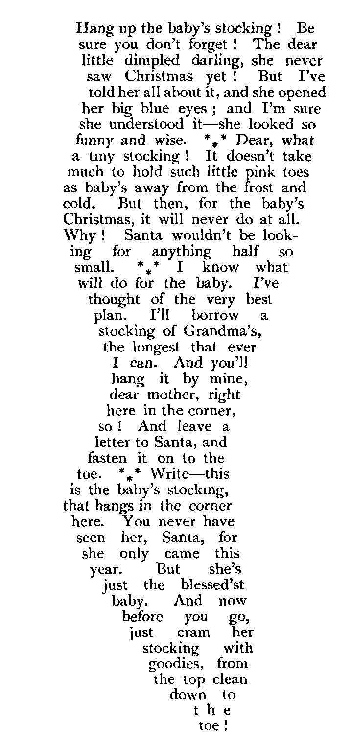 At Christiania, and other Norwegian towns, there is, or used to be, a delicate Christmas custom of offering to a lady a brooch or a pair of earings in a truss of hay. The house-door of the person to be complimented is pushed open, and there is thrown into the house a truss of hay or straw, a sheaf of corn, or a bag of chaff. In some part of this "bottle of hay" envelope, there is a "needle" as a present to be hunted for. A friend of mine once received from her betrothed, according to the Christmas custom, an exceedingly large brown paper parcel, which, on being opened, revealed a second parcel with a loving motto on the cover. And so on, parcel within parcel, motto within motto, till the kernel of this paper husk—which was at length discovered to be a delicate piece of minute jewellery—was arrived at.