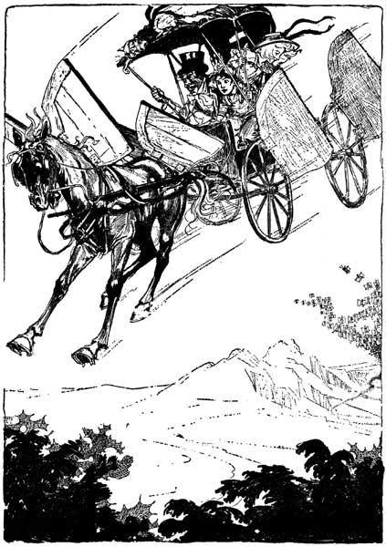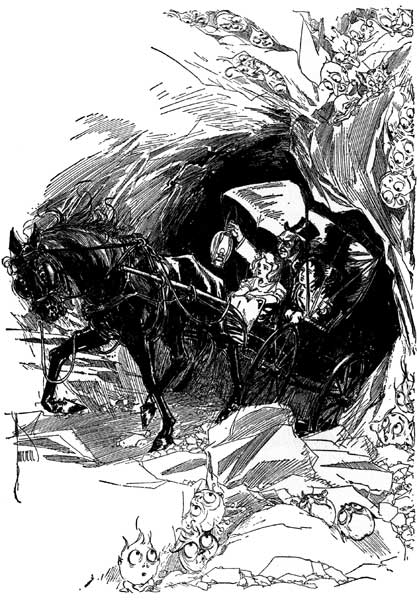 HEN Dorothy recovered her senses they were still falling, but not so fast. The top of the buggy caught the air like a parachute or an umbrella filled with wind, and held them back so that they floated downward with a gentle motion that was not so very disagreeable to bear. The worst thing was their terror of reaching the bottom of this great crack in the earth, and the natural fear that sudden death was about to overtake them at any moment. Crash after crash echoed far above their heads, as the earth came together where it had split, and stones and chunks of clay rattled around them on every side. These they could not see, but they could feel them pelting the buggy top, and Jim screamed almost like a human[Pg 24] being when a stone overtook him and struck his boney body. They did not really hurt the poor horse, because everything was falling together; only the stones and rubbish fell faster than the horse and buggy, which were held back by the pressure of the air, so that the terrified animal was actually more frightened than he was injured.