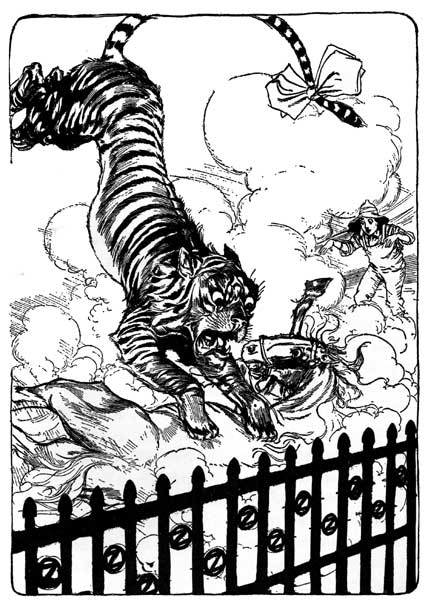 UREKA was much surprised to find herself in disgrace; but she was, in spite of the fact that she had not eaten the piglet. For the folks of Oz knew the kitten had tried to commit the crime, and that only an accident had prevented her from doing so; therefore even the Hungry Tiger preferred not to associate with her. Eureka was forbidden to wander around the palace and was made to stay in confinement in Dorothy's room; so she began to beg her mistress to send her to some other place where she could enjoy herself better.