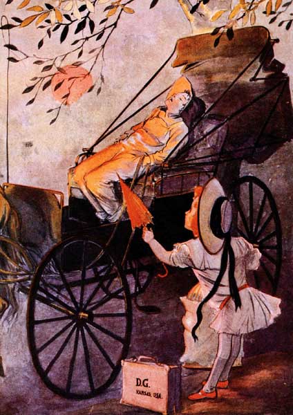 The shed at Hugson's Siding was bare save for an old wooden bench, and did not look very inviting. As she peered through the soft gray light not a house of any sort was visible near the station, nor was any person in sight; but after a while the child discovered a horse and buggy standing near a group of trees a short distance away. She walked toward it and found the horse tied to a tree and standing motionless, with its head hanging down almost to the ground. It was a big horse, tall and bony, with long legs and large knees and feet. She could count his ribs easily where they showed through the skin of his body, and his head was long and seemed altogether too big for him, as if it did not fit. His tail was short and scraggly, and his harness had been broken in many places and fastened together again with[Pg 15] cords and bits of wire. The buggy seemed almost new, for it had a shiny top and side curtains. Getting around in front, so that she could look inside, the girl saw a boy curled up on the seat, fast asleep.