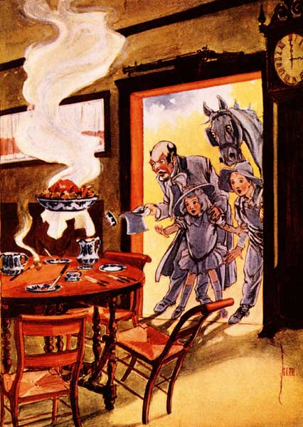 That last evening was so delightful that the boy will never forget it as long as he lives. They were all together[Pg 254] (except Eureka) in the pretty rooms of the Princess, and the Wizard did some new tricks, and the Scarecrow told stories, and the Tin Woodman sang a love song in a sonorous, metallic voice, and everybody laughed and had a good time. Then Dorothy wound up Tik-tok and he danced a jig to amuse the company, after which the Yellow Hen related some of her adventures with the Nome King in the Land of Ev.