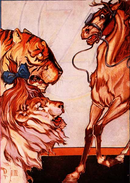 "There ought to be several animals on the jury," said Ozma, "because animals understand each other better than[Pg 237] we people understand them. So the jury shall consist of the Cowardly Lion, the Hungry Tiger, Jim the Cab-horse, the Yellow Hen, the Scarecrow, the Wizard, Tik-tok the Machine Man, the Sawhorse and Zeb of Hugson's Ranch. That makes the nine which the law requires, and all my people shall be admitted to hear the testimony."