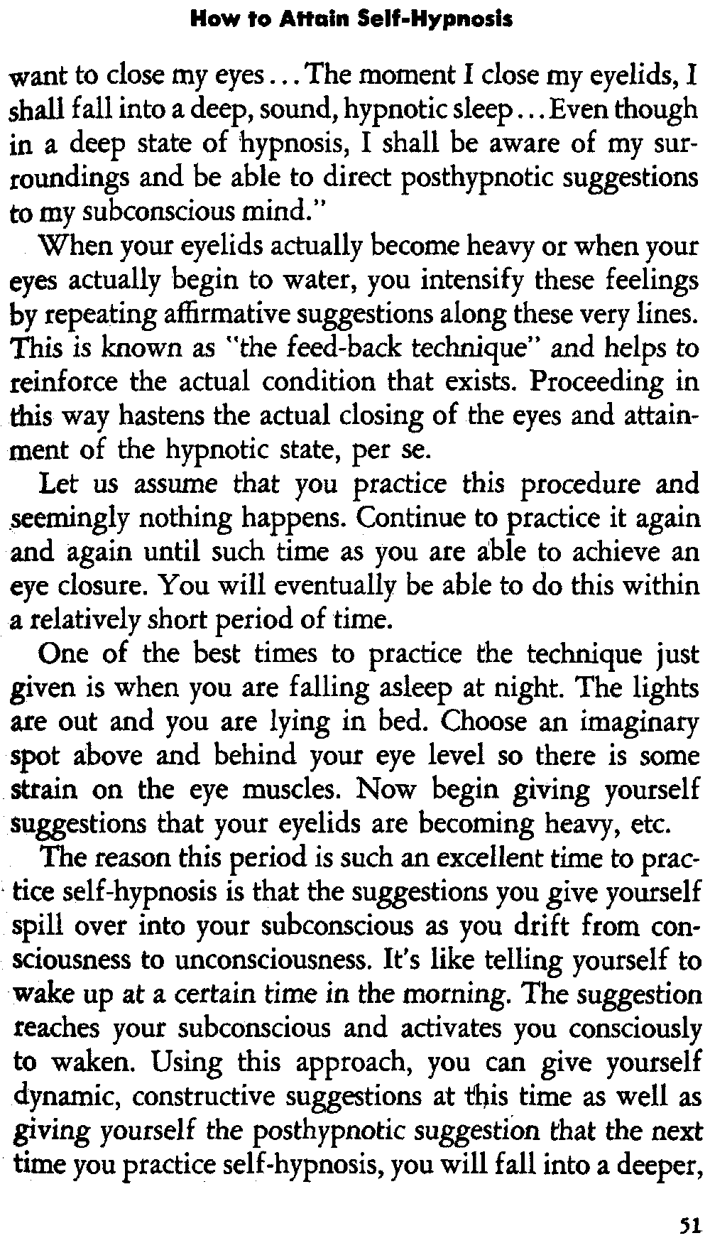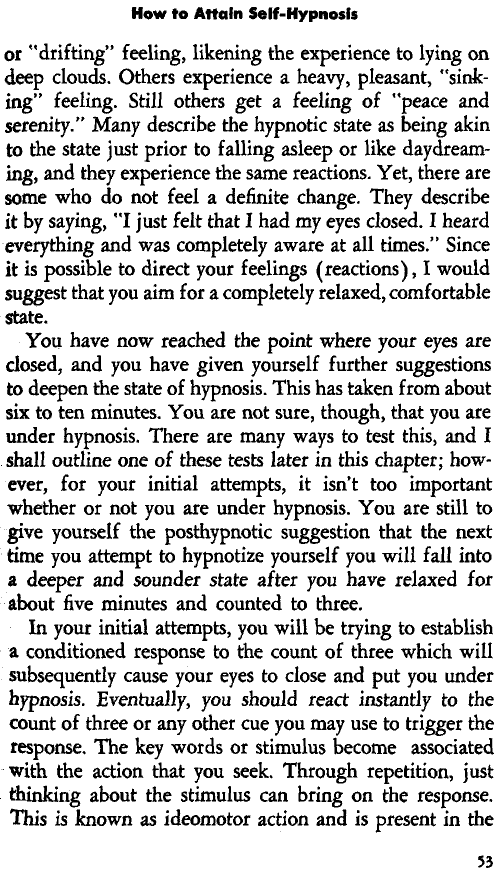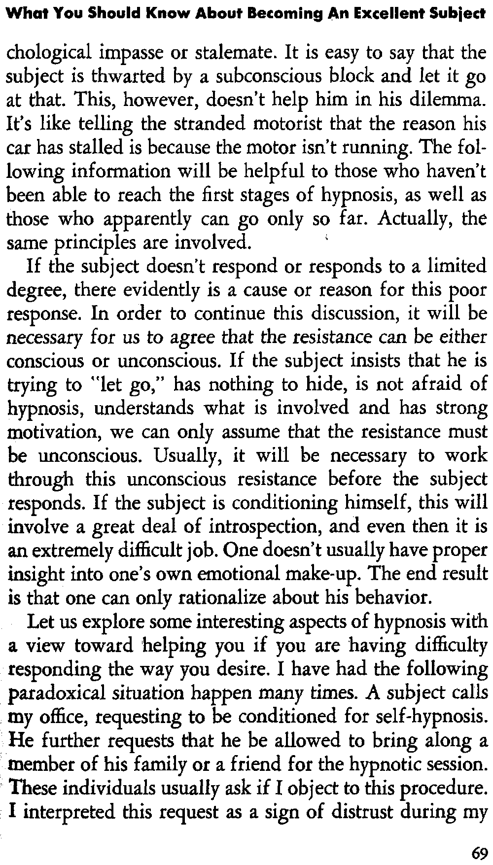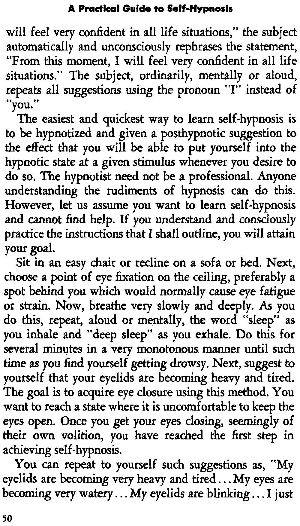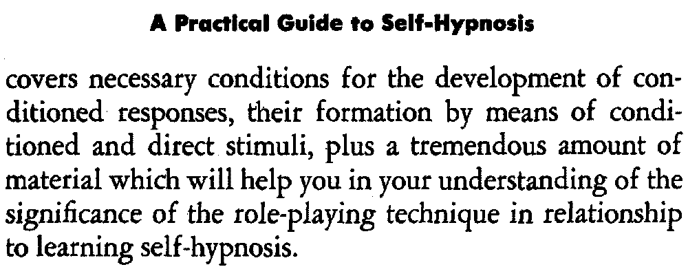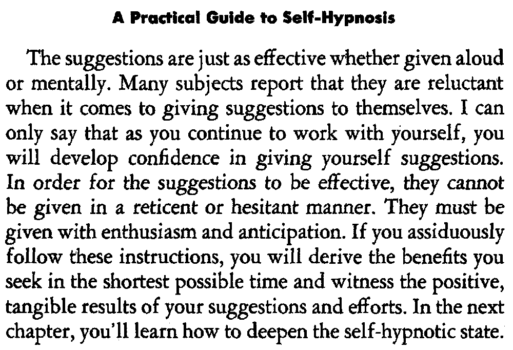 In self-hypnosis the same thing usually takes place. The subject is anxious to achieve self-hypnosis, but somehow the state eludes him. What's wrong? It may be that he is [12] unconsciously resisting it, hasn't conditioned himself sufficiently, or has achieved the hypnotic state and doesn't know he is in the state. This last statement may be surprising, but we will examine it in detail a little later on.