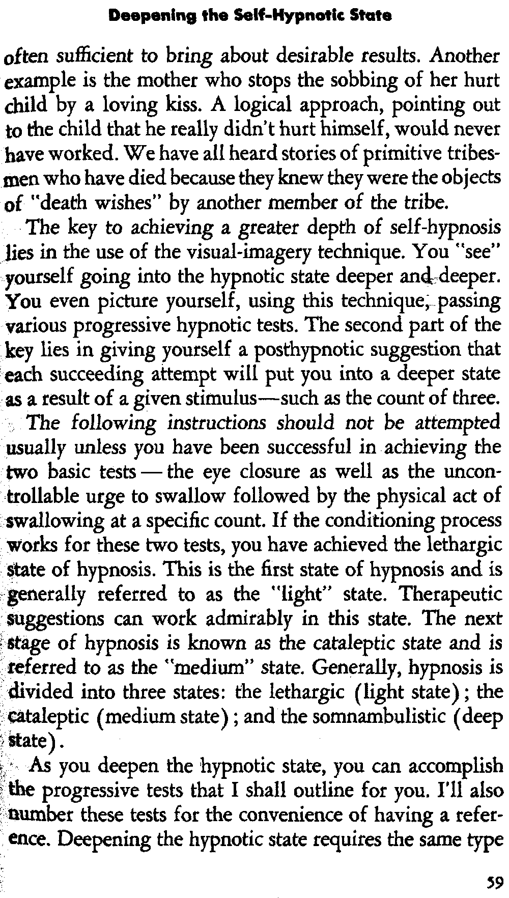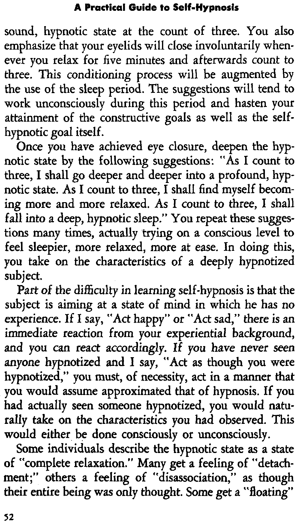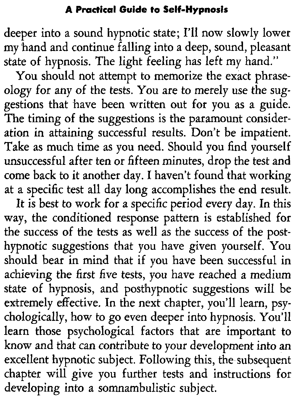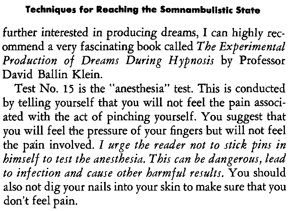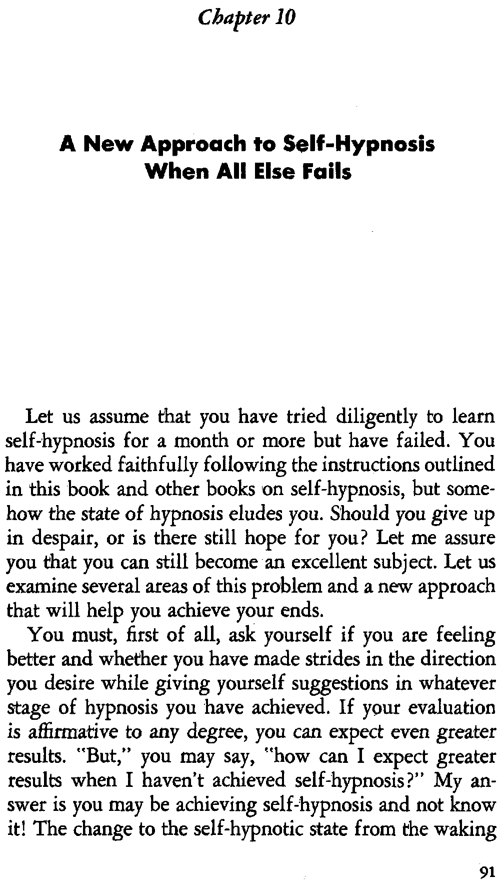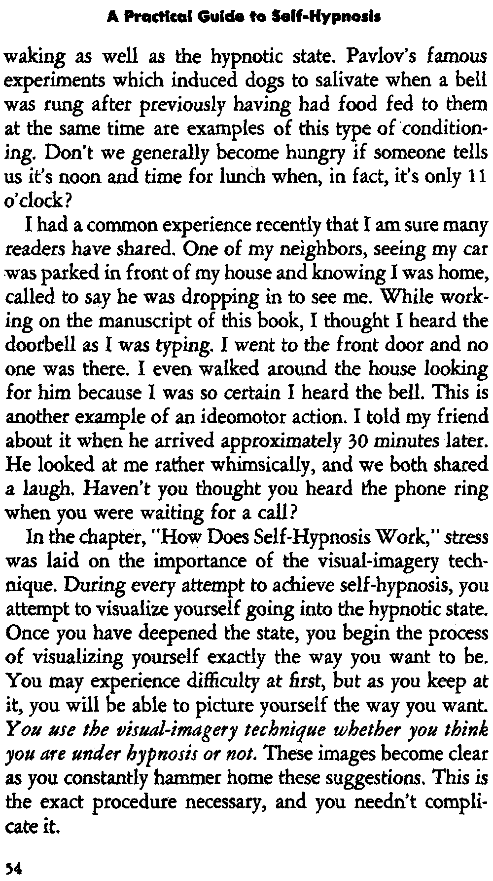 In self-hypnosis the same thing usually takes place. The subject is anxious to achieve self-hypnosis, but somehow the state eludes him. What's wrong? It may be that he is [12] unconsciously resisting it, hasn't conditioned himself sufficiently, or has achieved the hypnotic state and doesn't know he is in the state. This last statement may be surprising, but we will examine it in detail a little later on.