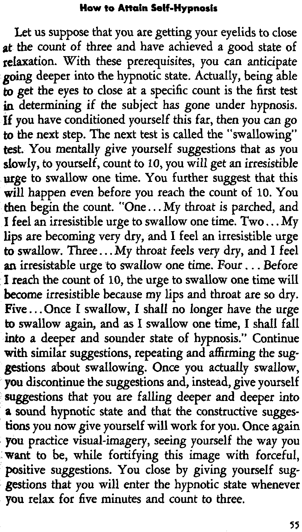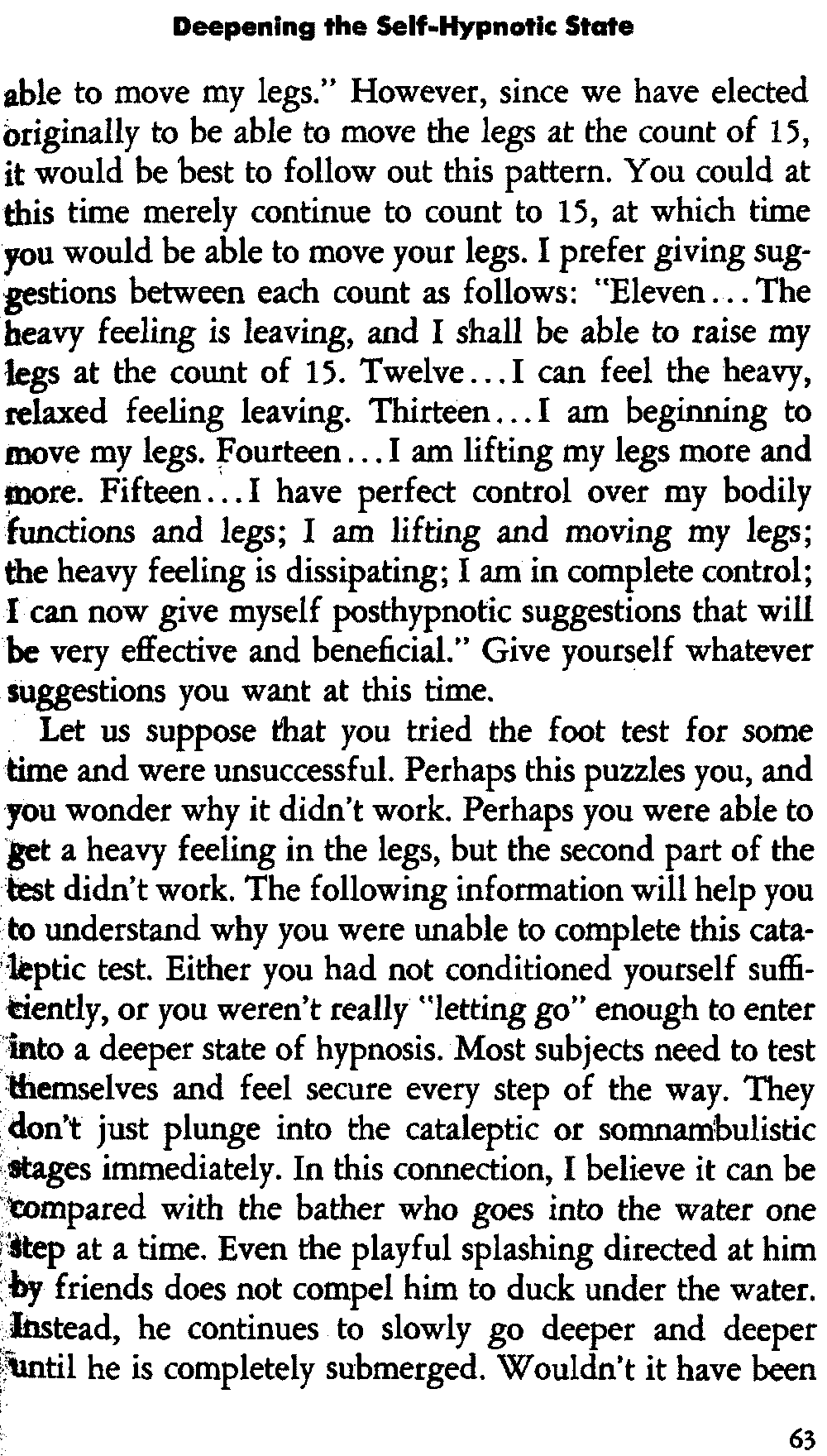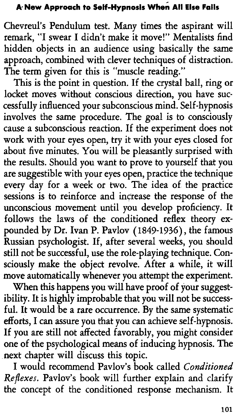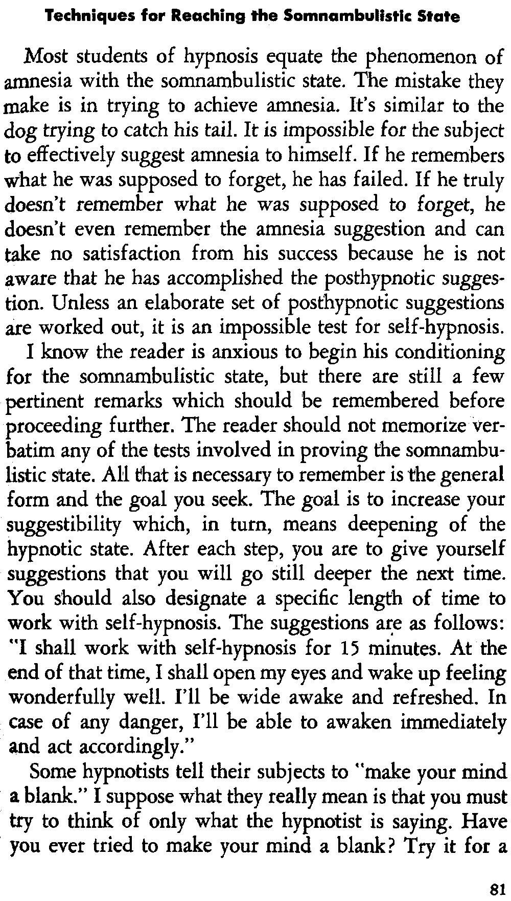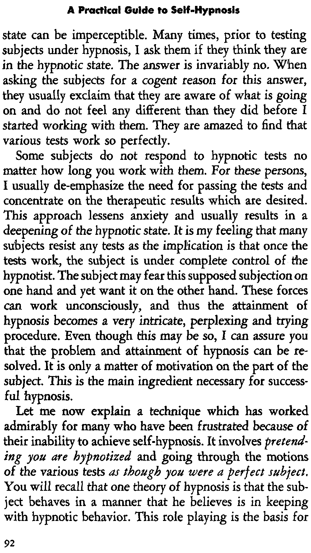 In self-hypnosis the same thing usually takes place. The subject is anxious to achieve self-hypnosis, but somehow the state eludes him. What's wrong? It may be that he is [12] unconsciously resisting it, hasn't conditioned himself sufficiently, or has achieved the hypnotic state and doesn't know he is in the state. This last statement may be surprising, but we will examine it in detail a little later on.