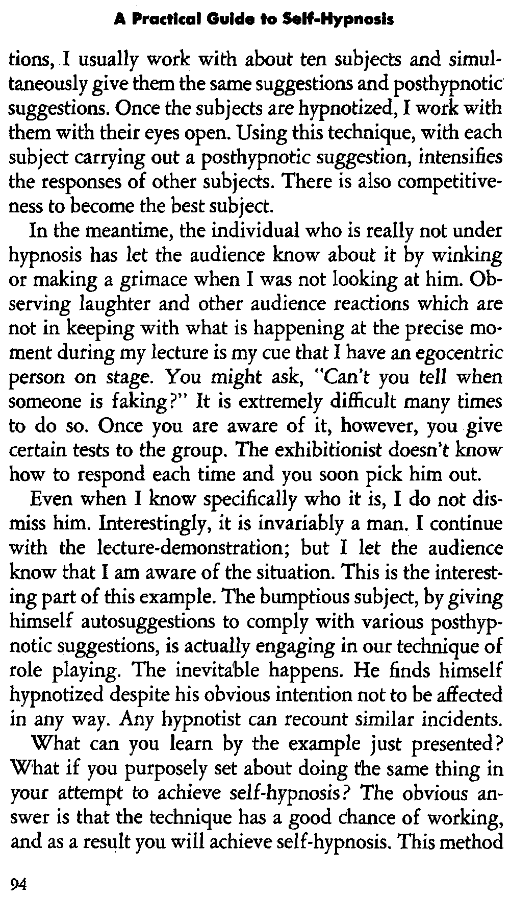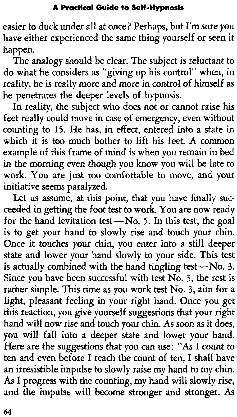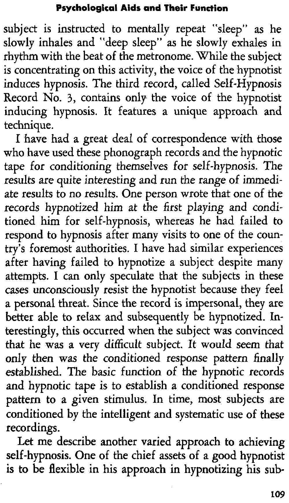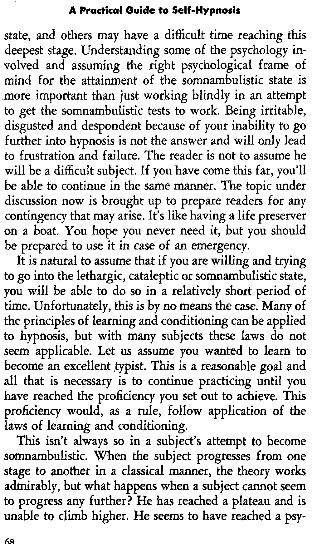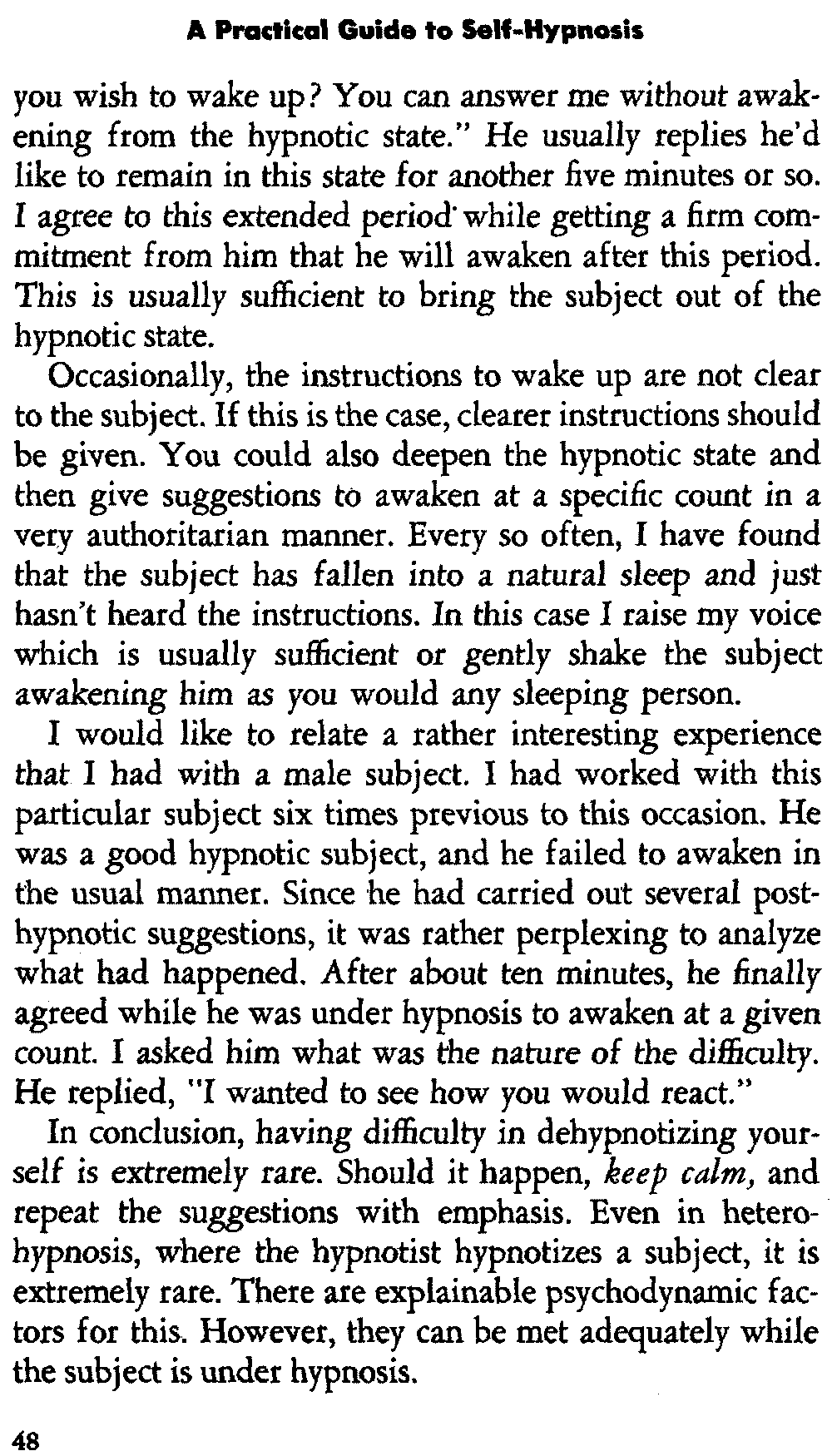 In self-hypnosis the same thing usually takes place. The subject is anxious to achieve self-hypnosis, but somehow the state eludes him. What's wrong? It may be that he is [12] unconsciously resisting it, hasn't conditioned himself sufficiently, or has achieved the hypnotic state and doesn't know he is in the state. This last statement may be surprising, but we will examine it in detail a little later on.