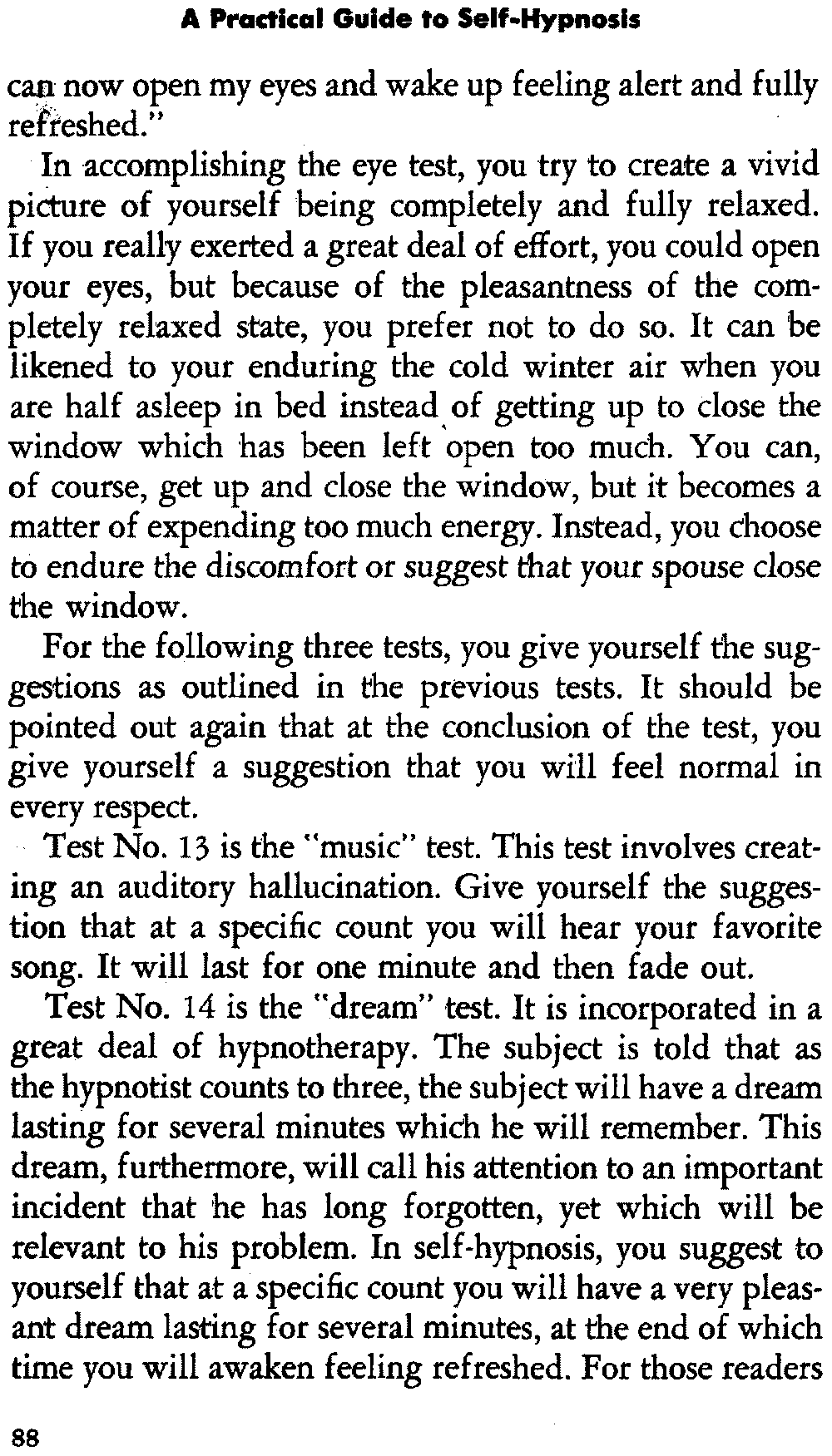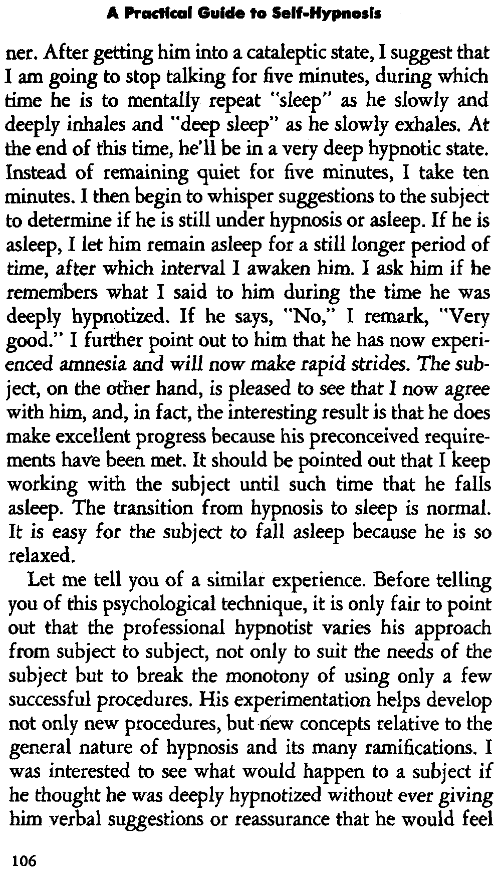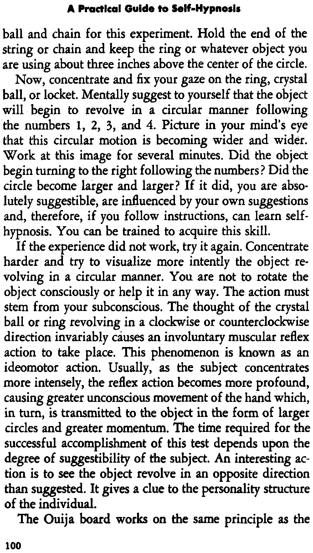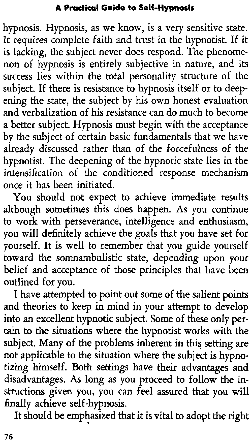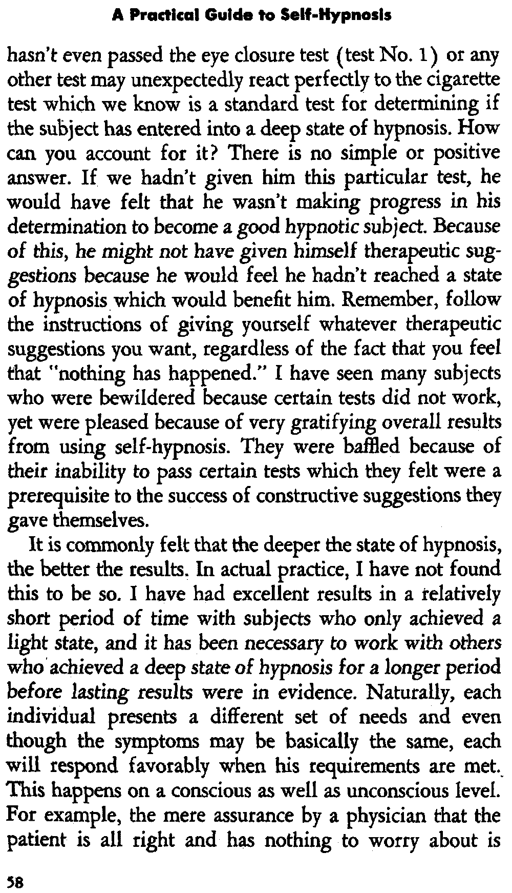 In self-hypnosis the same thing usually takes place. The subject is anxious to achieve self-hypnosis, but somehow the state eludes him. What's wrong? It may be that he is [12] unconsciously resisting it, hasn't conditioned himself sufficiently, or has achieved the hypnotic state and doesn't know he is in the state. This last statement may be surprising, but we will examine it in detail a little later on.