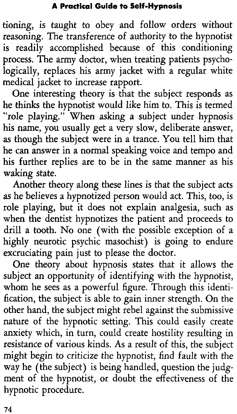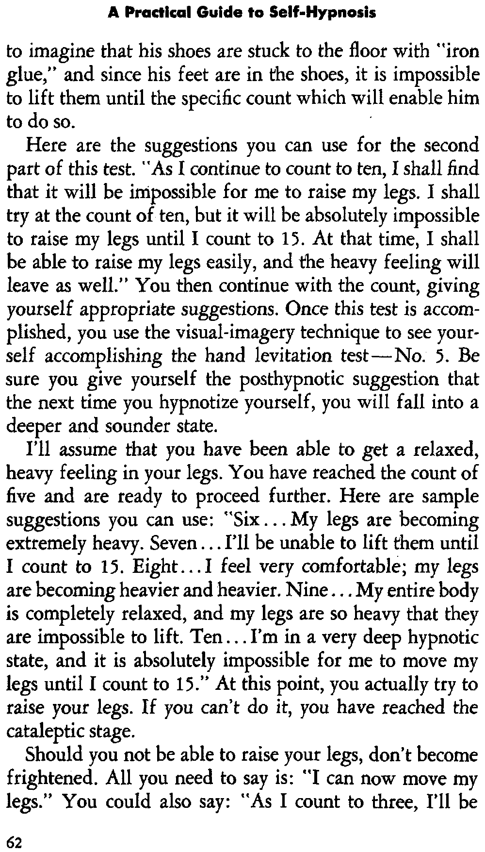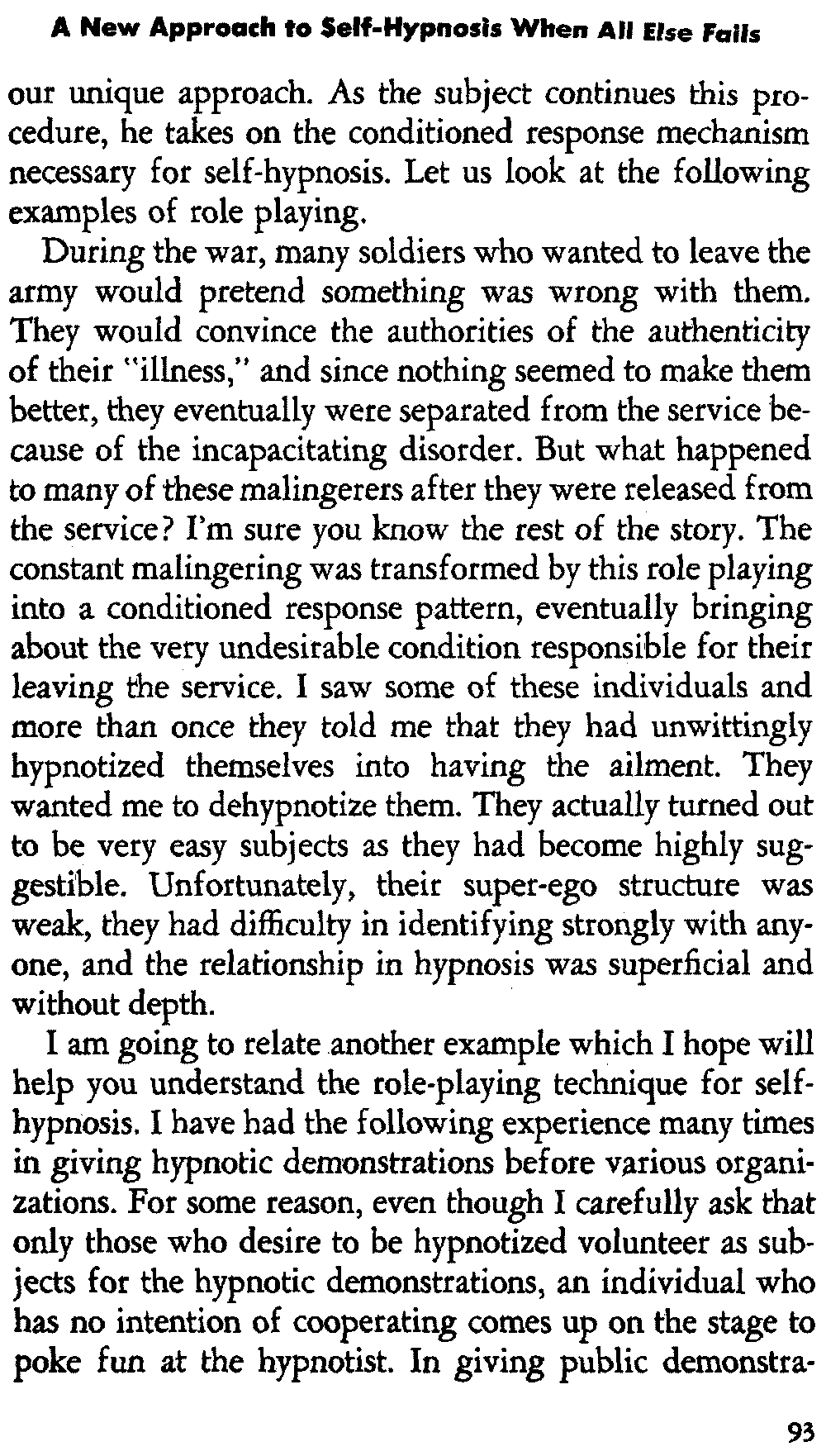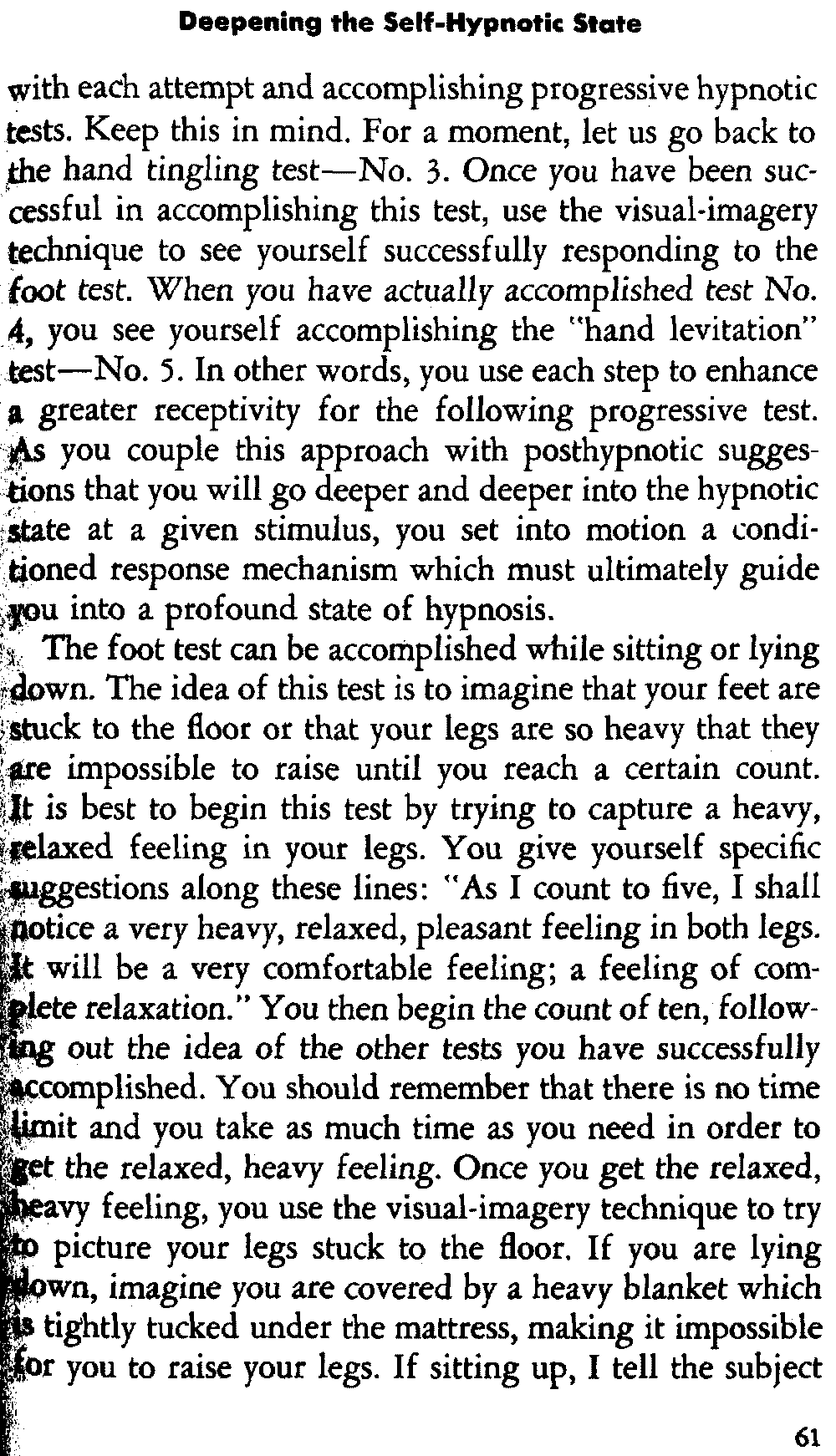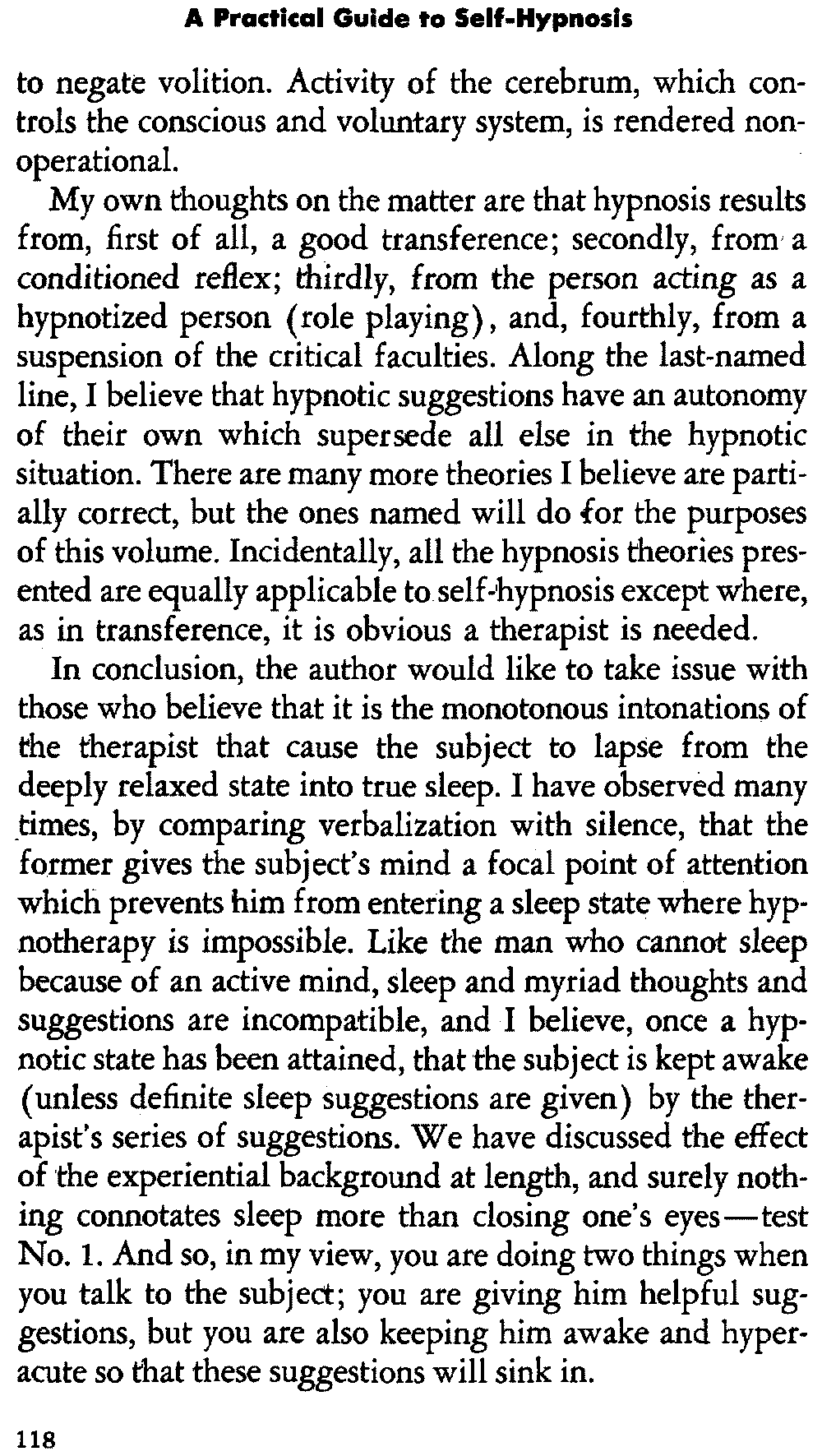 In self-hypnosis the same thing usually takes place. The subject is anxious to achieve self-hypnosis, but somehow the state eludes him. What's wrong? It may be that he is [12] unconsciously resisting it, hasn't conditioned himself sufficiently, or has achieved the hypnotic state and doesn't know he is in the state. This last statement may be surprising, but we will examine it in detail a little later on.