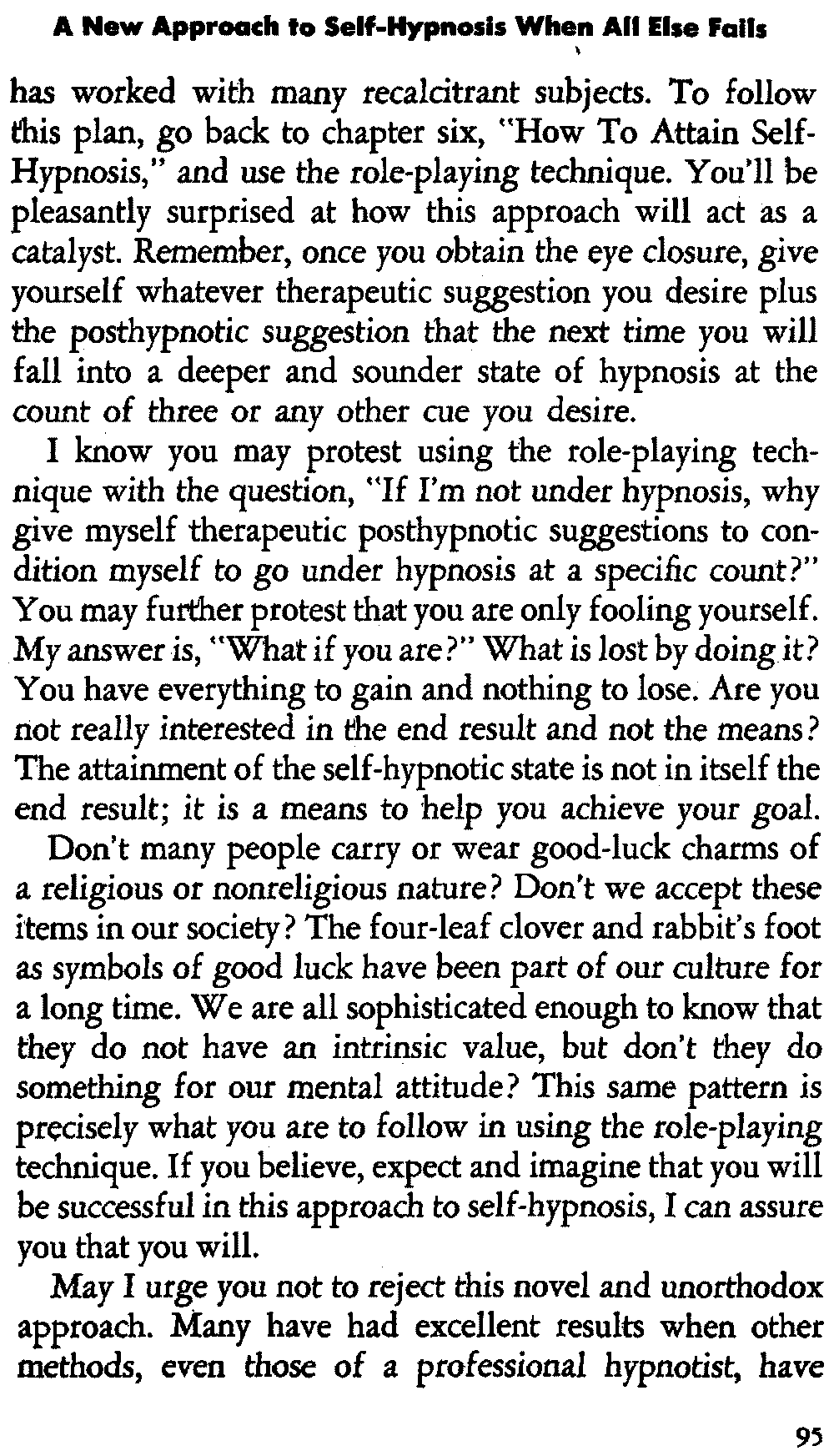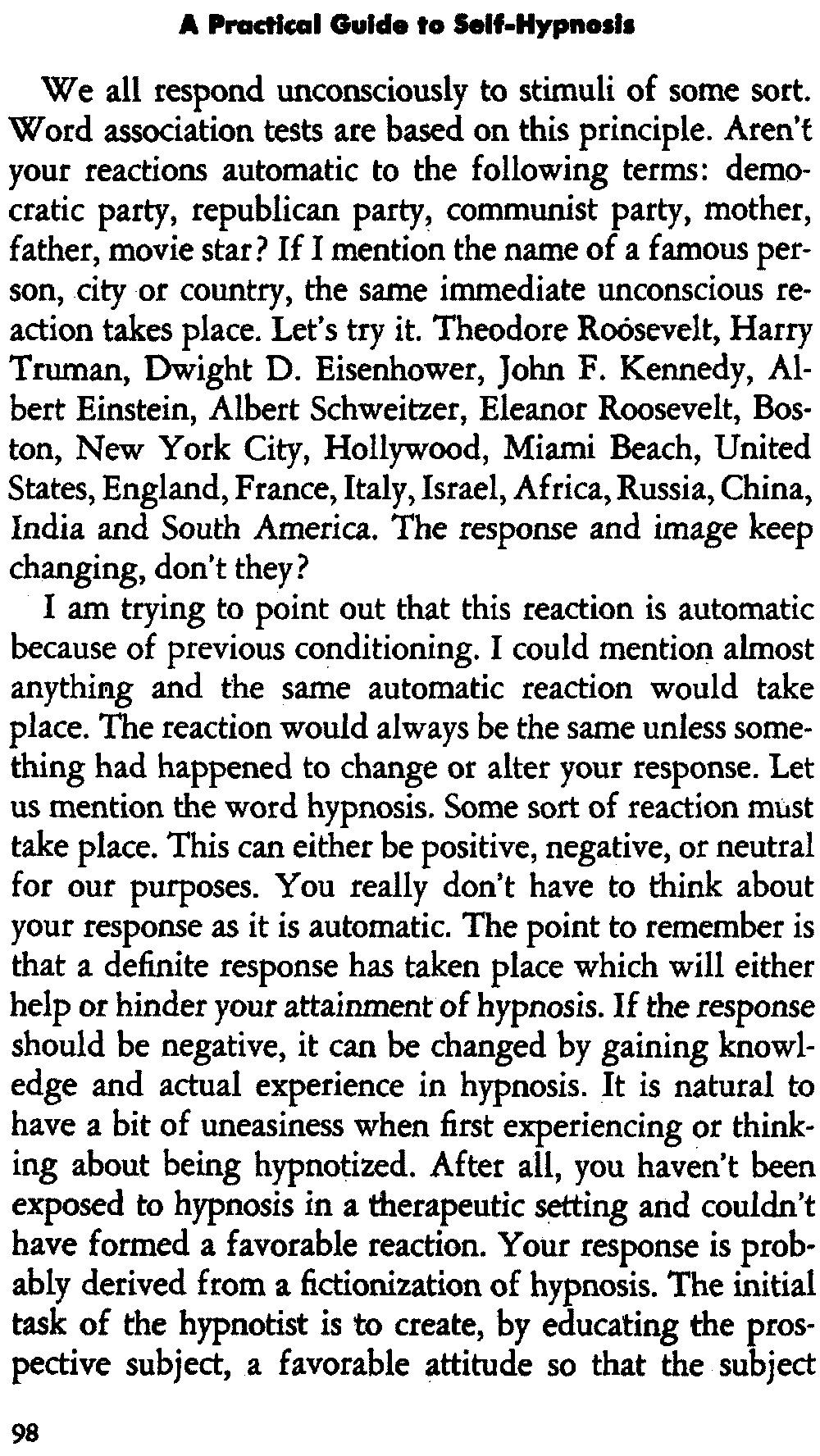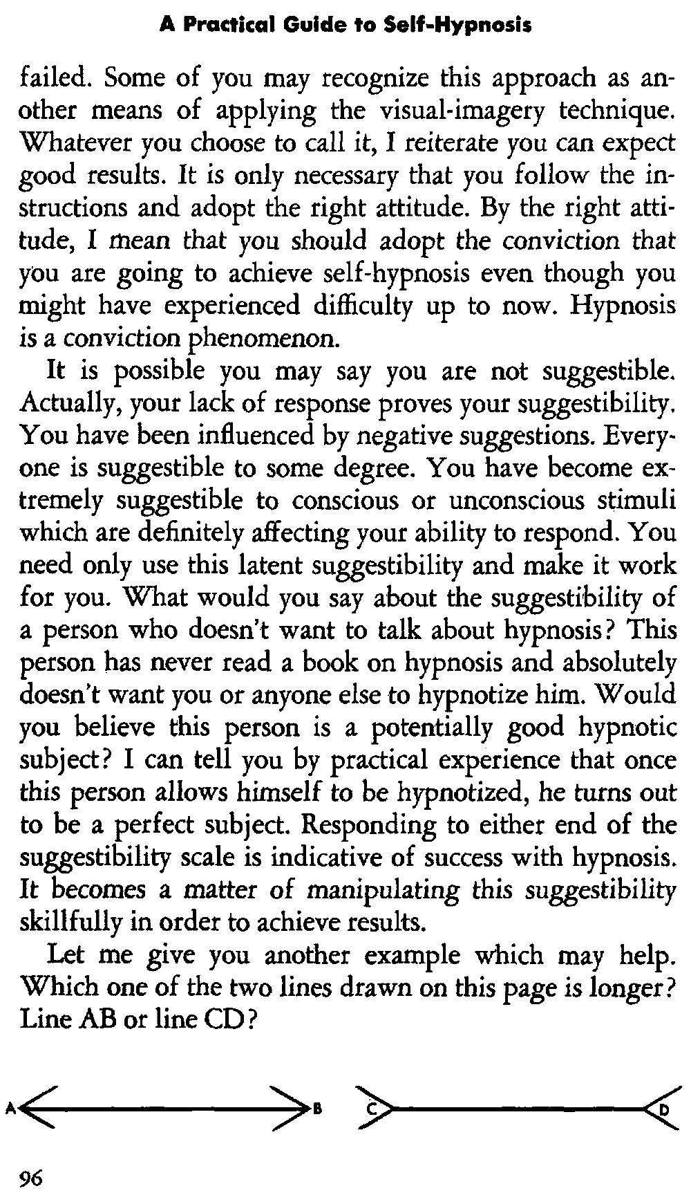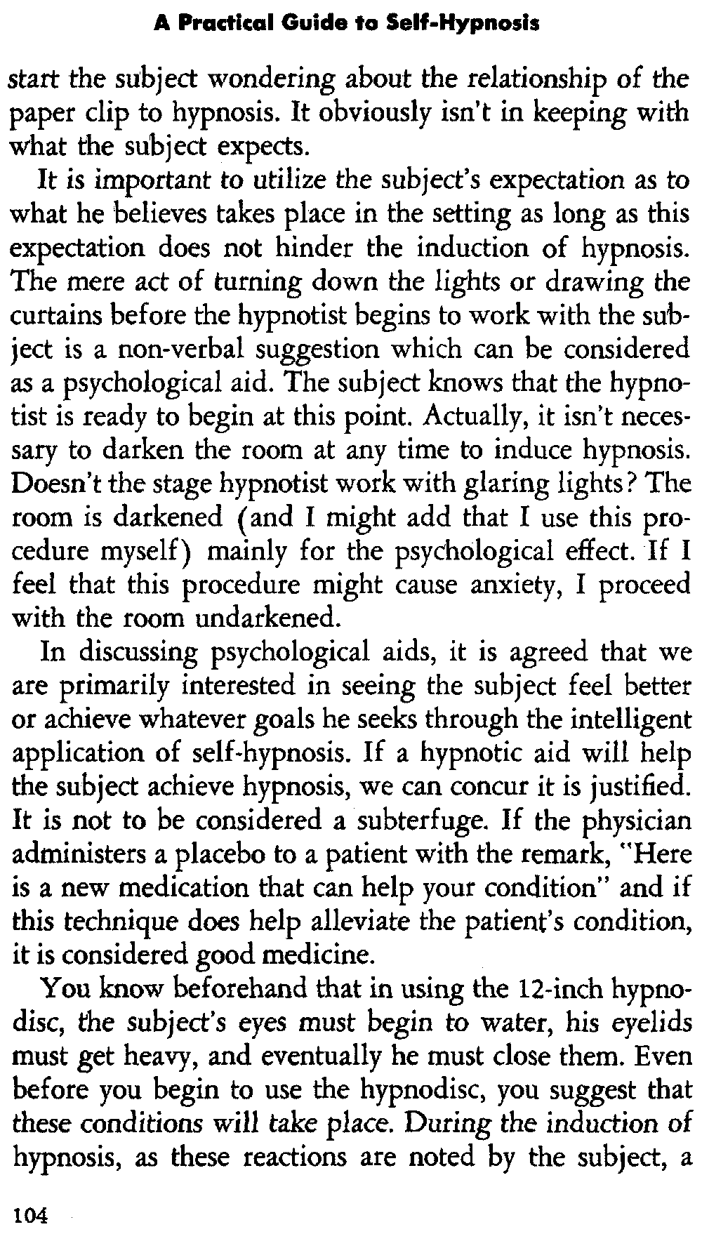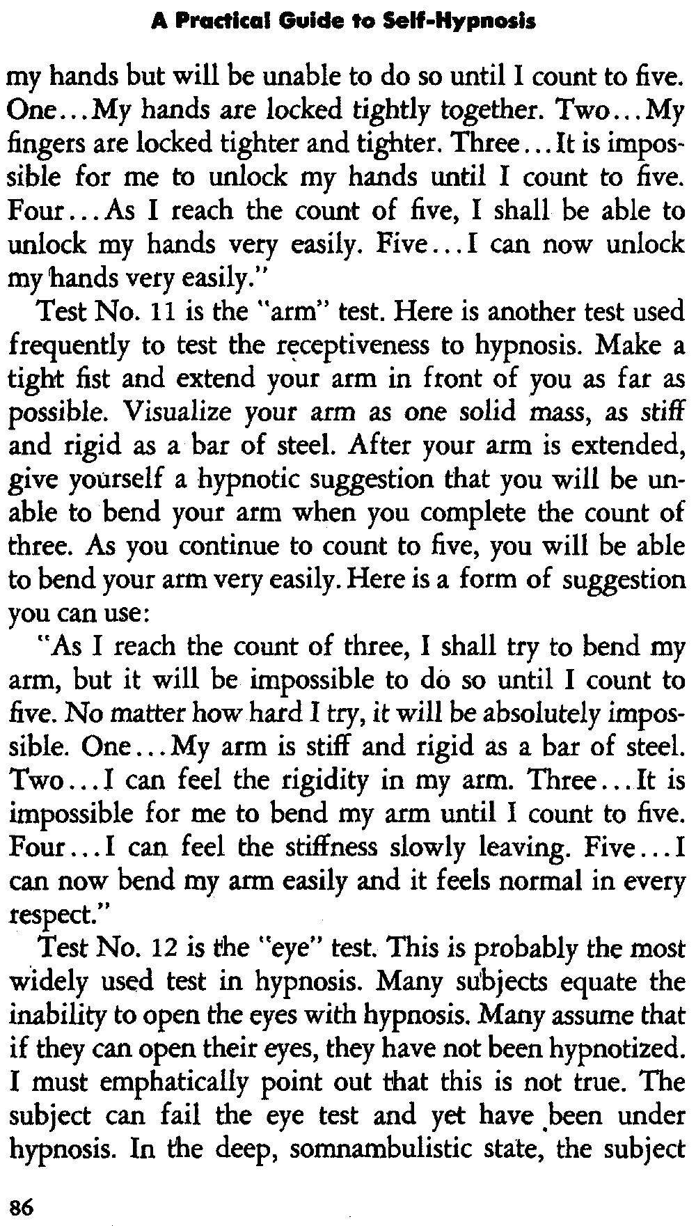 In self-hypnosis the same thing usually takes place. The subject is anxious to achieve self-hypnosis, but somehow the state eludes him. What's wrong? It may be that he is [12] unconsciously resisting it, hasn't conditioned himself sufficiently, or has achieved the hypnotic state and doesn't know he is in the state. This last statement may be surprising, but we will examine it in detail a little later on.