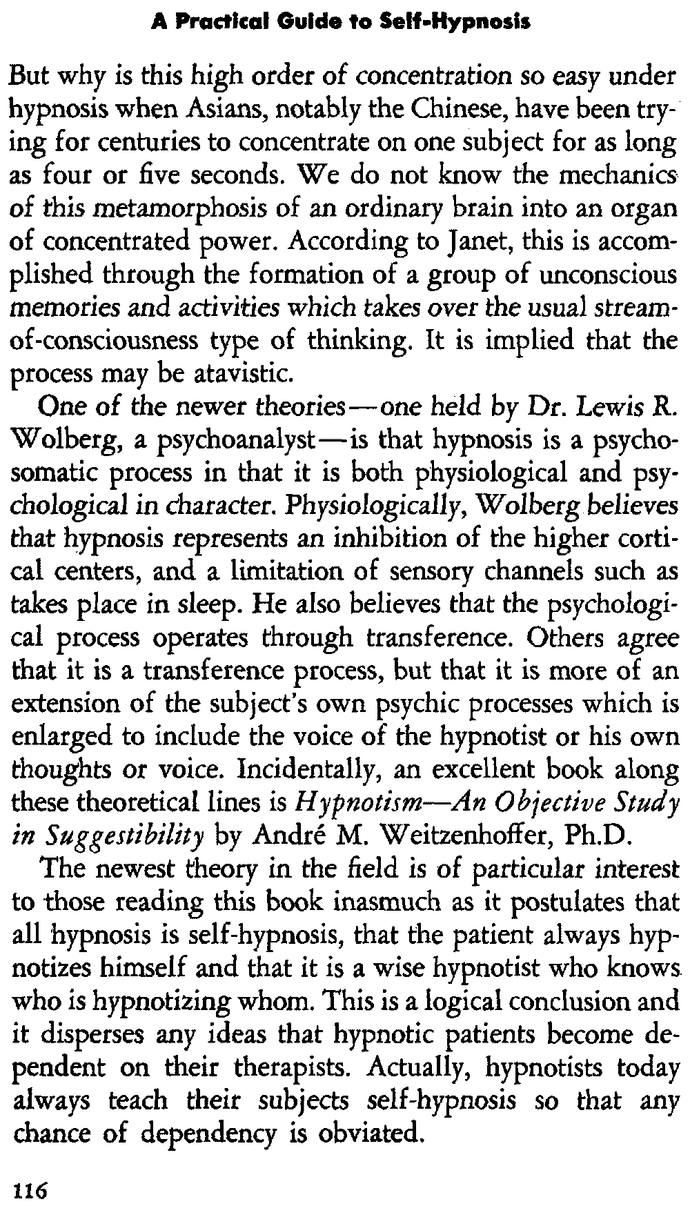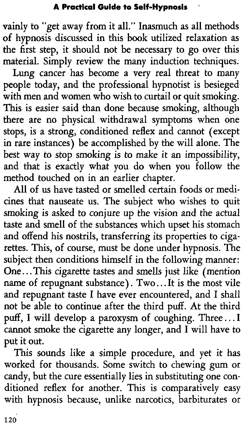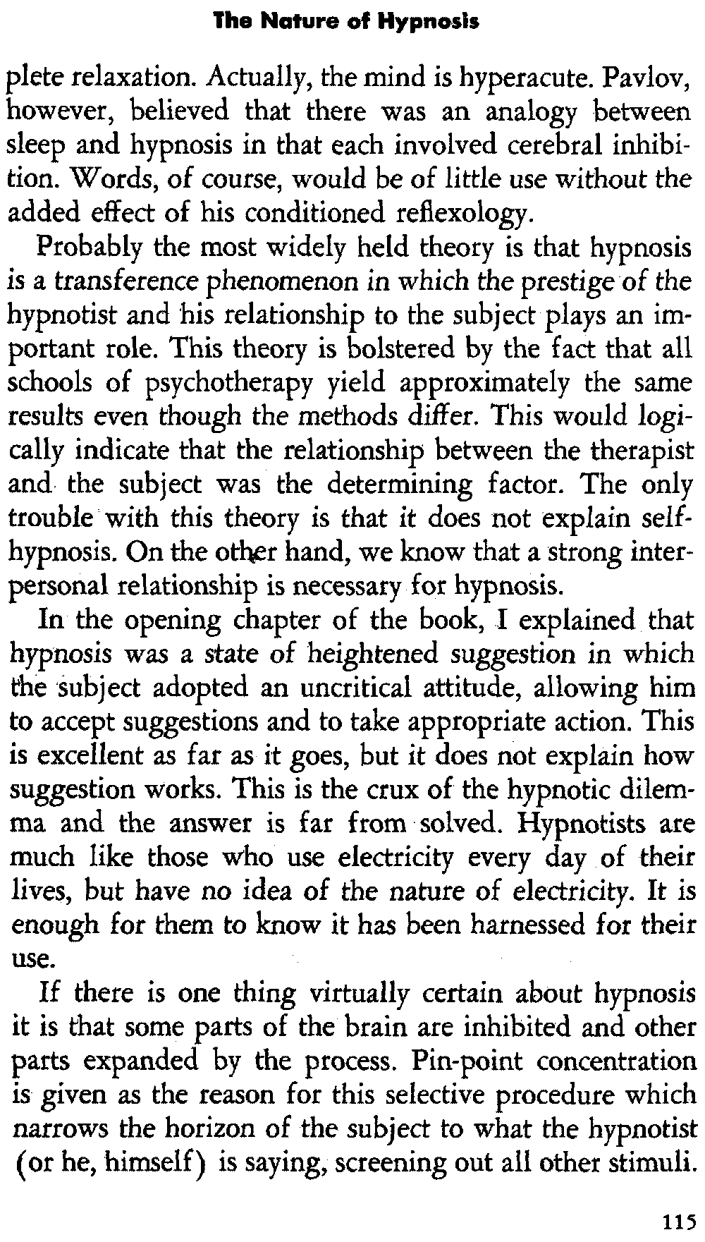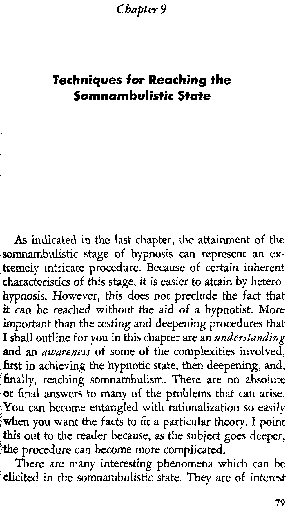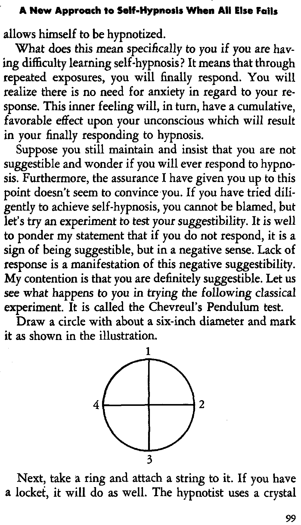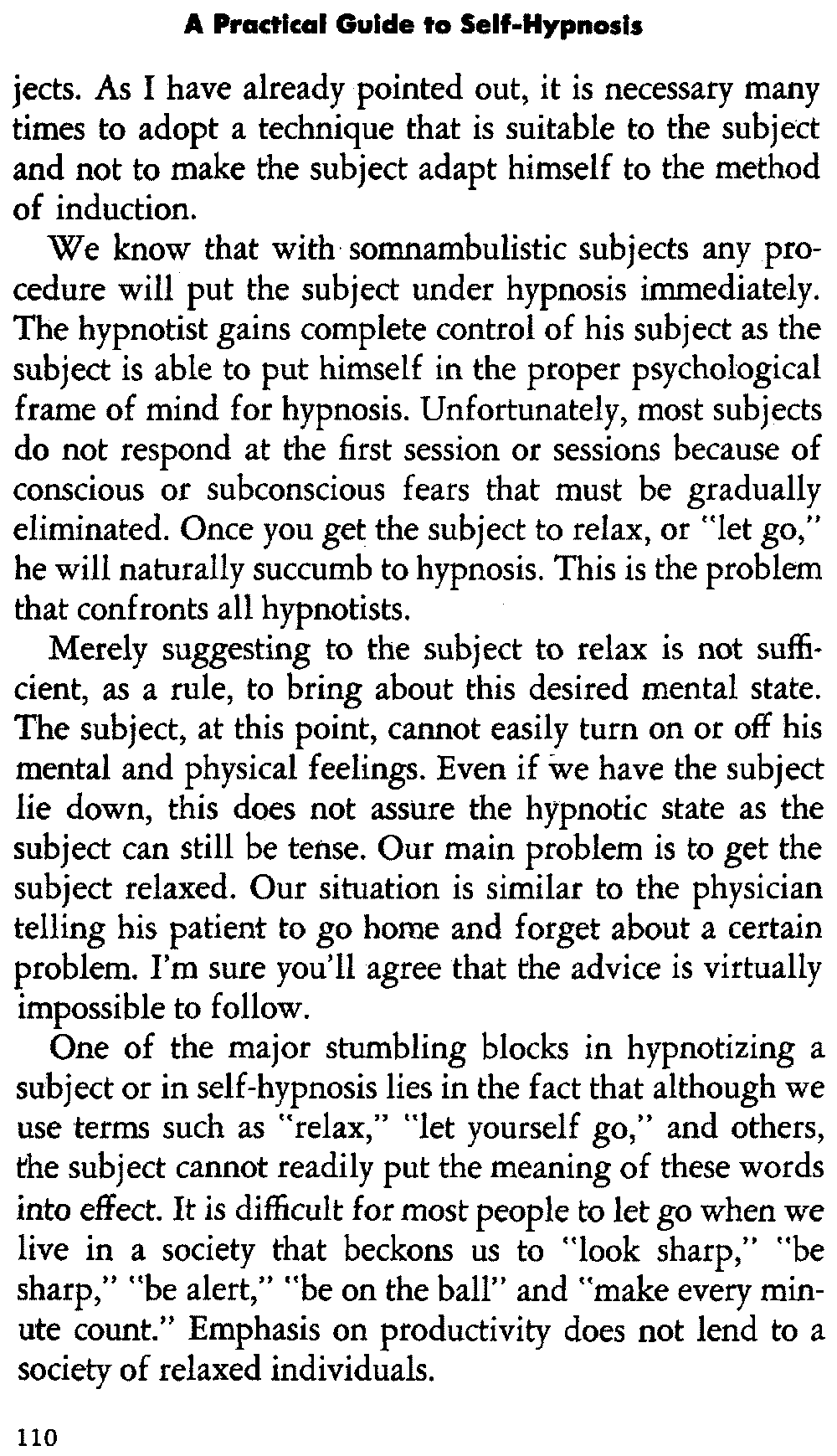 In self-hypnosis the same thing usually takes place. The subject is anxious to achieve self-hypnosis, but somehow the state eludes him. What's wrong? It may be that he is [12] unconsciously resisting it, hasn't conditioned himself sufficiently, or has achieved the hypnotic state and doesn't know he is in the state. This last statement may be surprising, but we will examine it in detail a little later on.