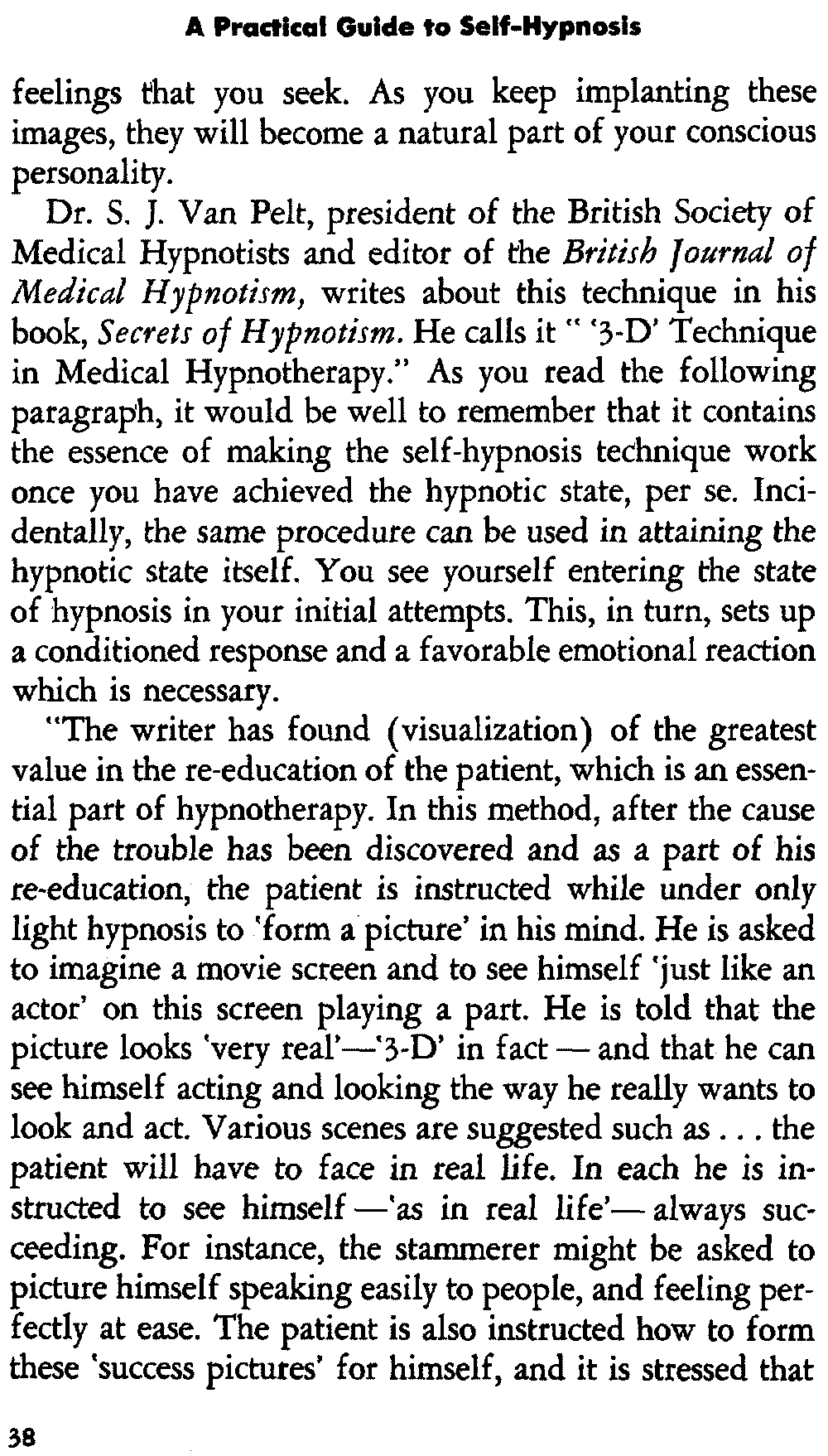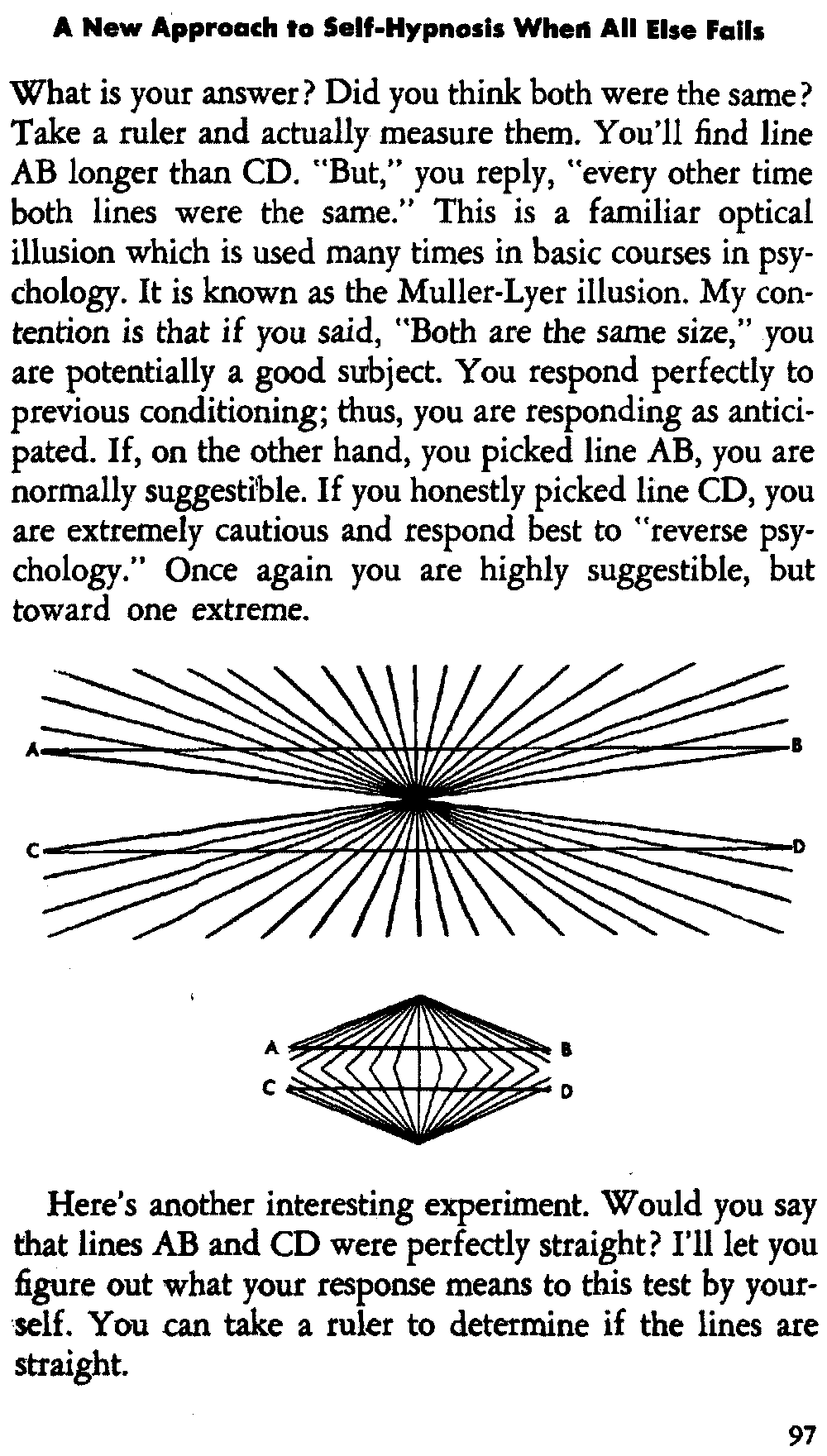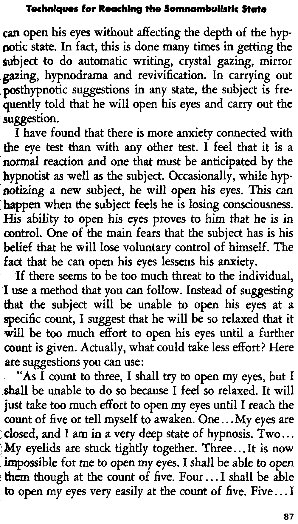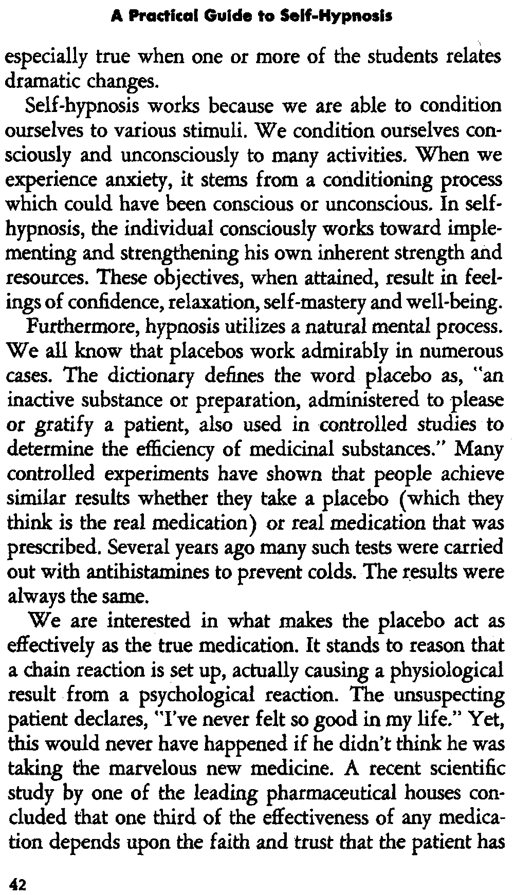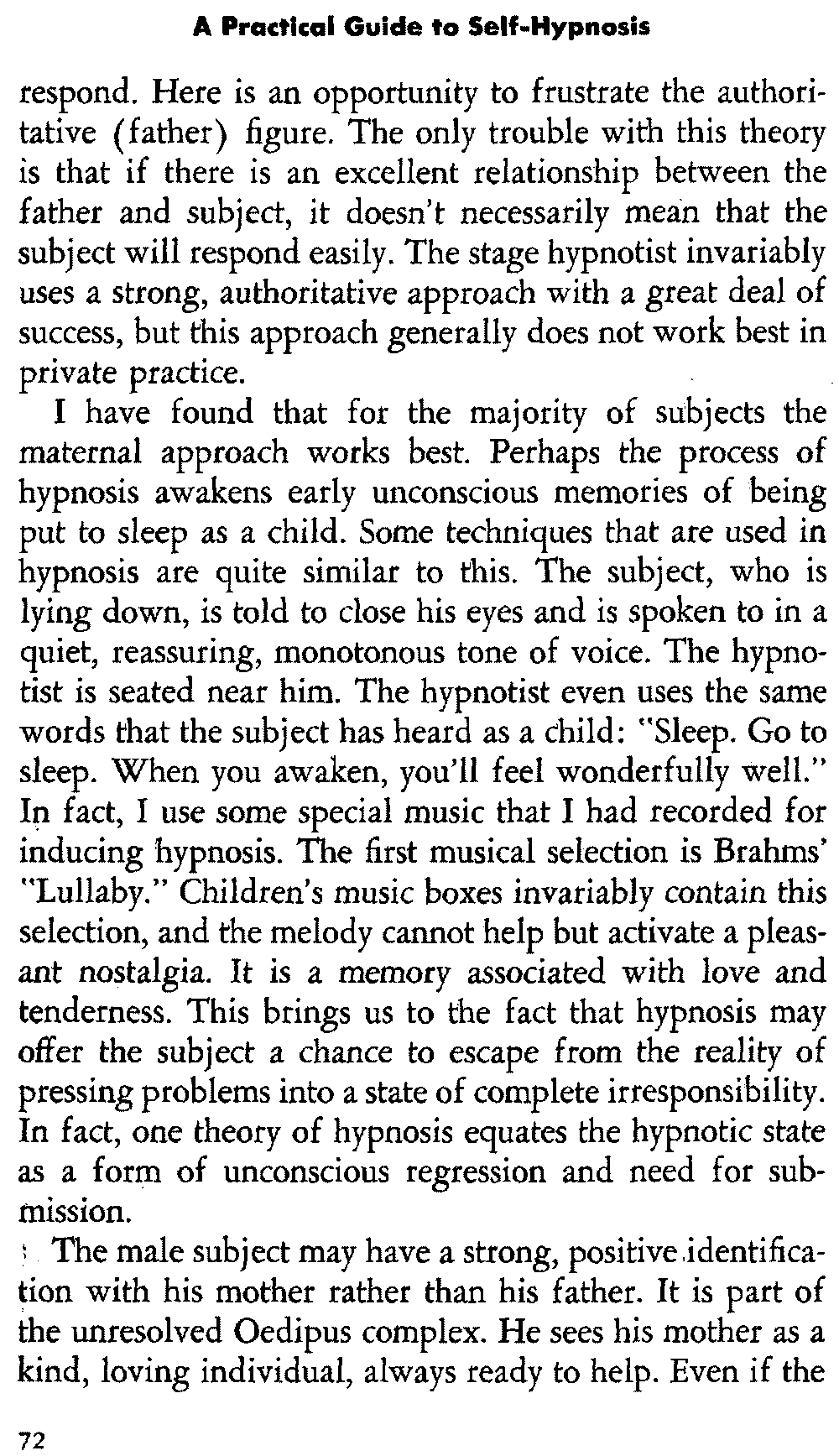 In self-hypnosis the same thing usually takes place. The subject is anxious to achieve self-hypnosis, but somehow the state eludes him. What's wrong? It may be that he is [12] unconsciously resisting it, hasn't conditioned himself sufficiently, or has achieved the hypnotic state and doesn't know he is in the state. This last statement may be surprising, but we will examine it in detail a little later on.