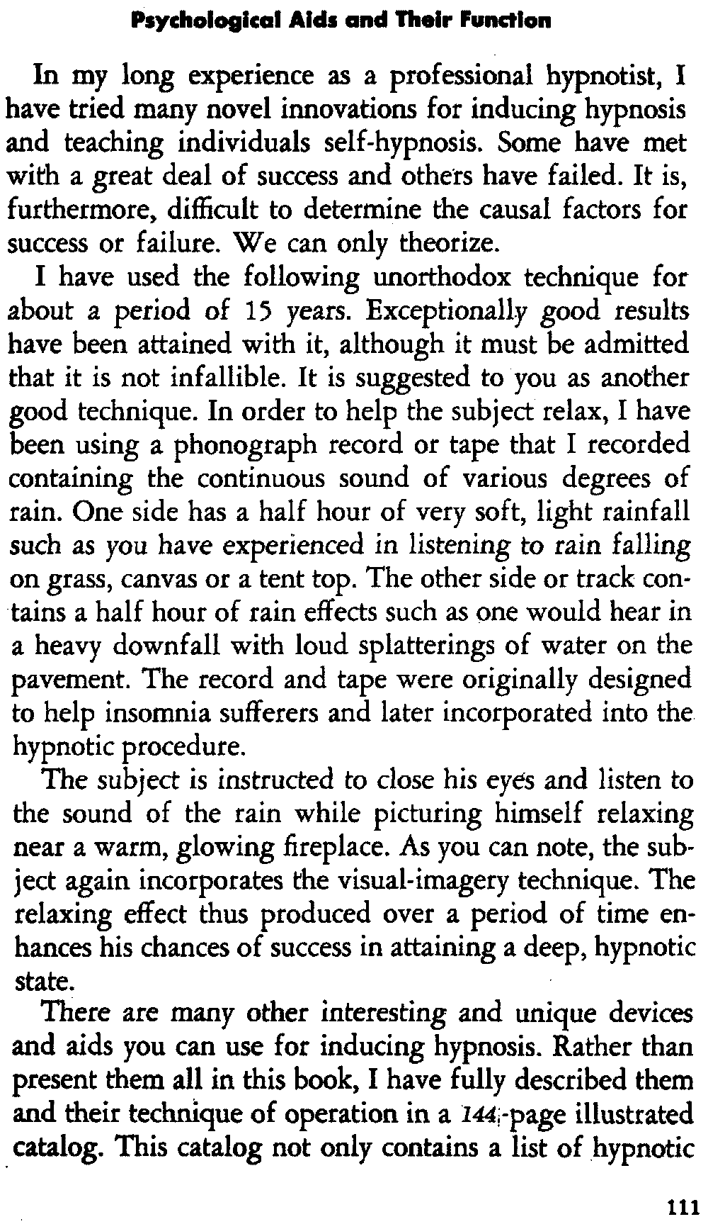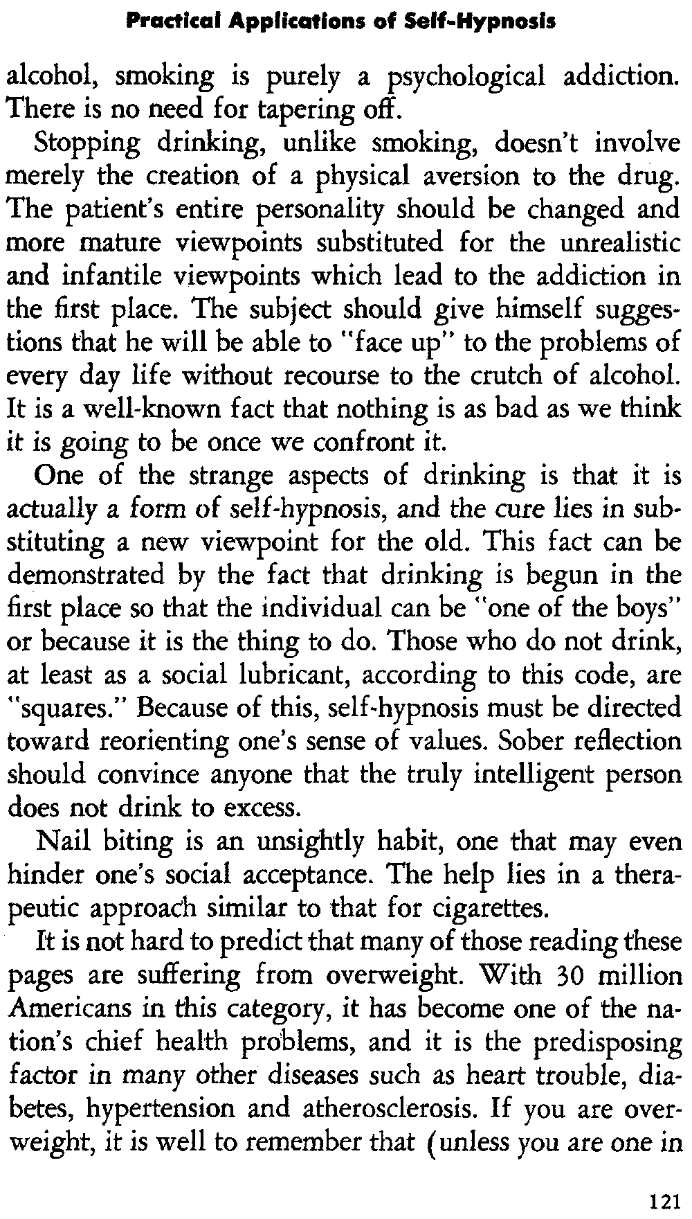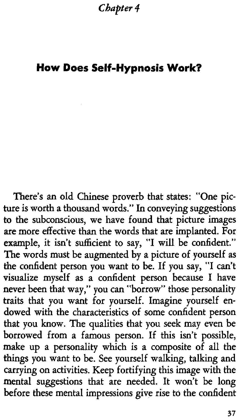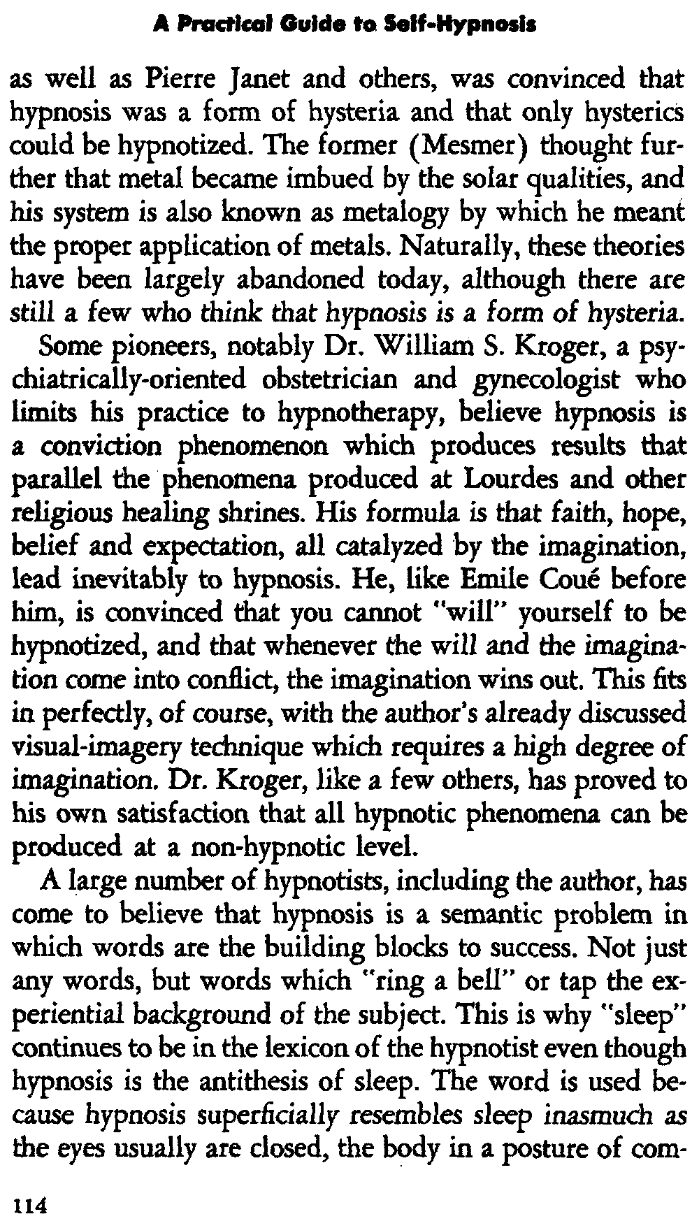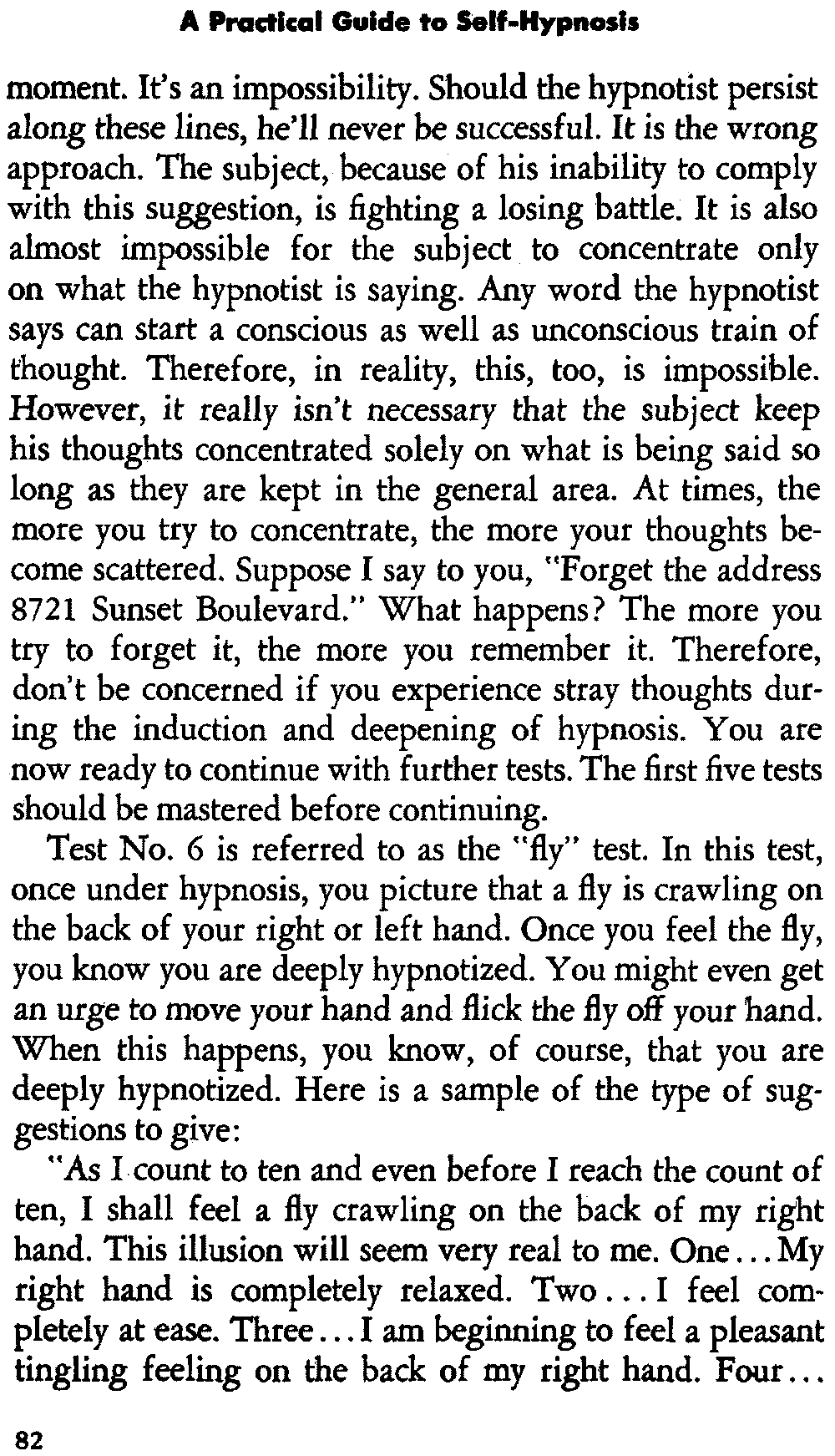 In self-hypnosis the same thing usually takes place. The subject is anxious to achieve self-hypnosis, but somehow the state eludes him. What's wrong? It may be that he is [12] unconsciously resisting it, hasn't conditioned himself sufficiently, or has achieved the hypnotic state and doesn't know he is in the state. This last statement may be surprising, but we will examine it in detail a little later on.