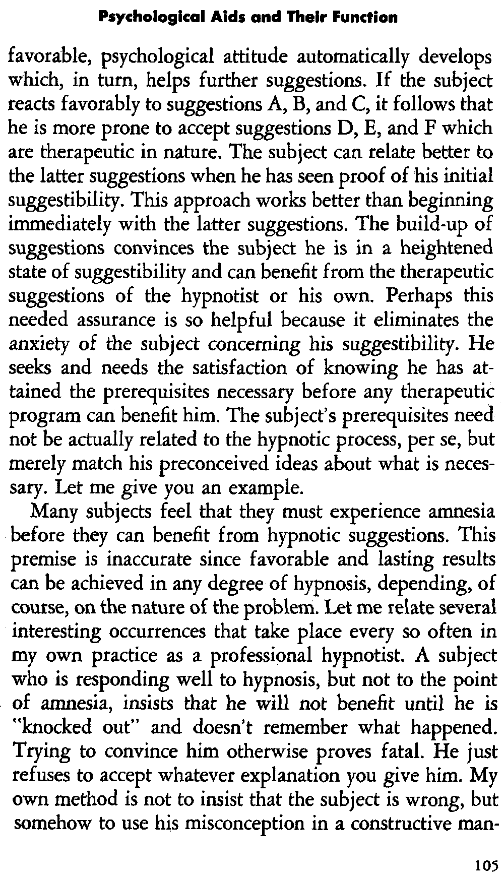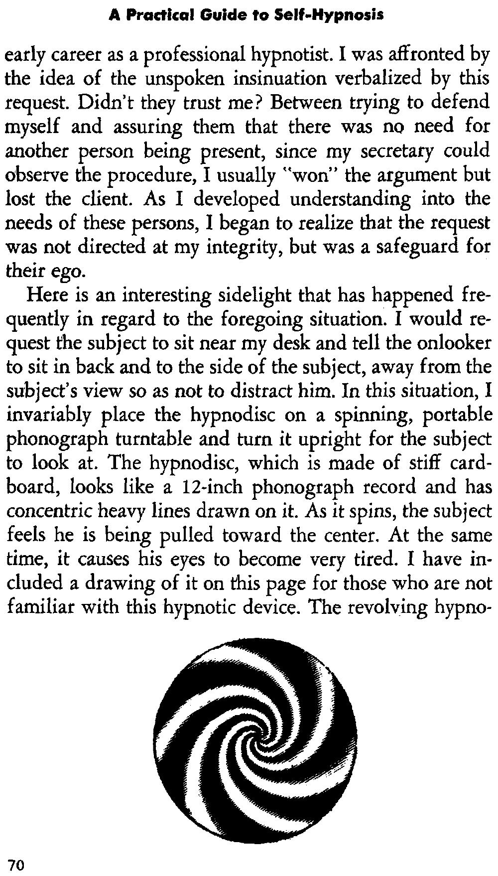 I once saw an individual about 12 times who wanted to learn self-hypnosis and had been unsuccessful in every approach. I asked him if he would volunteer as a subject for a class in techniques of hypnosis that I was teaching for nurses. He readily volunteered and showed up at the designated time. Much to my amazement as well as his own, he responded within a relatively short time as one of the nurses hypnotized him before the group. She had used a standard eye closure technique, requesting him to look [18] at a spinning hypnodisc that I had previously used with him every time he was in the office. Her manner was extremely affable, she had used the identical technique I had used unsuccessfully, and the subject responded excellently to cap the climax. He was the first subject the nurse had ever hypnotized, since this was only her third lesson.