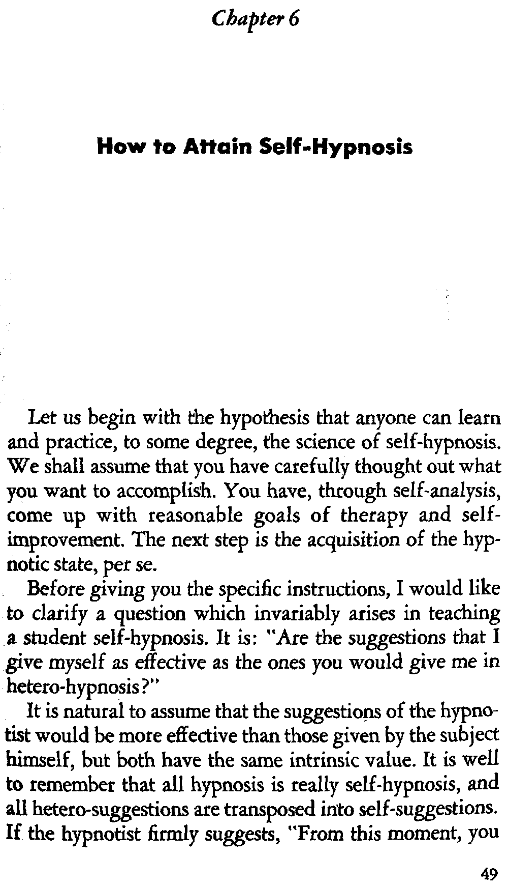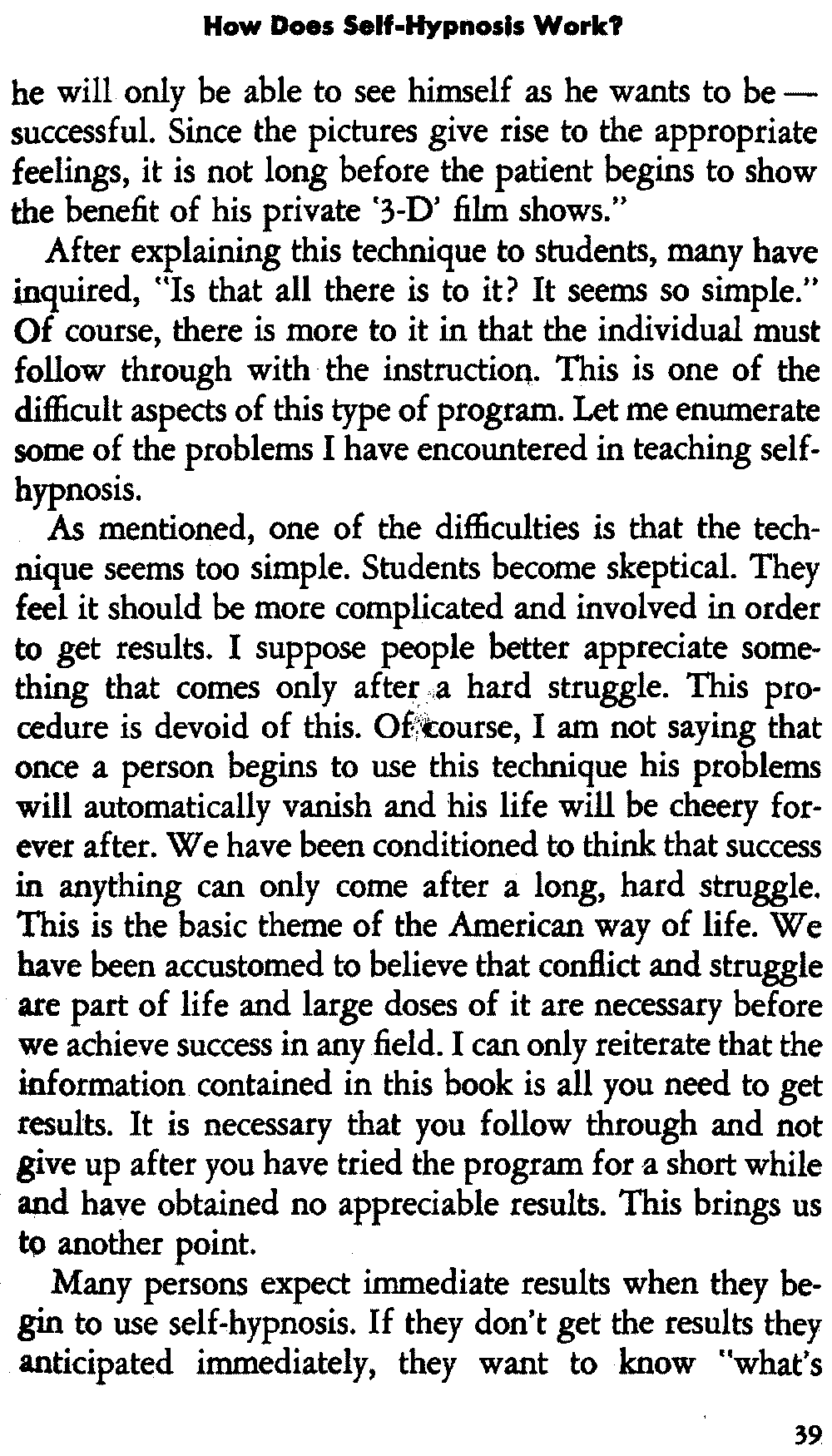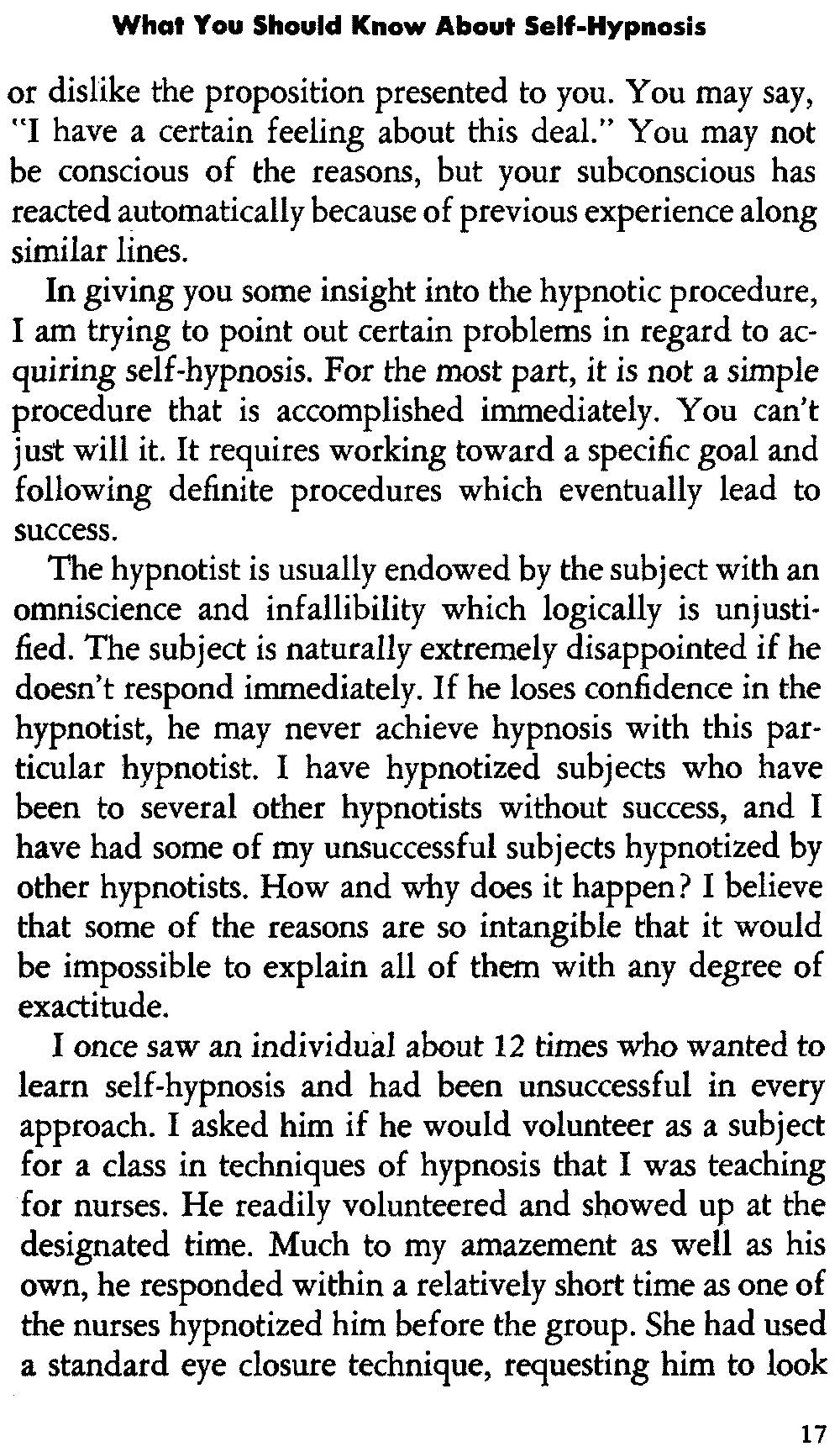 In giving you some insight into the hypnotic procedure, I am trying to point out certain problems in regard to acquiring self-hypnosis. For the most part, it is not a simple procedure that is accomplished immediately. You can't just will it. It requires working toward a specific goal and following definite procedures which eventually lead to success.