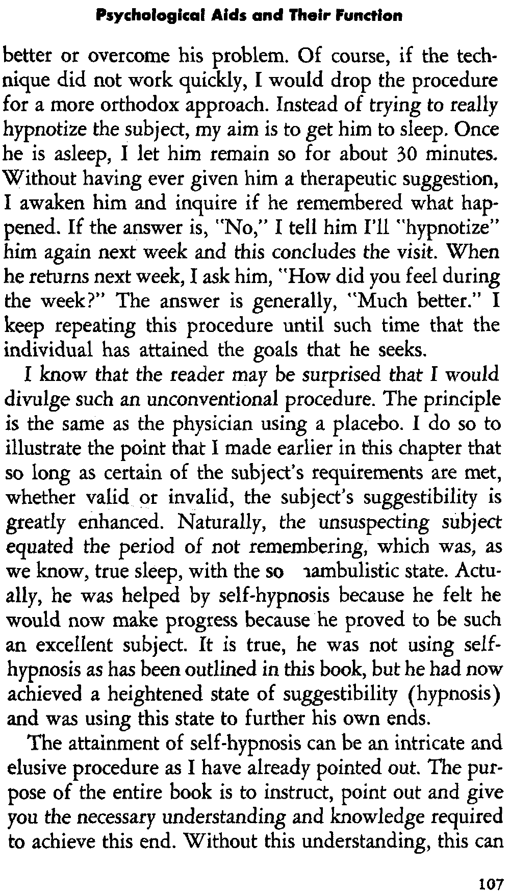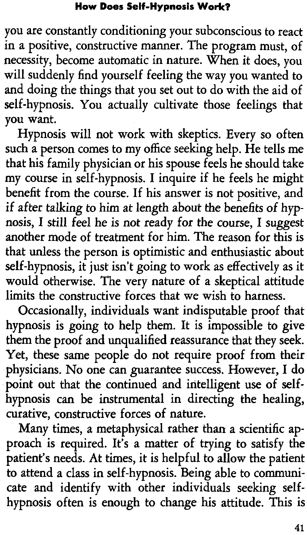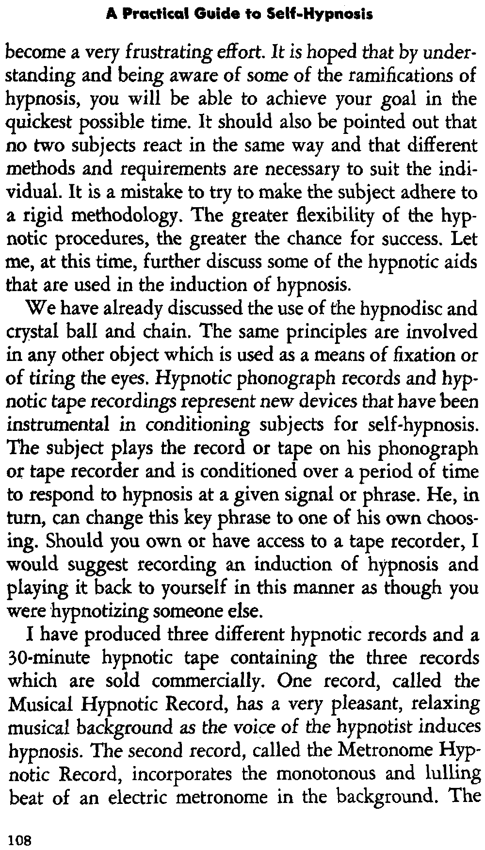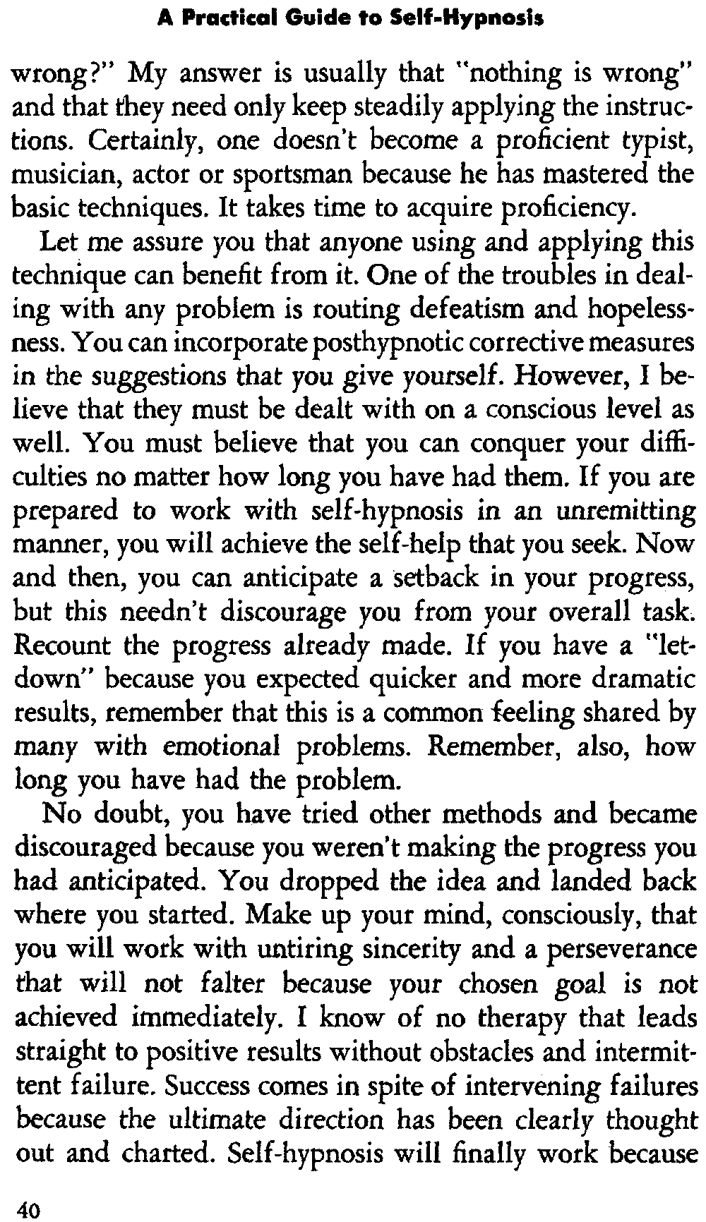 In giving you some insight into the hypnotic procedure, I am trying to point out certain problems in regard to acquiring self-hypnosis. For the most part, it is not a simple procedure that is accomplished immediately. You can't just will it. It requires working toward a specific goal and following definite procedures which eventually lead to success.