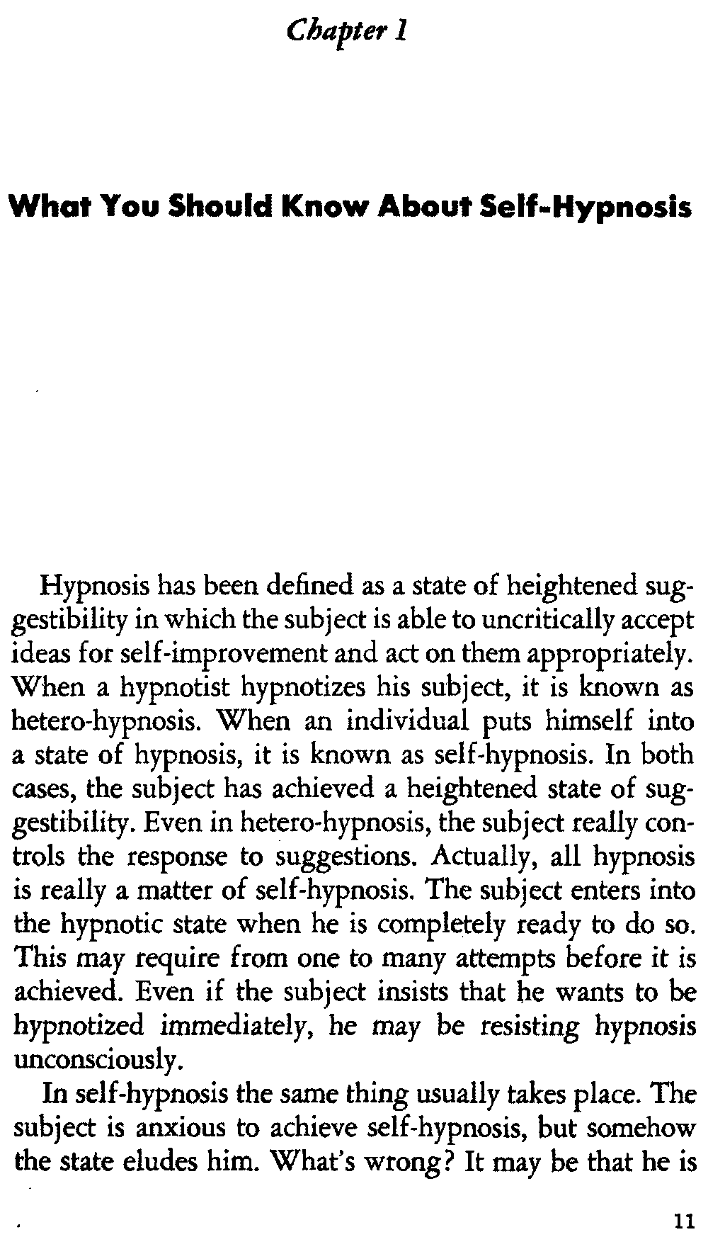 Hypnosis has been defined as a state of heightened suggestibility in which the subject is able to uncritically accept ideas for self-improvement and act on them appropriately. When a hypnotist hypnotizes his subject, it is known as hetero-hypnosis. When an individual puts himself into a state of hypnosis, it is known as self-hypnosis. In both cases, the subject has achieved a heightened state of suggestibility. Even in hetero-hypnosis, the subject really controls the response to suggestions. Actually, all hypnosis is really a matter of self-hypnosis. The subject enters into the hypnotic state when he is completely ready to do so. This may require from one to many attempts before it is achieved. Even if the subject insists that he wants to be hypnotized immediately, he may be resisting hypnosis unconsciously.