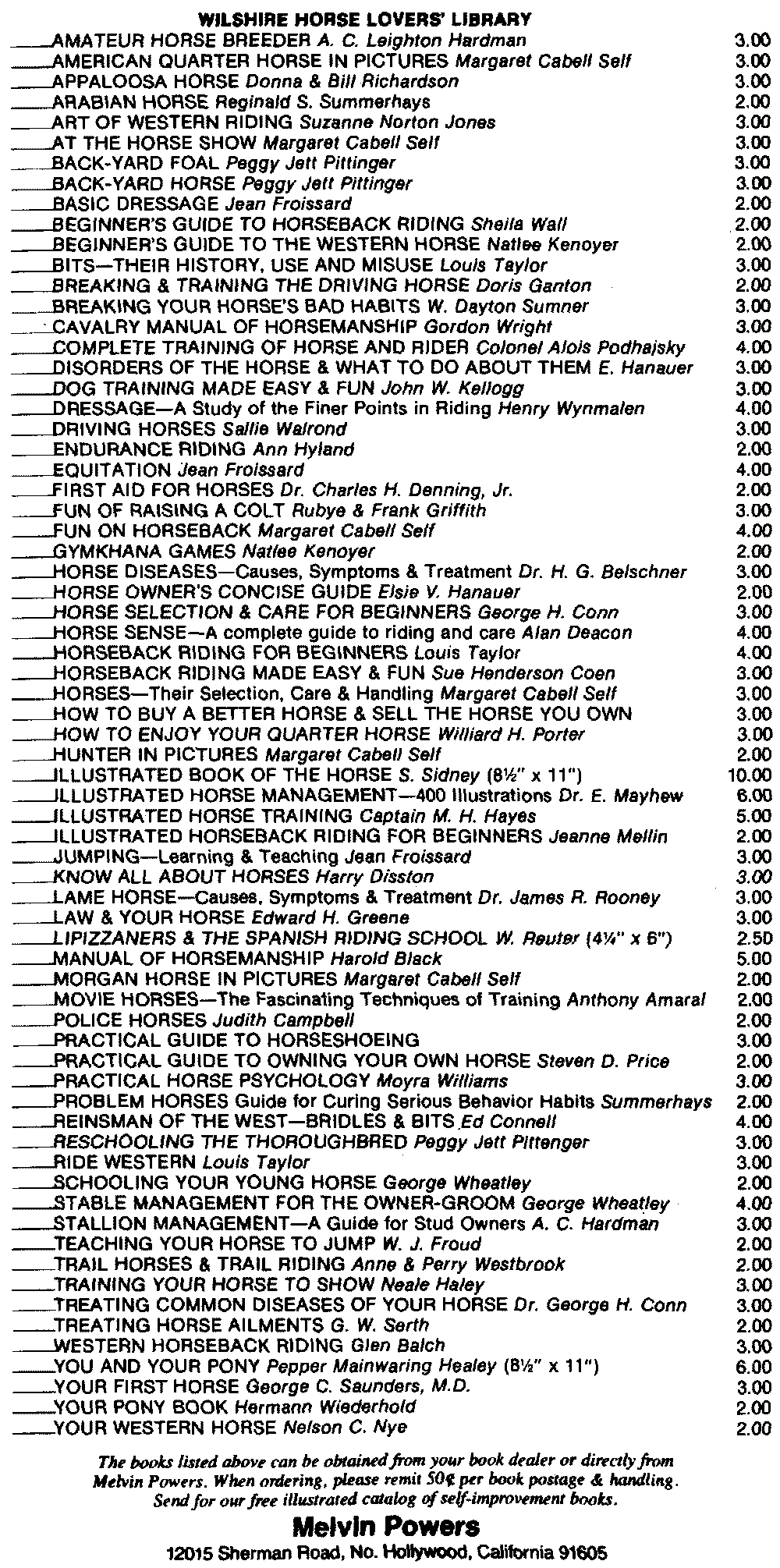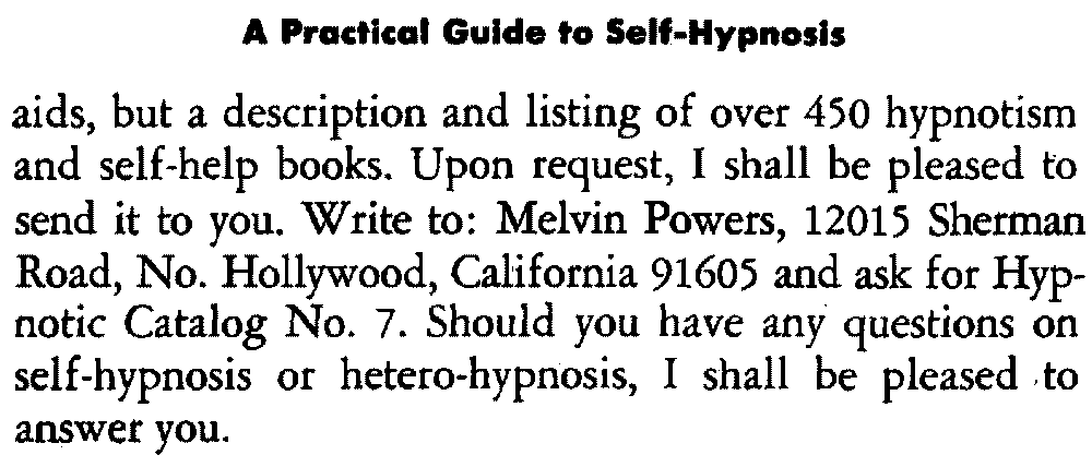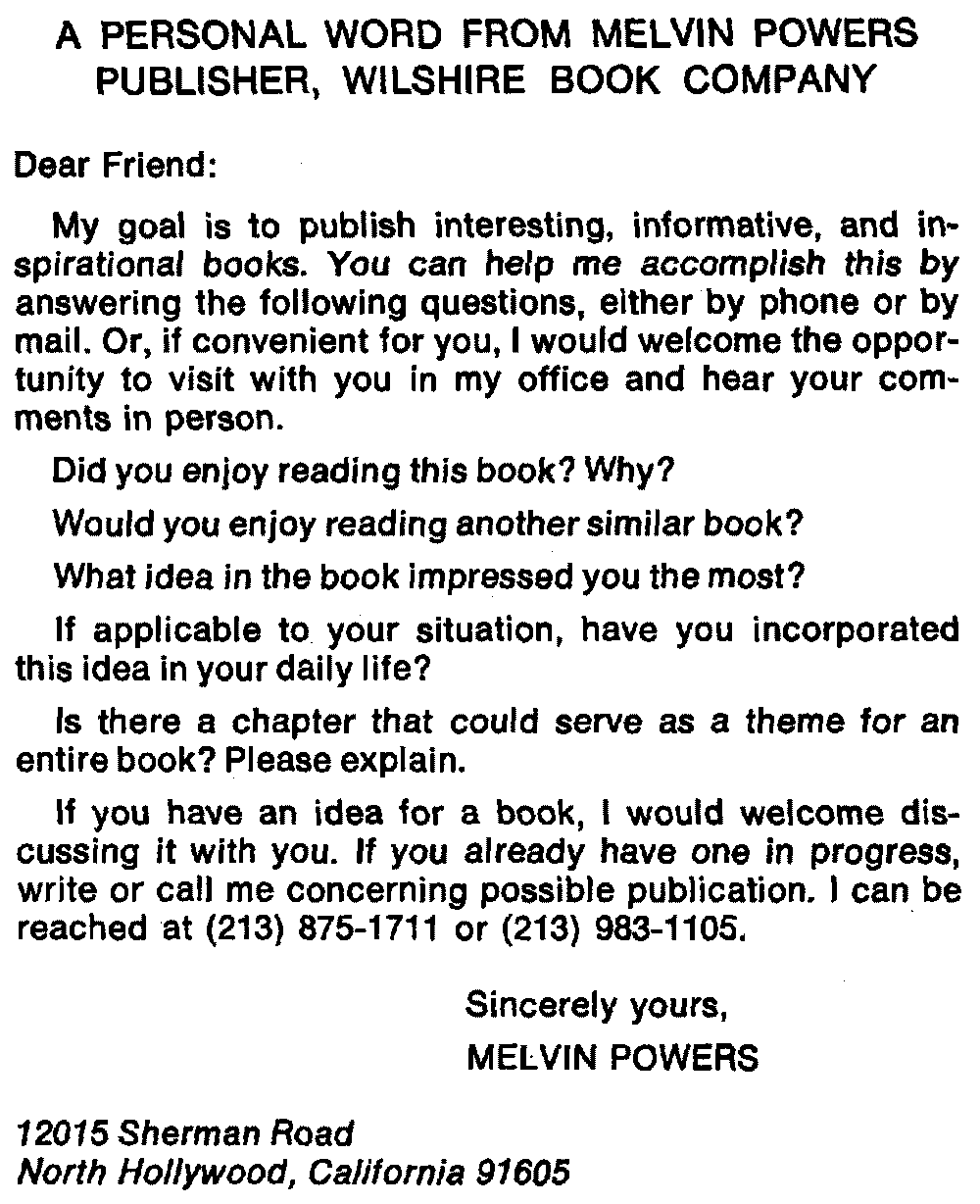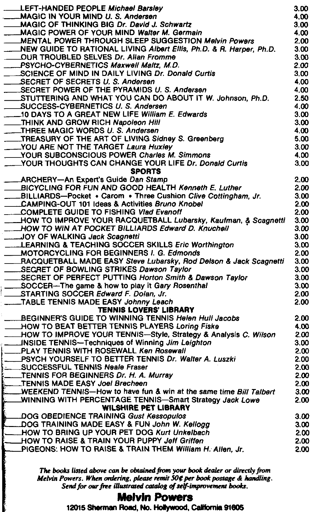 The books listed above can be obtained from your book dealer or directly from Melvin Powers. When ordering, please remit 50¢ per book postage & handling. Send for our free illustrated catalog of self improvement books.