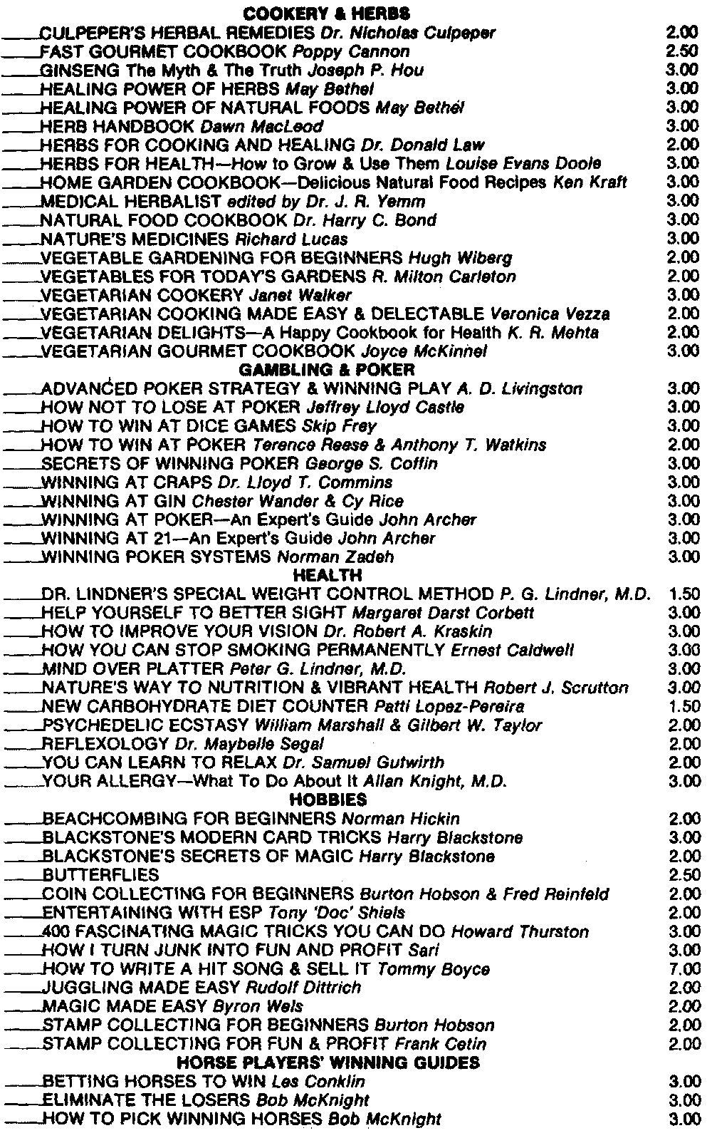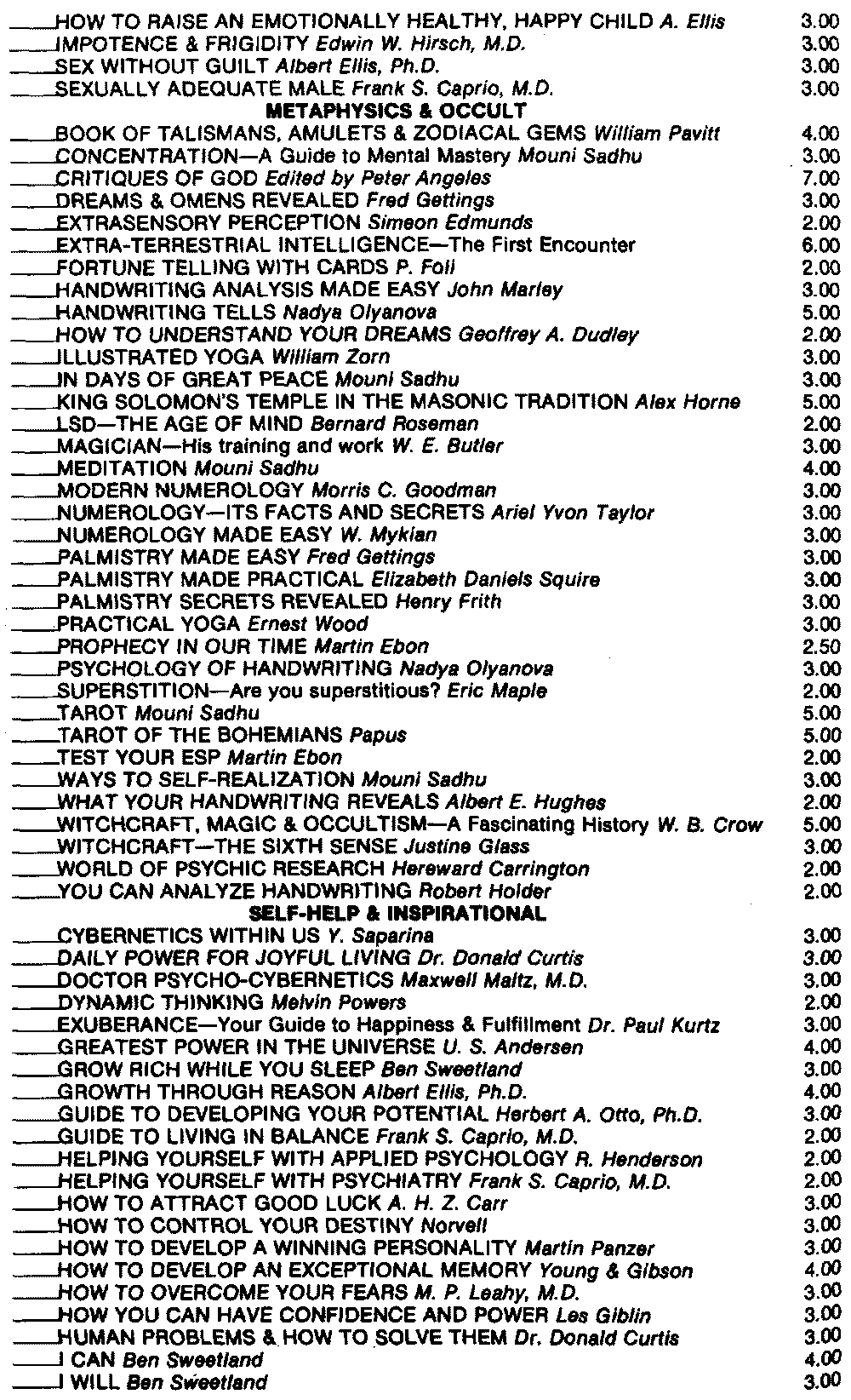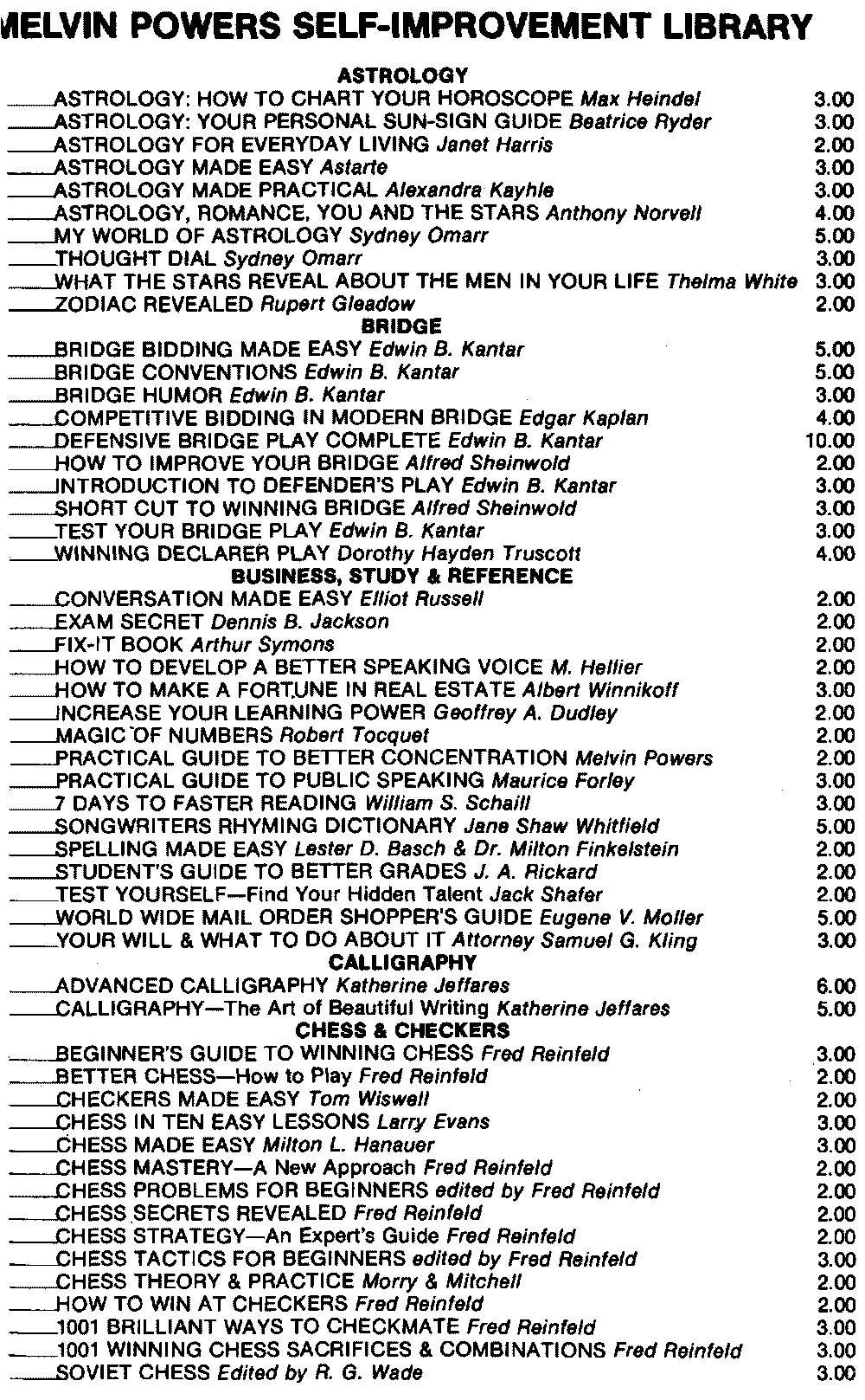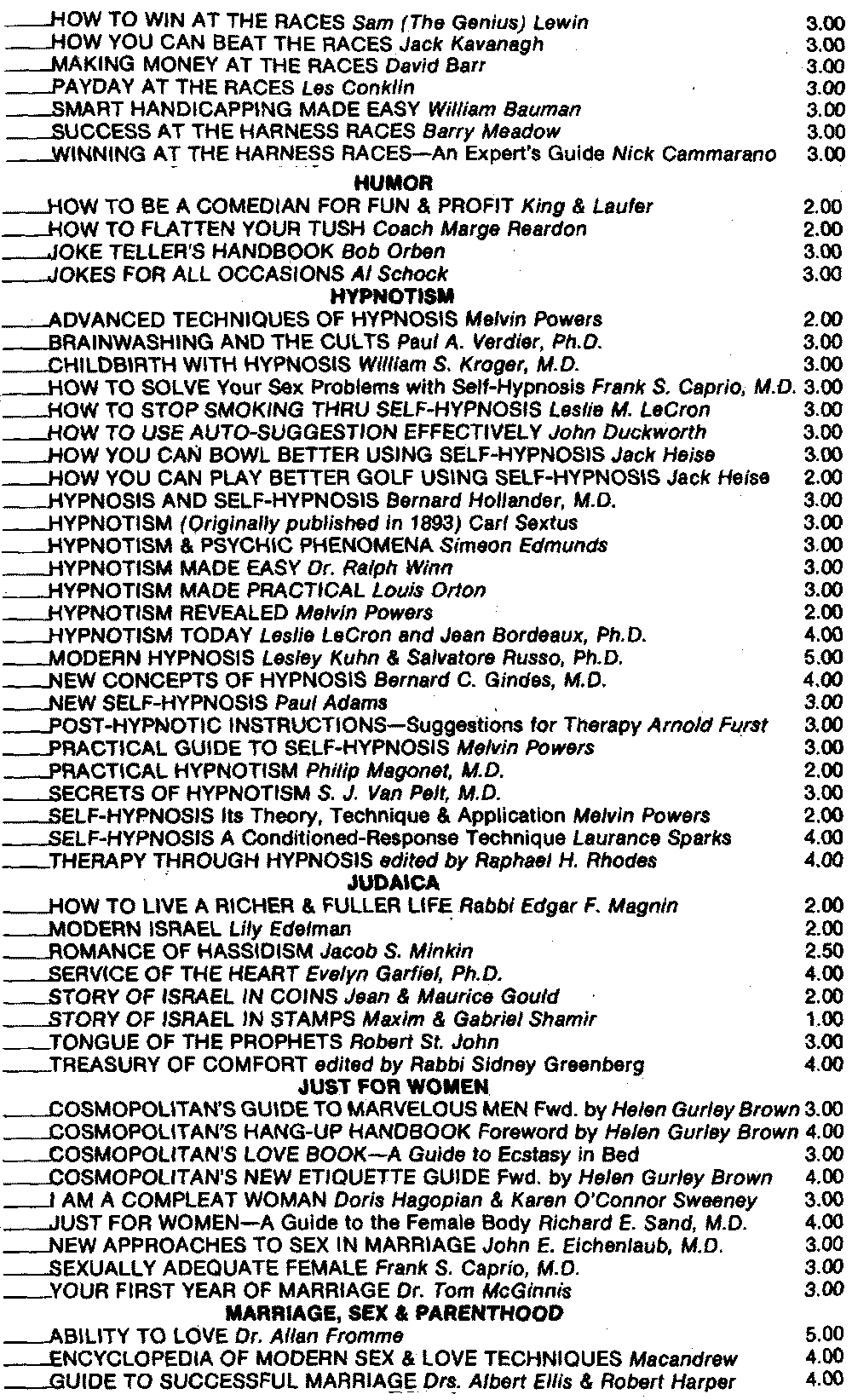 The books listed above can be obtained from your book dealer or directly from Melvin Powers. When ordering, please remit 50¢ per book postage & handling. Send for our free illustrated catalog of self improvement books.