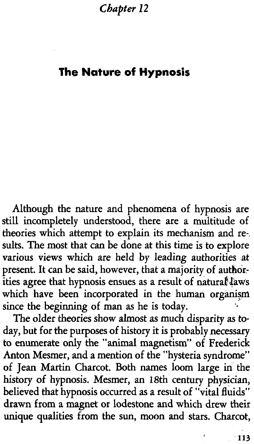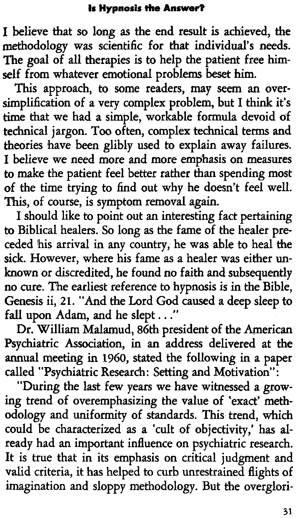 I should like to point out an interesting fact pertaining to Biblical healers. So long as the fame of the healer preceded his arrival in any country, he was able to heal the sick. However, where his fame as a healer was either unknown or discredited, he found no faith and subsequently no cure. The earliest reference to hypnosis is in the Bible, Genesis ii, 21. "And the Lord God caused a deep sleep to fall upon Adam, and he slept..."
