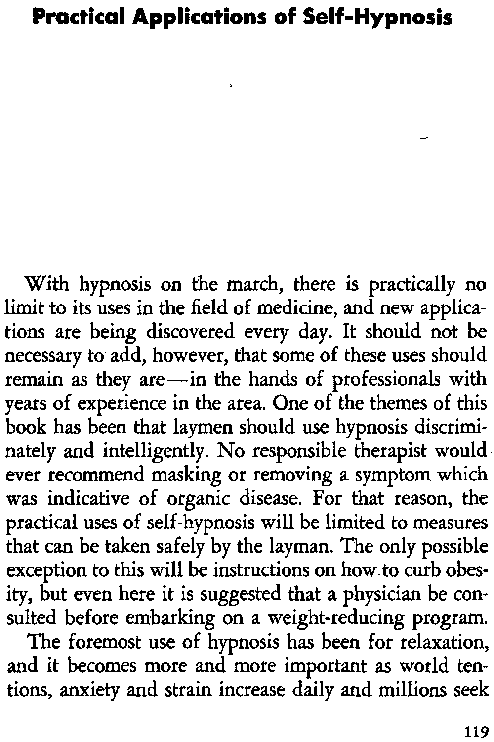 A further objection to hypnosis is that the results are temporary as well as symptomatic. It is well to remember that most medical therapy is specifically directed to symptom removal. How permanent is most medical treatment? Once you couple hetero-hypnosis with self-hypnosis, you afford the patient the opportunity of utilizing suggestions for his own benefit any time they are needed. This, [23] of course, can make symptom relief permanent. As an example, I would see no harm in teaching a patient self-hypnosis for symptomatic relief from a problem of insomnia. It would certainly be better than physically depressing the higher brain centers with sleeping pills to produce unconsciousness every night. I needn't tell you that millions of dollars are spent every year on sleeping pills and patients become dependent upon them, needing more and more pills in order to produce sleep. Many accidental suicides stem from an overdose of sleeping pills. Yet, despite the inherent dangers of sleeping pills which are glaringly apparent, they are prescribed by the millions, to say nothing of those that reach the market through illegal channels. Furthermore, how much effort is really made to get the patient off the sleeping pills? There are also more voluntary suicides by sleeping pills than by any other method. Perhaps if these drugs weren't so readily available, many of these unfortunate individuals would be with us today.