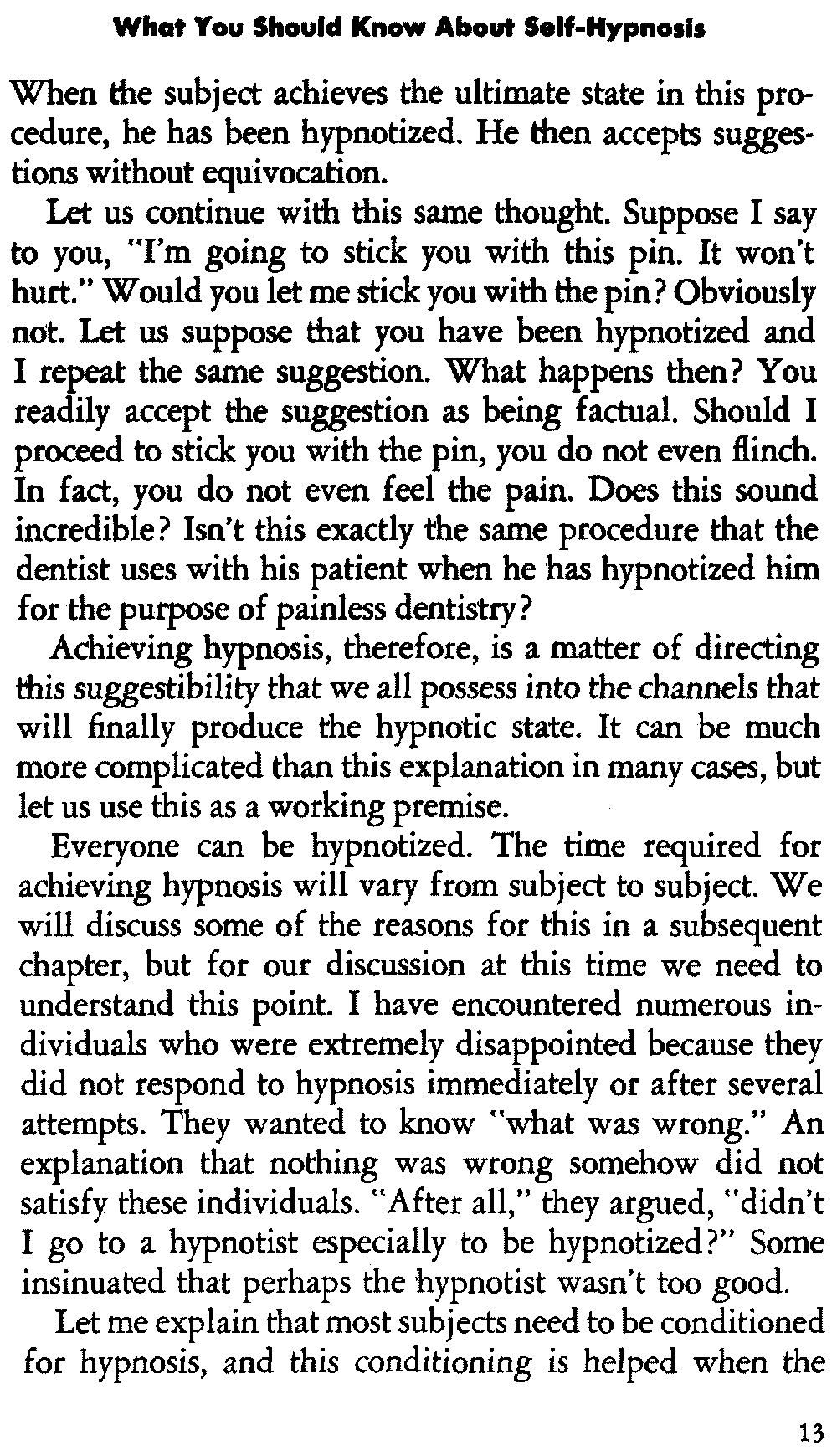 Let us continue with this same thought. Suppose I say to you, "I'm going to stick you with this pin. It won't hurt." Would you let me stick you with the pin? Obviously not. Let us suppose that you have been hypnotized and I repeat the same suggestion. What happens then? You readily accept the suggestion as being factual. Should I proceed to stick you with the pin, you do not even flinch. In fact, you do not even feel the pain. Does this sound incredible? Isn't this exactly the same procedure that the dentist uses with his patient when he has hypnotized him for the purpose of painless dentistry?
