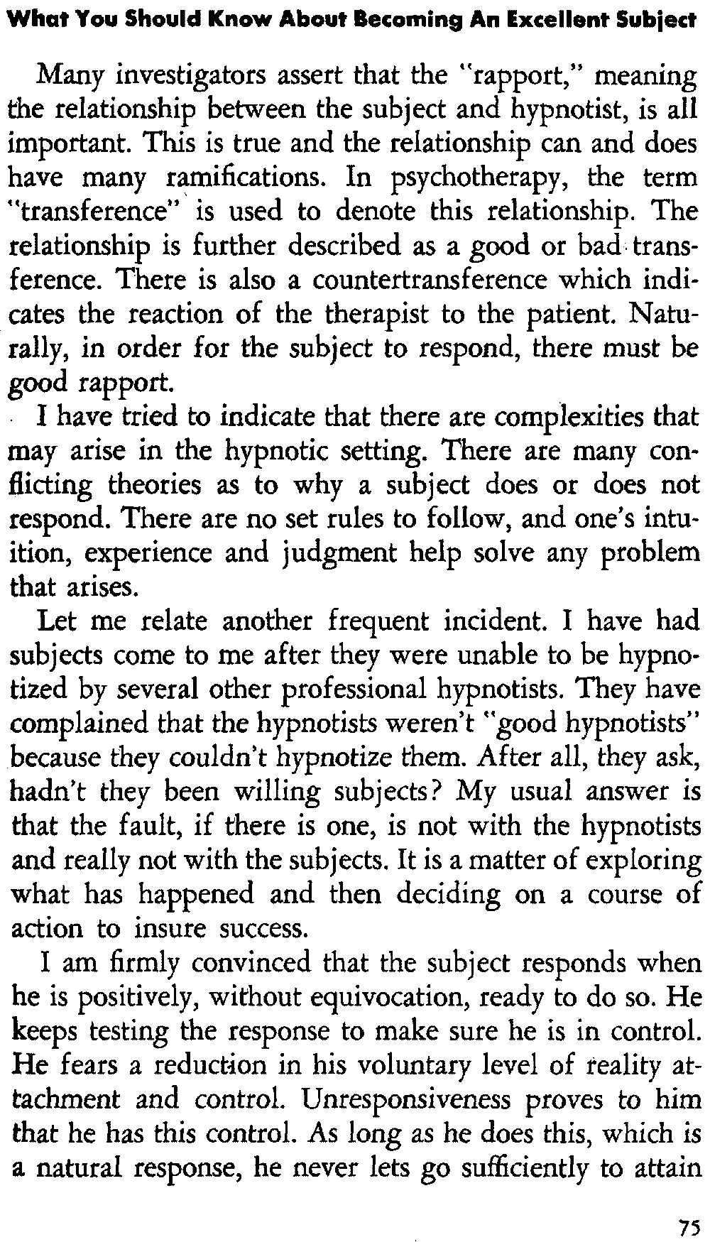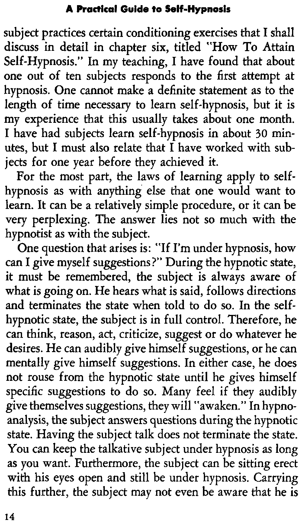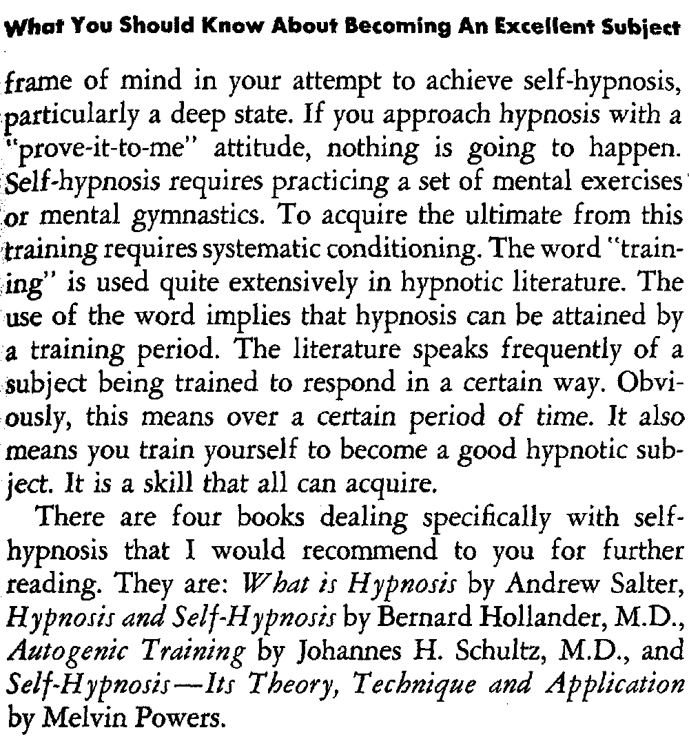 Let me explain that most subjects need to be conditioned for hypnosis, and this conditioning is helped when the [14] subject practices certain conditioning exercises that I shall discuss in detail in chapter six, titled "How To Attain Self-Hypnosis." In my teaching, I have found that about one out of ten subjects responds to the first attempt at hypnosis. One cannot make a definite statement as to the length of time necessary to learn self-hypnosis, but it is my experience that this usually takes about one month. I have had subjects learn self-hypnosis in about 30 minutes, but I must also relate that I have worked with subjects for one year before they achieved it.