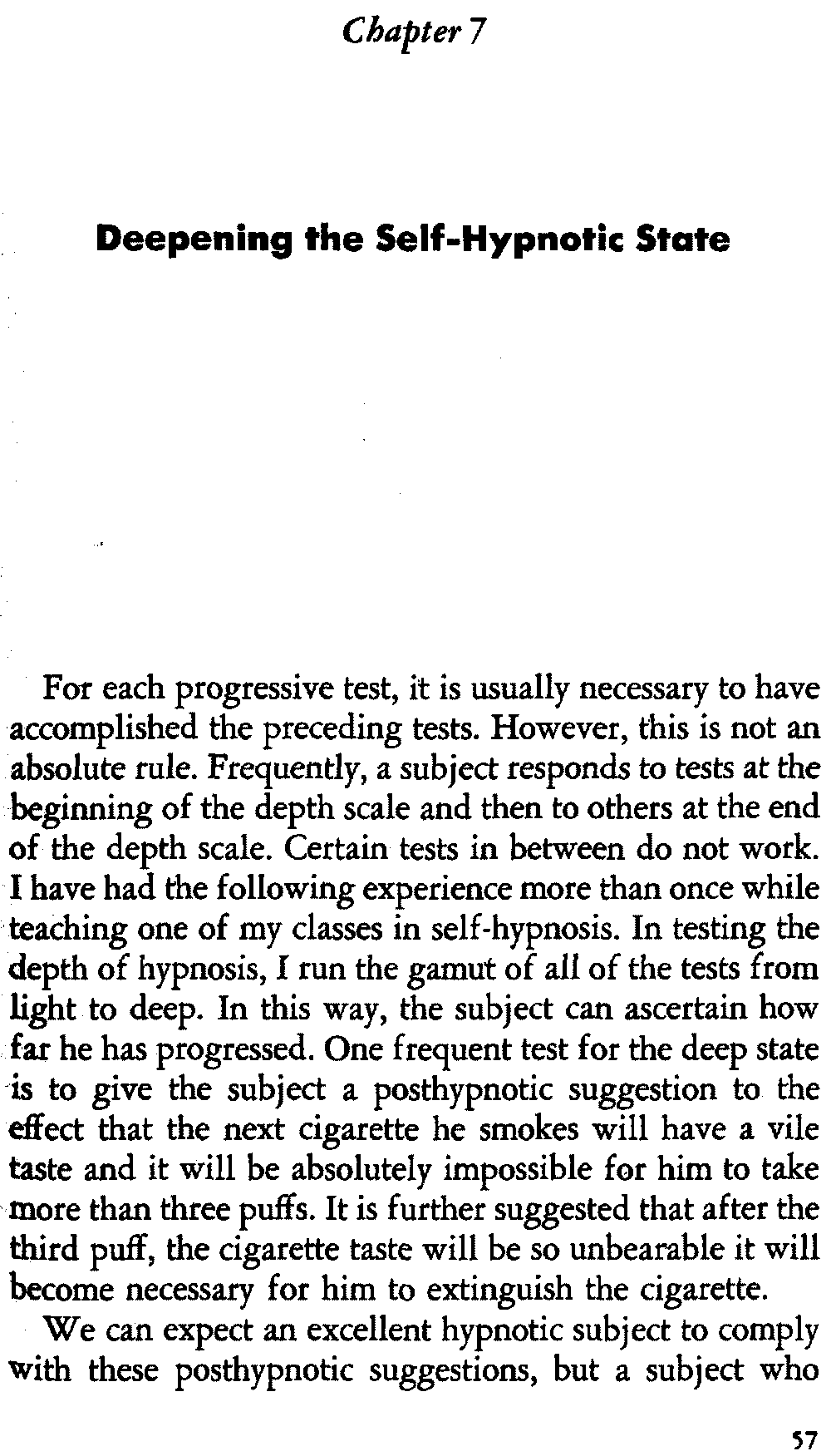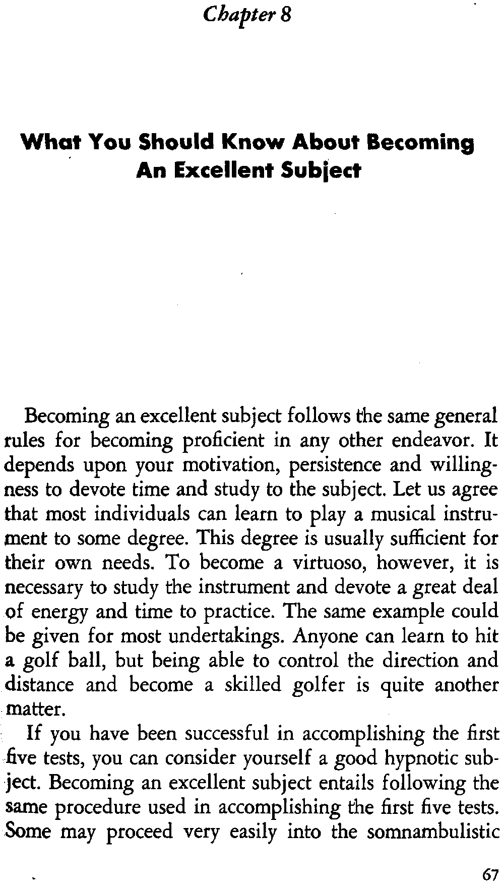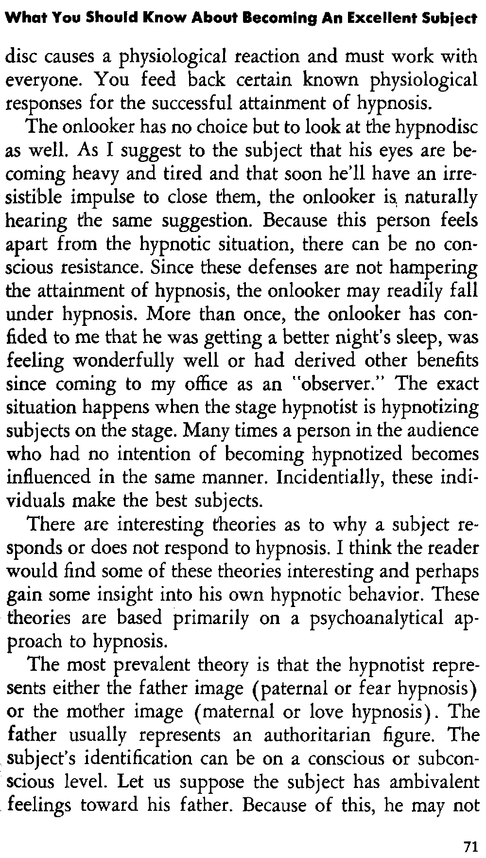 Let me explain that most subjects need to be conditioned for hypnosis, and this conditioning is helped when the [14] subject practices certain conditioning exercises that I shall discuss in detail in chapter six, titled "How To Attain Self-Hypnosis." In my teaching, I have found that about one out of ten subjects responds to the first attempt at hypnosis. One cannot make a definite statement as to the length of time necessary to learn self-hypnosis, but it is my experience that this usually takes about one month. I have had subjects learn self-hypnosis in about 30 minutes, but I must also relate that I have worked with subjects for one year before they achieved it.