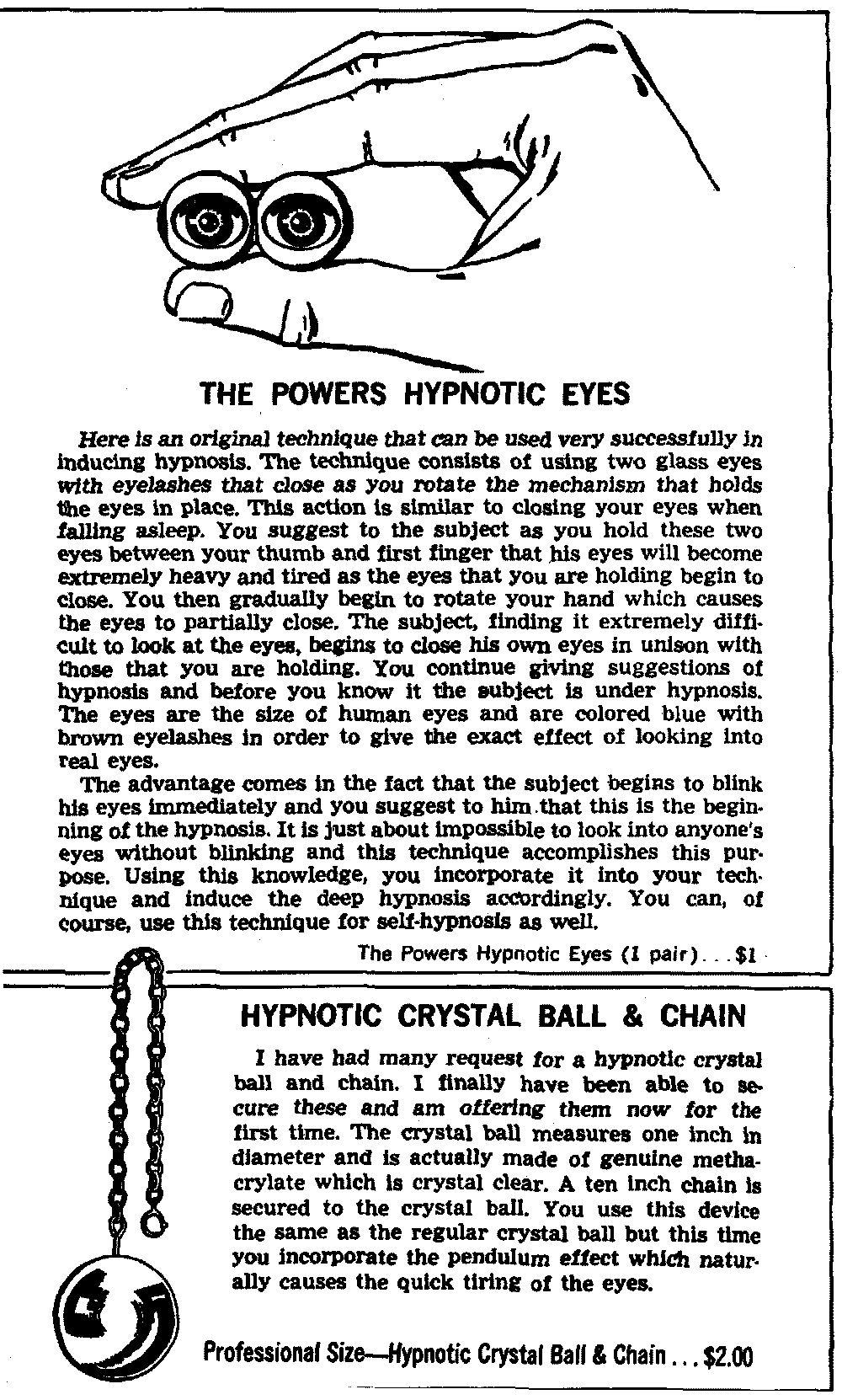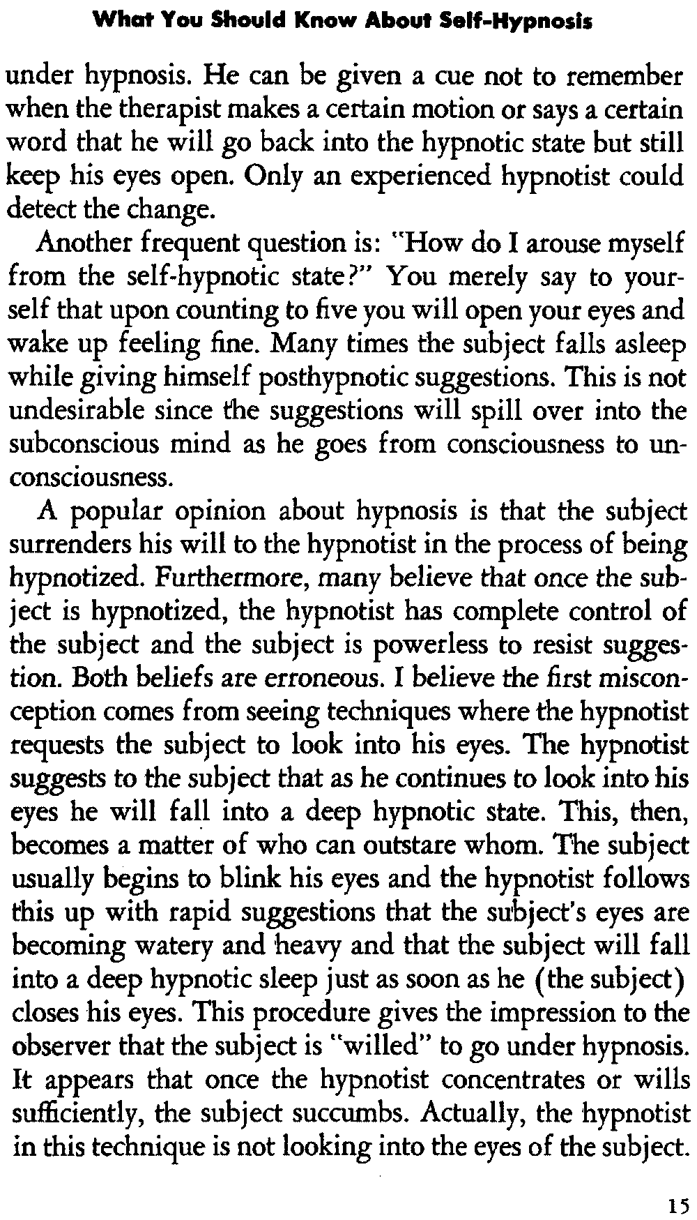 A popular opinion about hypnosis is that the subject surrenders his will to the hypnotist in the process of being hypnotized. Furthermore, many believe that once the subject is hypnotized, the hypnotist has complete control of the subject and the subject is powerless to resist suggestion. Both beliefs are erroneous. I believe the first misconception comes from seeing techniques where the hypnotist requests the subject to look into his eyes. The hypnotist suggests to the subject that as he continues to look into his eyes he will fall into a deep hypnotic state. This, then, becomes a matter of who can outstare whom. The subject usually begins to blink his eyes and the hypnotist follows this up with rapid suggestions that the subject's eyes are becoming watery and heavy and that the subject will fall into a deep hypnotic sleep just as soon as he (the subject) closes his eyes. This procedure gives the impression to the observer that the subject is "willed" to go under hypnosis. It appears that once the hypnotist concentrates or wills sufficiently, the subject succumbs. Actually, the hypnotist in this technique is not looking into the eyes of the subject. [16] He fixes his attention on the bridge of the nose of the subject.