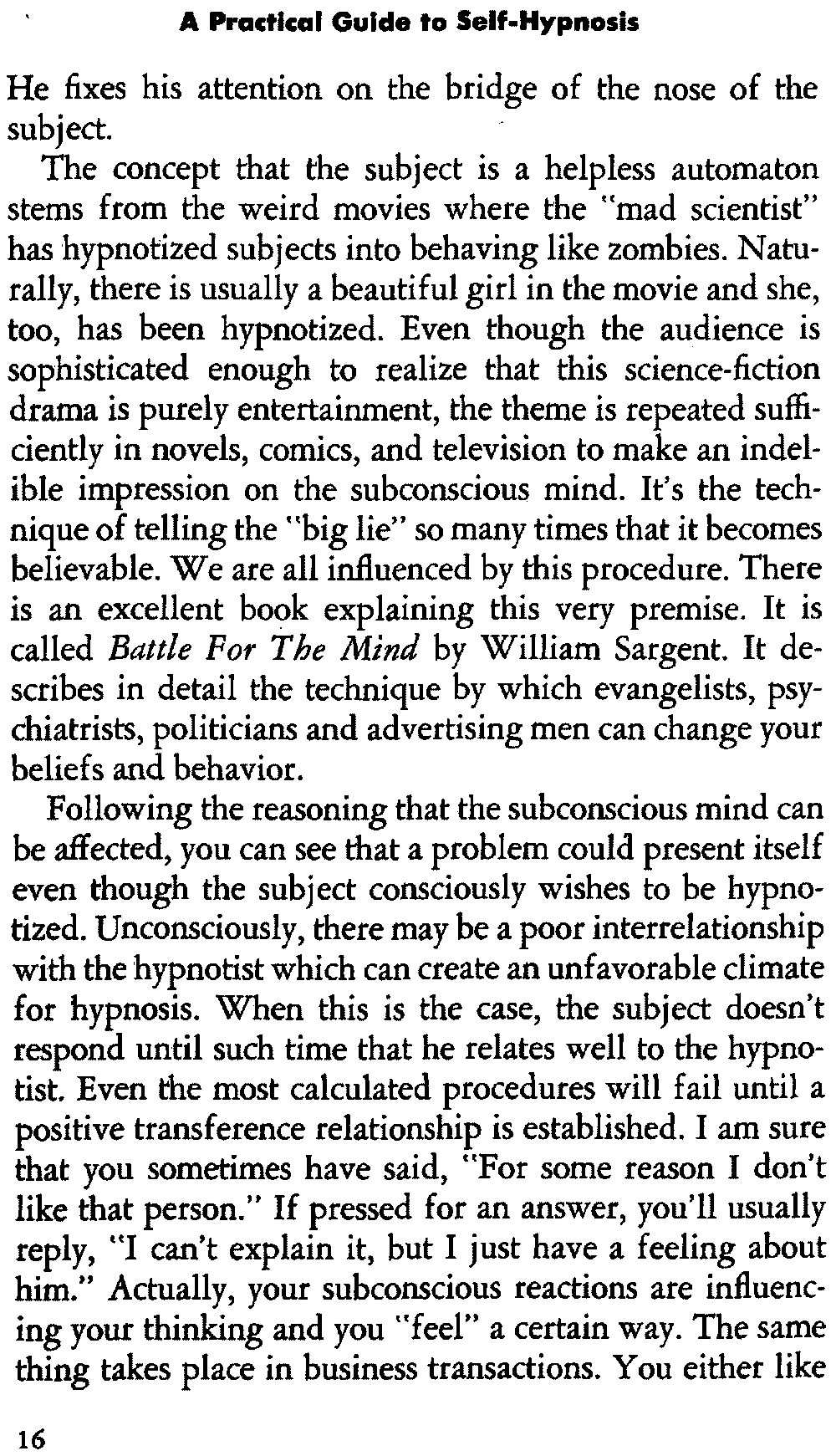 The concept that the subject is a helpless automaton stems from the weird movies where the "mad scientist" has hypnotized subjects into behaving like zombies. Naturally, there is usually a beautiful girl in the movie and she, too, has been hypnotized. Even though the audience is sophisticated enough to realize that this science-fiction drama is purely entertainment, the theme is repeated sufficiently in novels, comics, and television to make an indelible impression on the subconscious mind. It's the technique of telling the "big lie" so many times that it becomes believable. We are all influenced by this procedure. There is an excellent book explaining this very premise. It is called Battle For The Mind by William Sargent. It describes in detail the technique by which evangelists, psychiatrists, politicians and advertising men can change your beliefs and behavior.