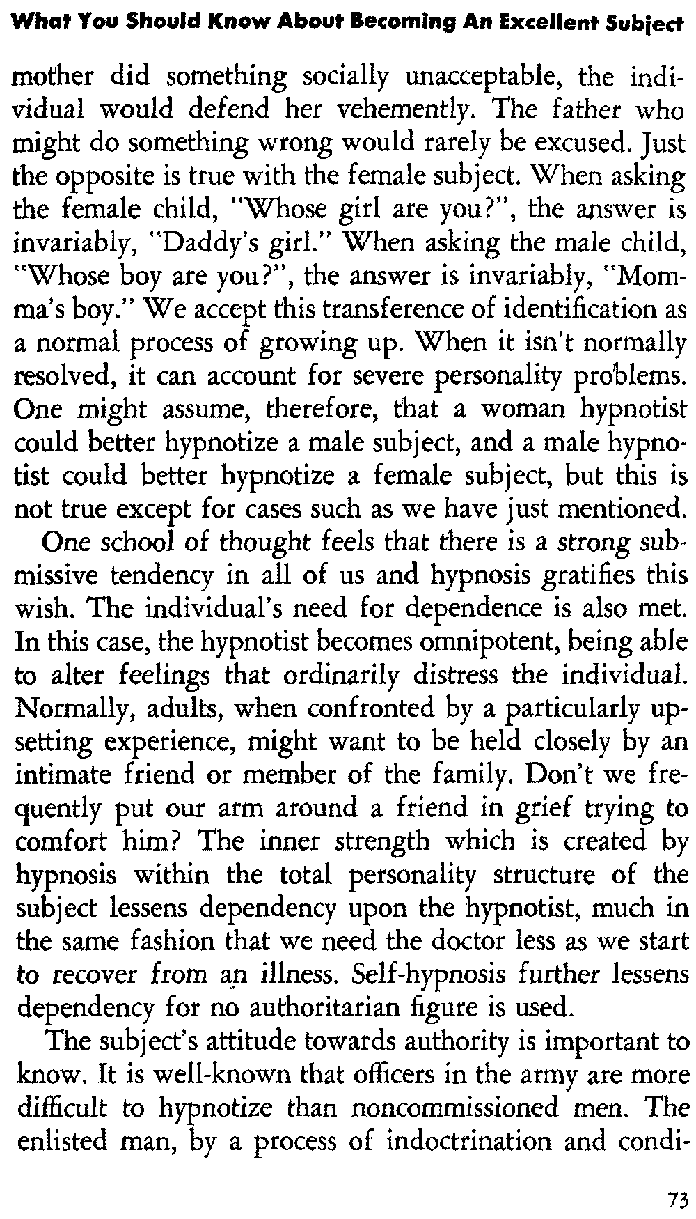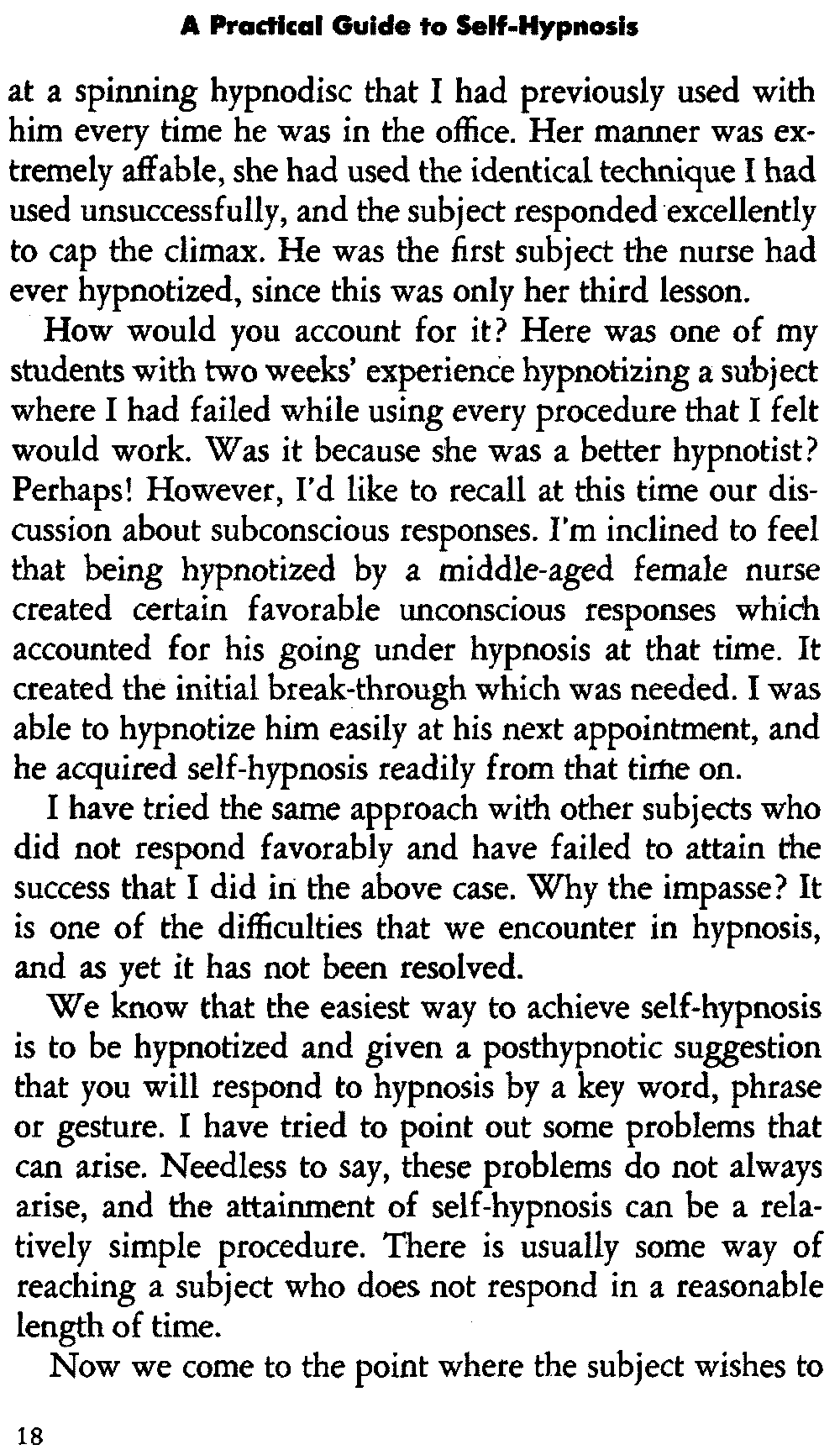 How would you account for it? Here was one of my students with two weeks' experience hypnotizing a subject where I had failed while using every procedure that I felt would work. Was it because she was a better hypnotist? Perhaps! However, I'd like to recall at this time our discussion about subconscious responses. I'm inclined to feel that being hypnotized by a middle-aged female nurse created certain favorable unconscious responses which accounted for his going under hypnosis at that time. It created the initial break-through which was needed. I was able to hypnotize him easily at his next appointment, and he acquired self-hypnosis readily from that time on.
