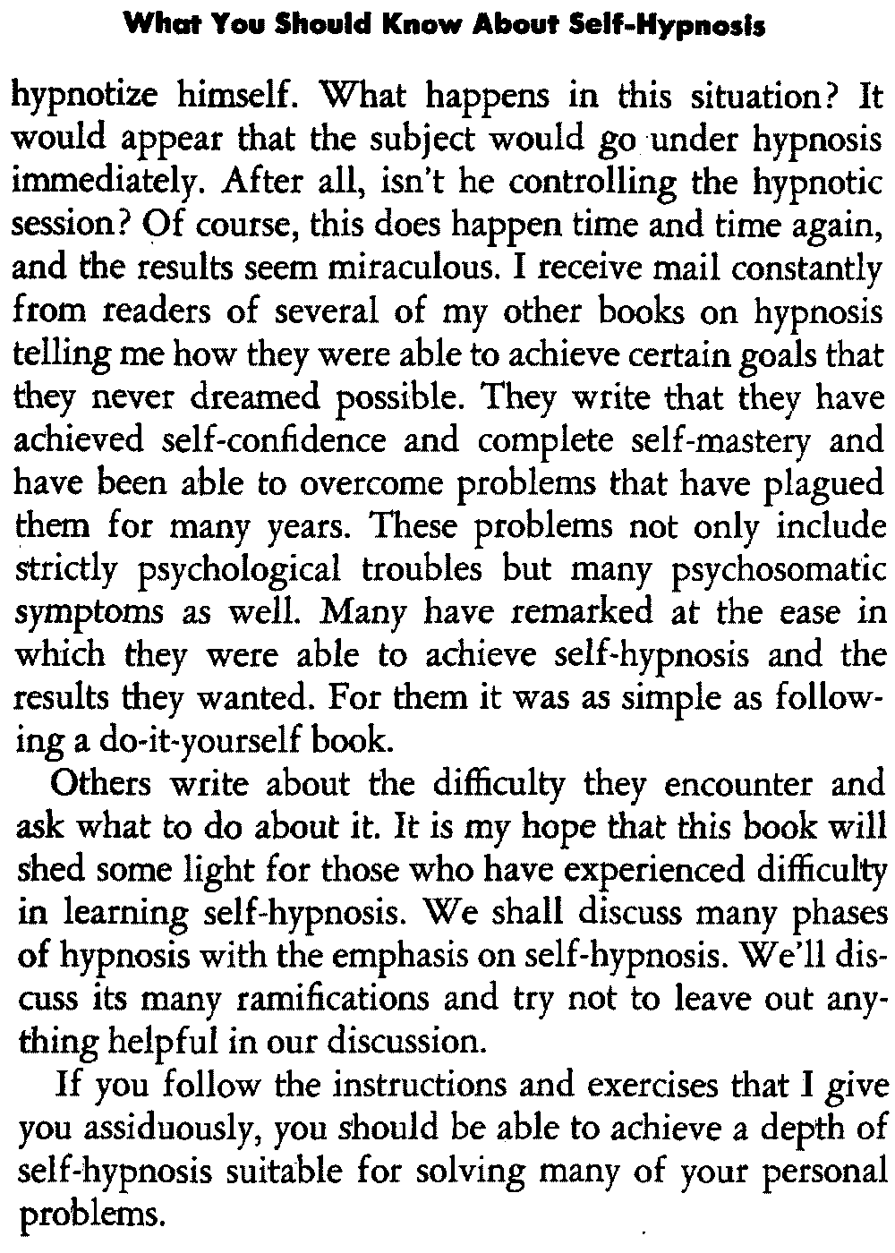 Others write about the difficulty they encounter and ask what to do about it. It is my hope that this book will shed some light for those who have experienced difficulty in learning self-hypnosis. We shall discuss many phases of hypnosis with the emphasis on self-hypnosis. We'll discuss its many ramifications and try not to leave out anything helpful in our discussion.