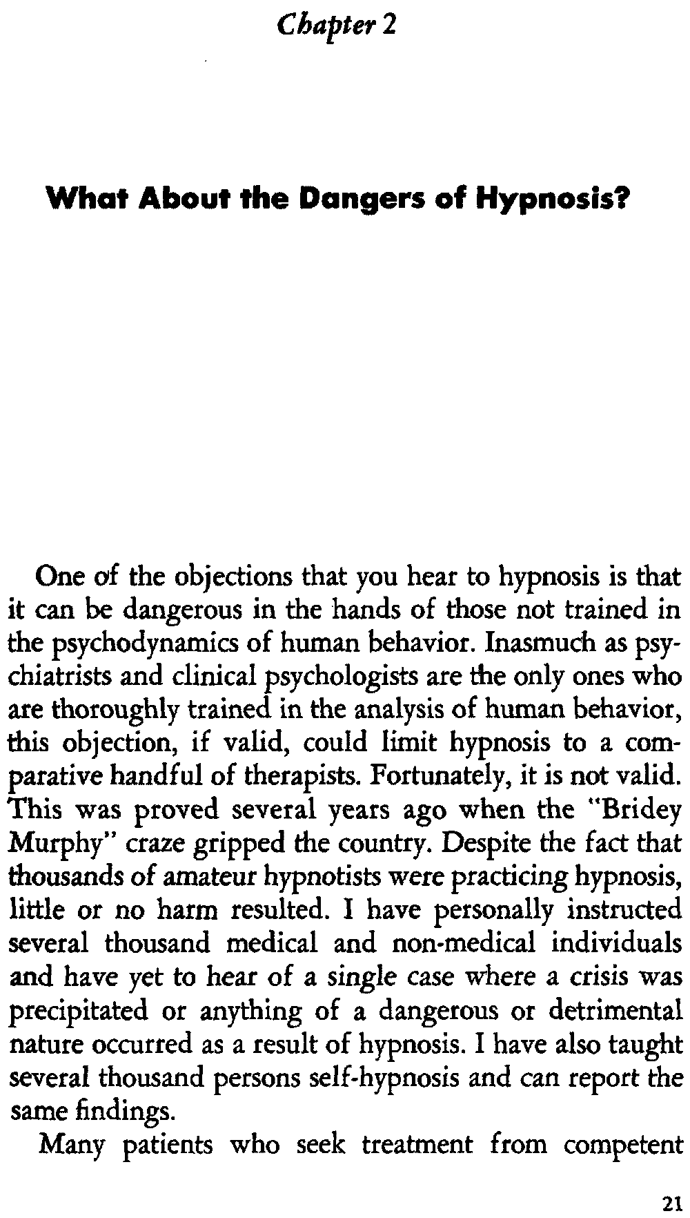 One of the objections that you hear to hypnosis is that it can be dangerous in the hands of those not trained in the psychodynamics of human behavior. Inasmuch as psychiatrists and clinical psychologists are the only ones who are thoroughly trained in the analysis of human behavior, this objection, if valid, could limit hypnosis to a comparative handful of therapists. Fortunately, it is not valid. This was proved several years ago when the "Bridey Murphy" craze gripped the country. Despite the fact that thousands of amateur hypnotists were practicing hypnosis, little or no harm resulted. I have personally instructed several thousand medical and non-medical individuals and have yet to hear of a single case where a crisis was precipitated or anything of a dangerous or detrimental nature occurred as a result of hypnosis. I have also taught several thousand persons self-hypnosis and can report the same findings.