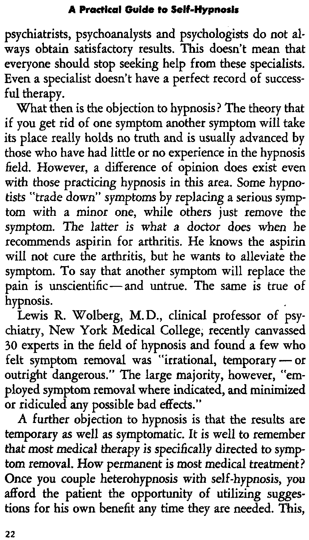 Lewis R. Wolberg, M.D., clinical professor of psychiatry, New York Medical College, recently canvassed 30 experts in the field of hypnosis and found a few who felt symptom removal was "irrational, temporary—or outright dangerous." The large majority, however, "employed symptom removal where indicated, and minimized or ridiculed any possible bad effects."